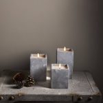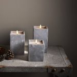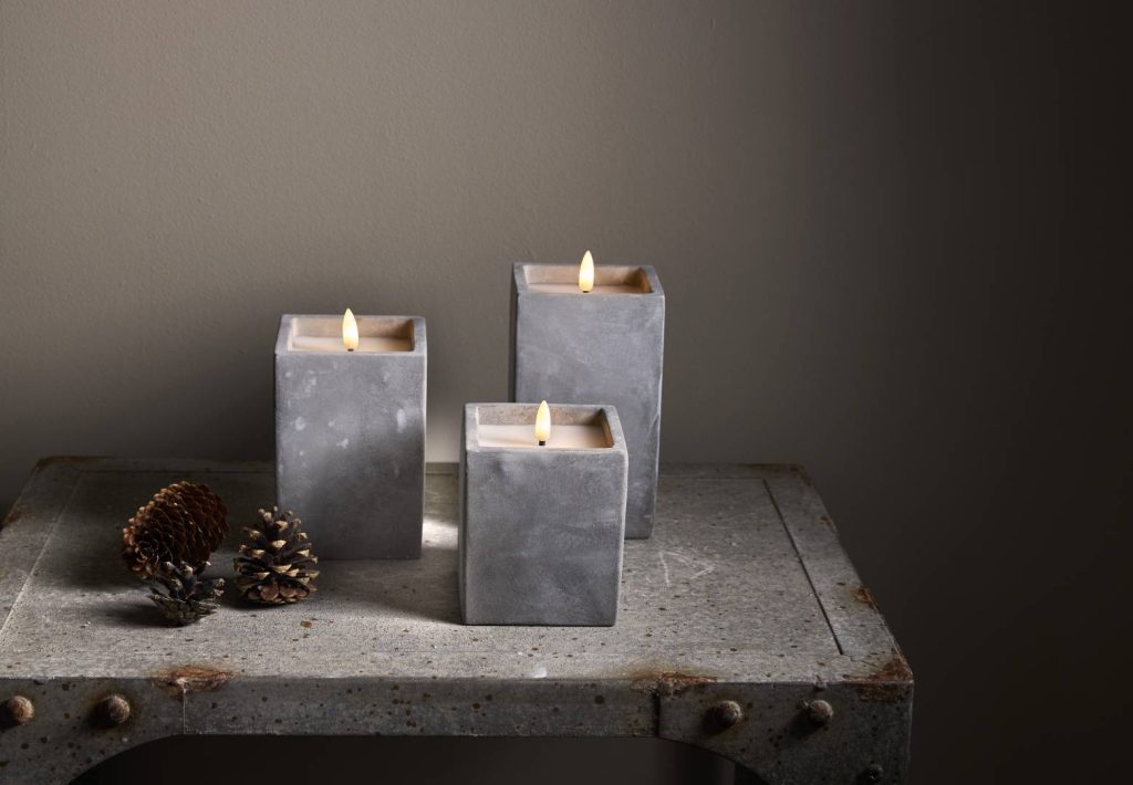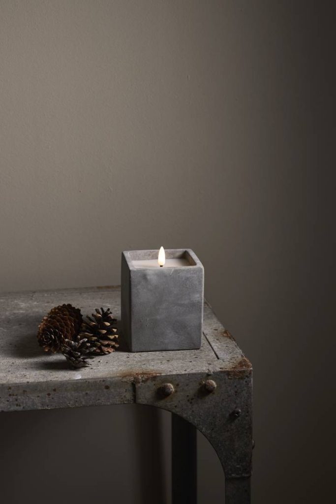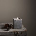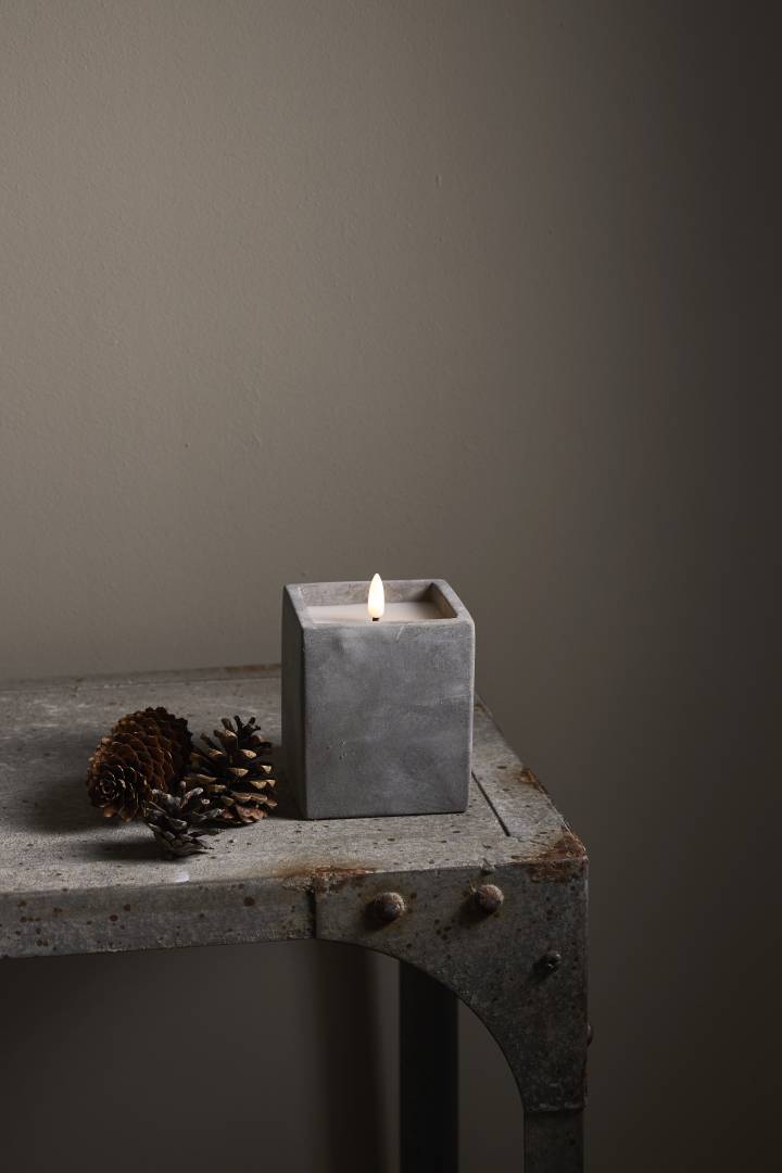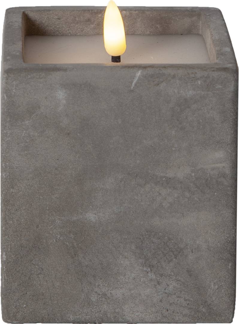 Neliskanttisen Flamme Cem -kynttilän sementistä valmistetun ulkokuoren sisällä on vahakynttilä aitoa muistuttavalla lämpimän valkoisella LED-liekillä. Kynttilä sopii sisäkäyttöön, ja on näyttävä sisustuselementti niin yksinään kuin useamman kynttilän ryhmänä.