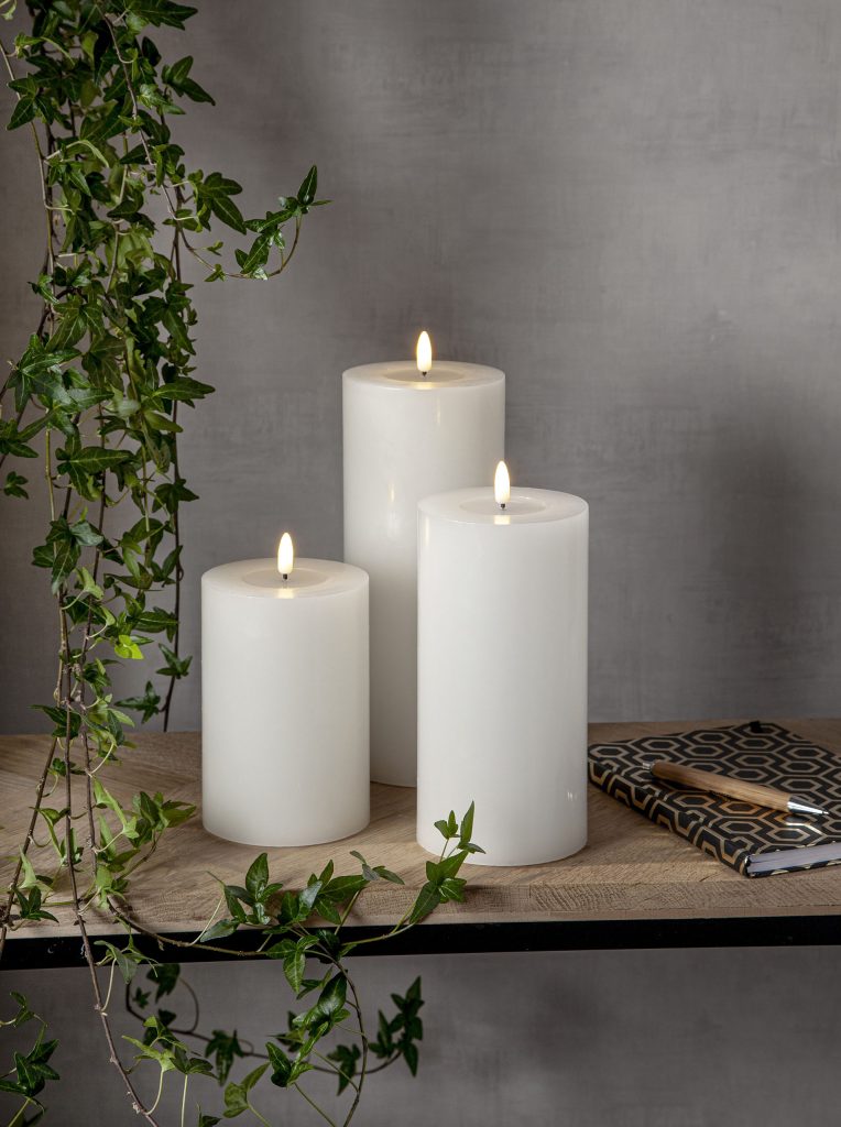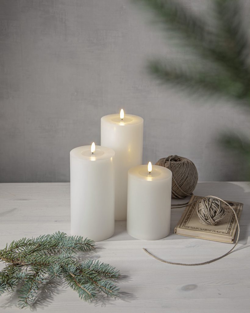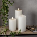 Flamme Flow Big -vahakynttilän aitoa muistuttava lämpimän valkoinen LED-liekki ja kiiltävä, sulalta steariinilta näyttävä syvennys liekin alapuolella saavat sen näyttämään oikealta palavalta kynttilältä.