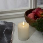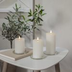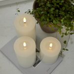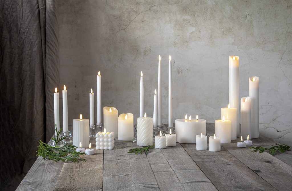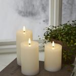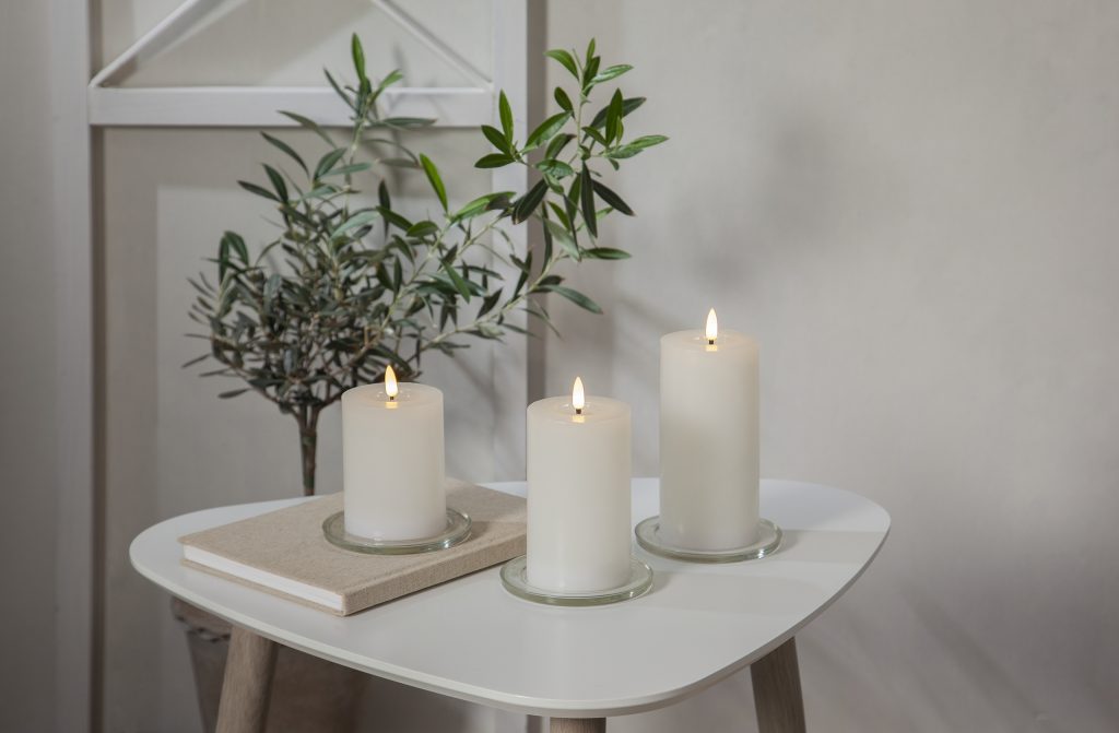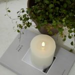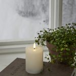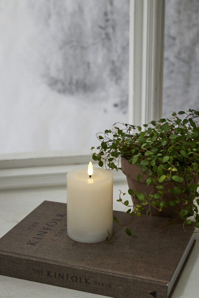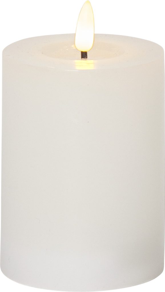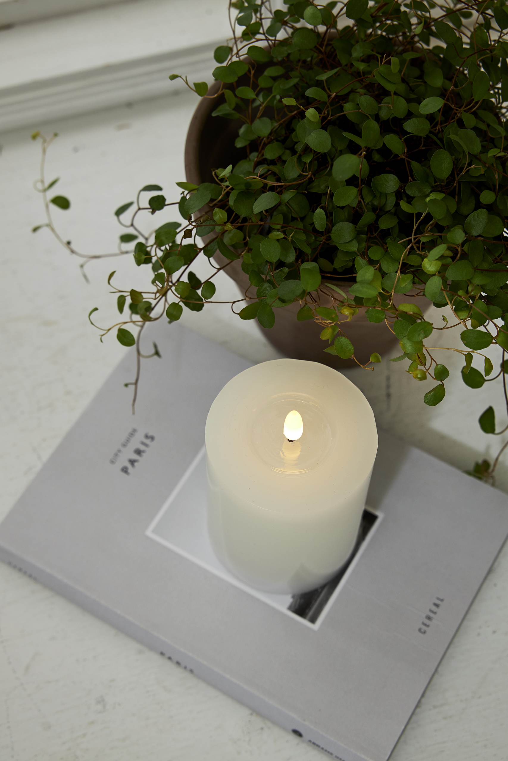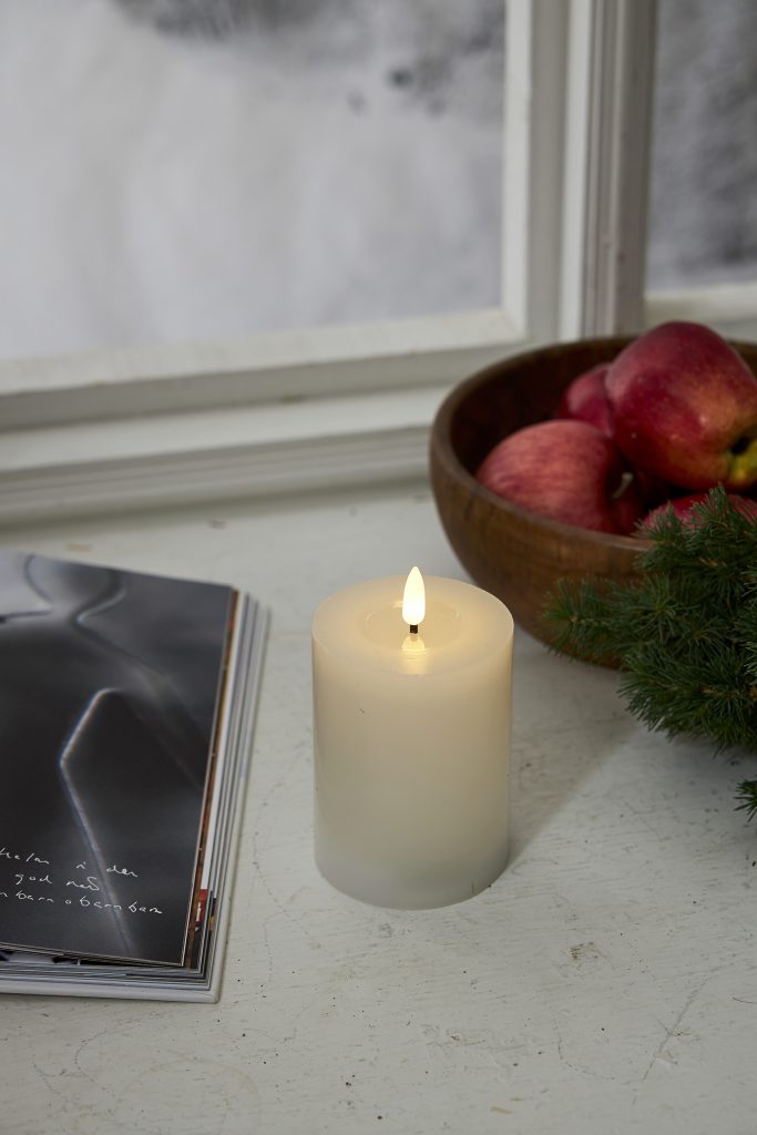 Vahakynttilä, jonka aitoa muistuttava LED-liekki ja kiiltävä, sulalta steariinilta näyttävä syvennys liekin alapuolella saavat sen näyttämään oikealta palavalta kynttilältä.