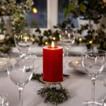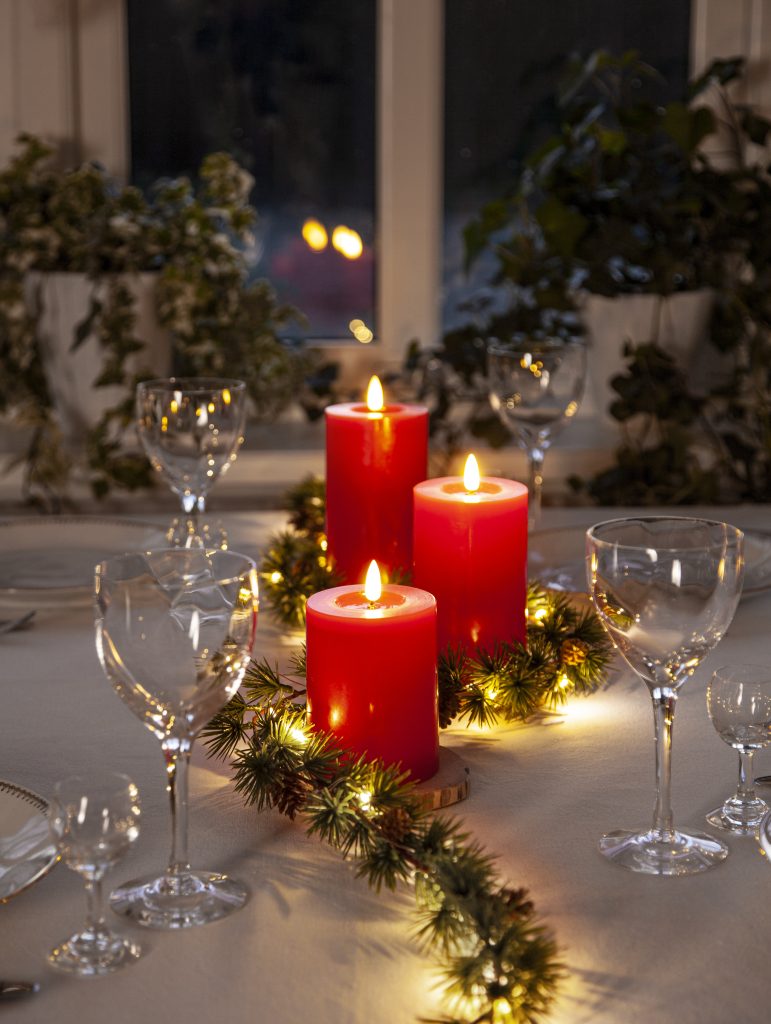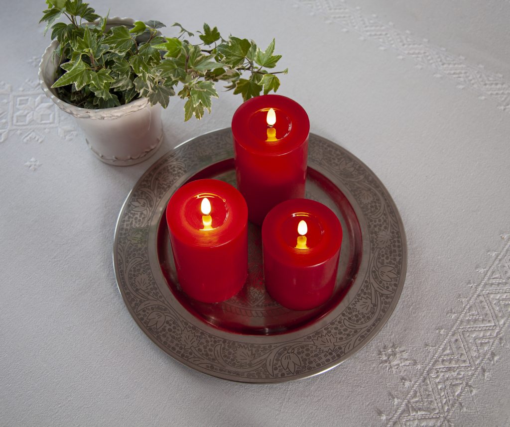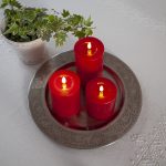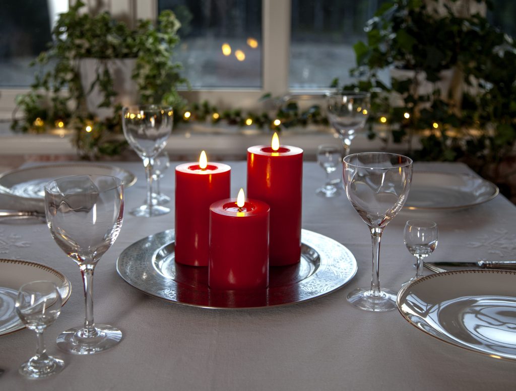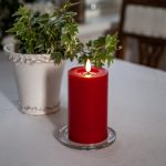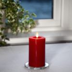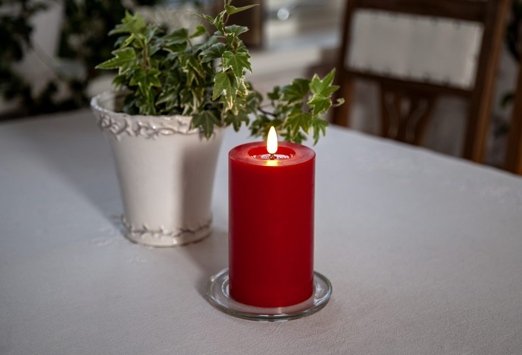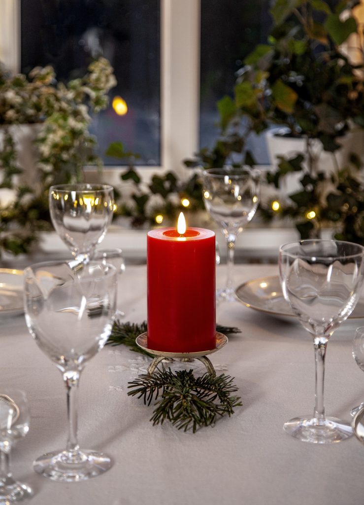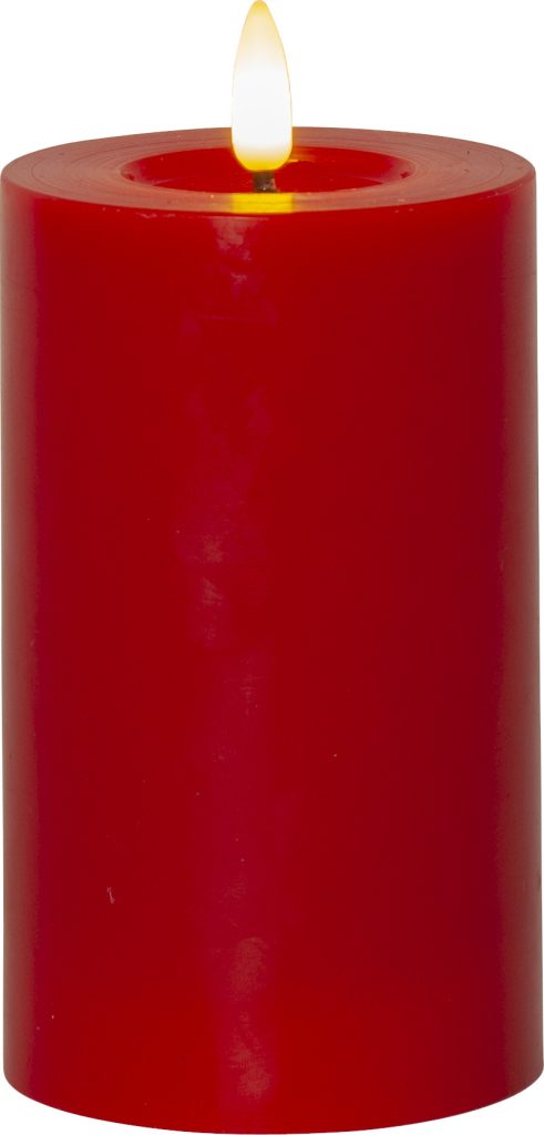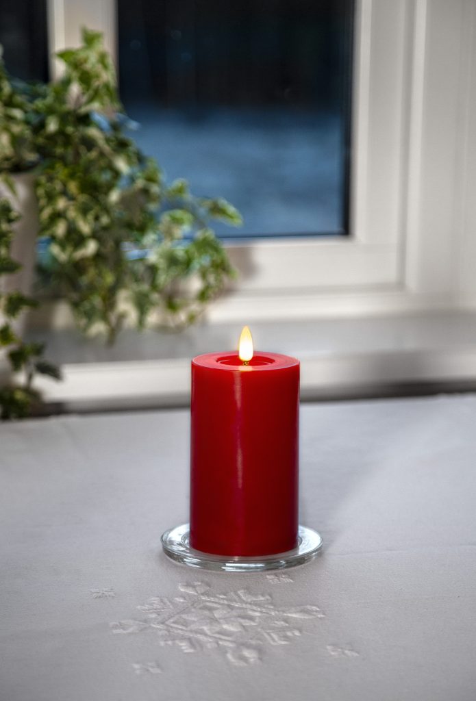 Vahakynttilä, jonka aitoa muistuttava LED-liekki ja kiiltävä, sulalta steariinilta näyttävä syvennys liekin alapuolella saavat sen näyttämään aidolta palavalta kynttilältä.