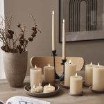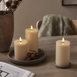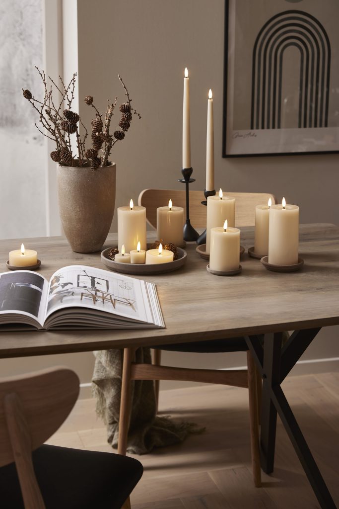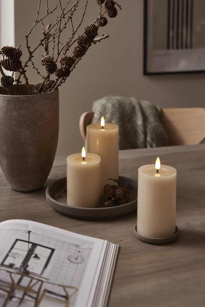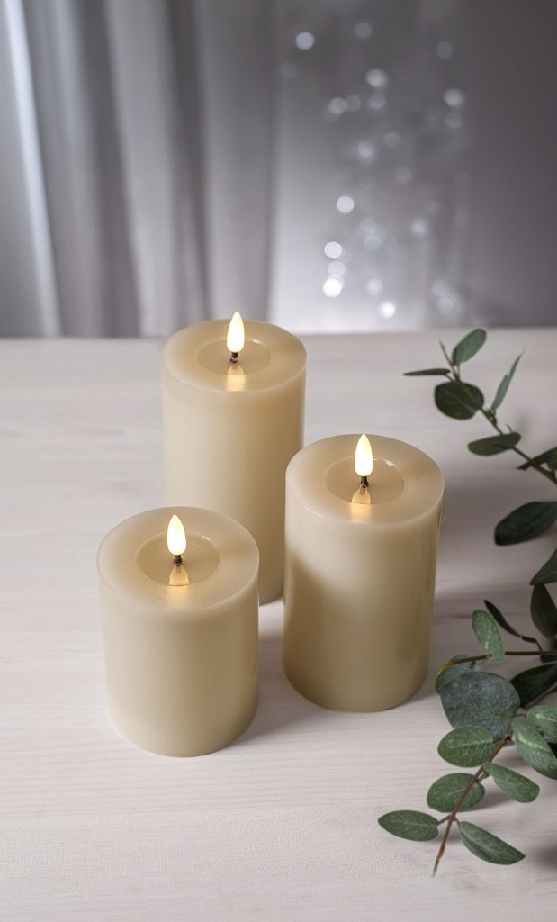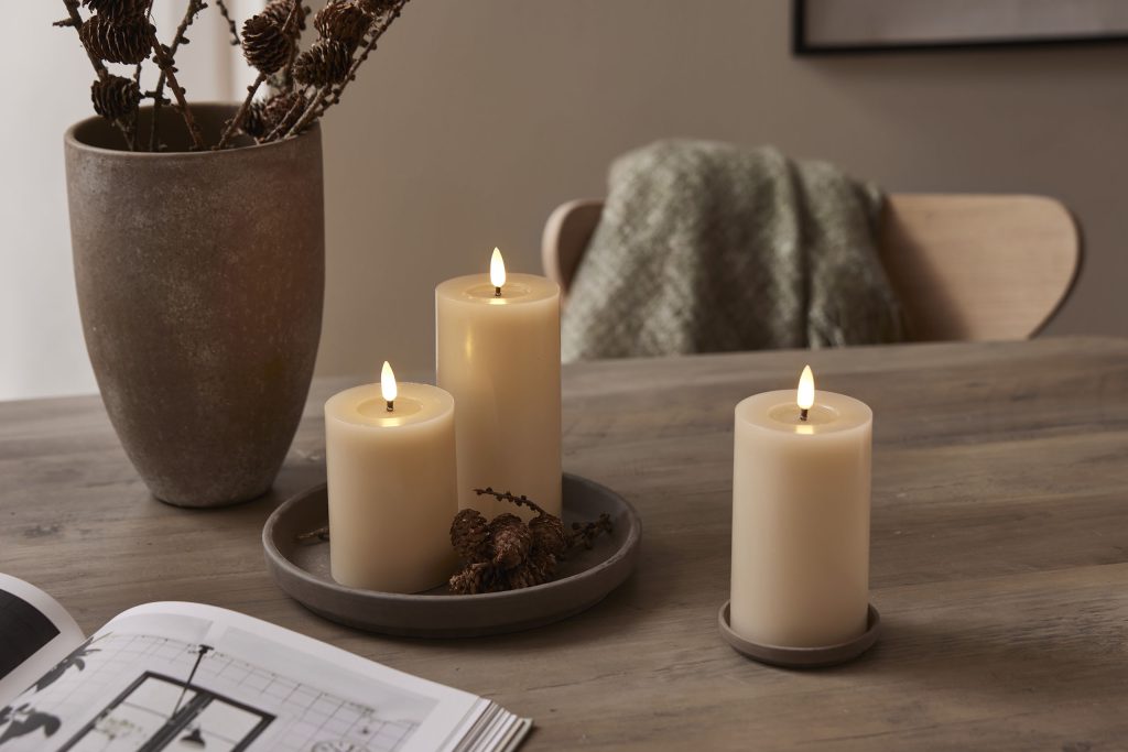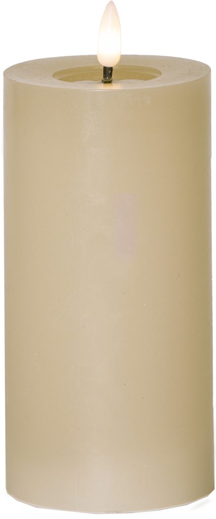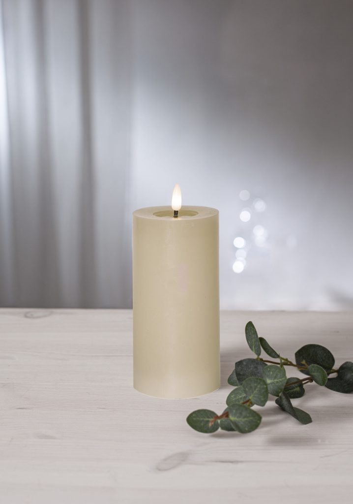 Vahasta valmistetun Flamme Flow kynttilän aitoa muistuttava LED-liekki ja kiiltävä, sulalta steariinilta näyttävä syvennys liekin alapuolella saavat sen näyttämään oikealta palavalta kynttilältä.