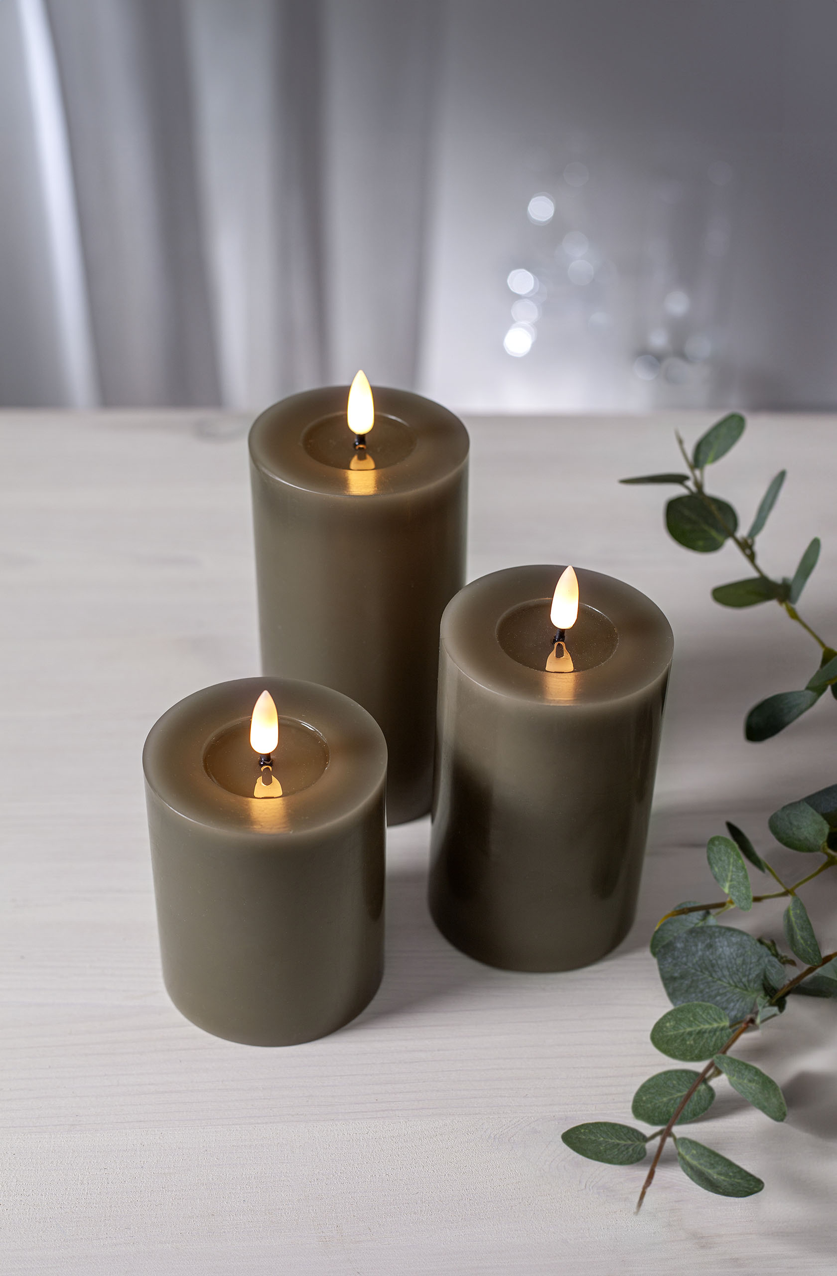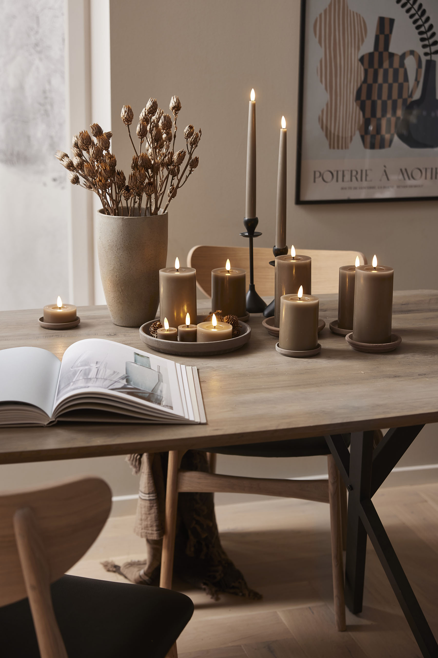 Vahasta valmistetun Flamme Flow kynttilän aitoa muistuttava LED-liekki ja kiiltävä, sulalta steariinilta näyttävä syvennys liekin alapuolella saavat sen näyttämään oikealta palavalta kynttilältä.