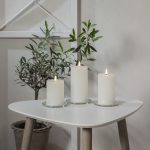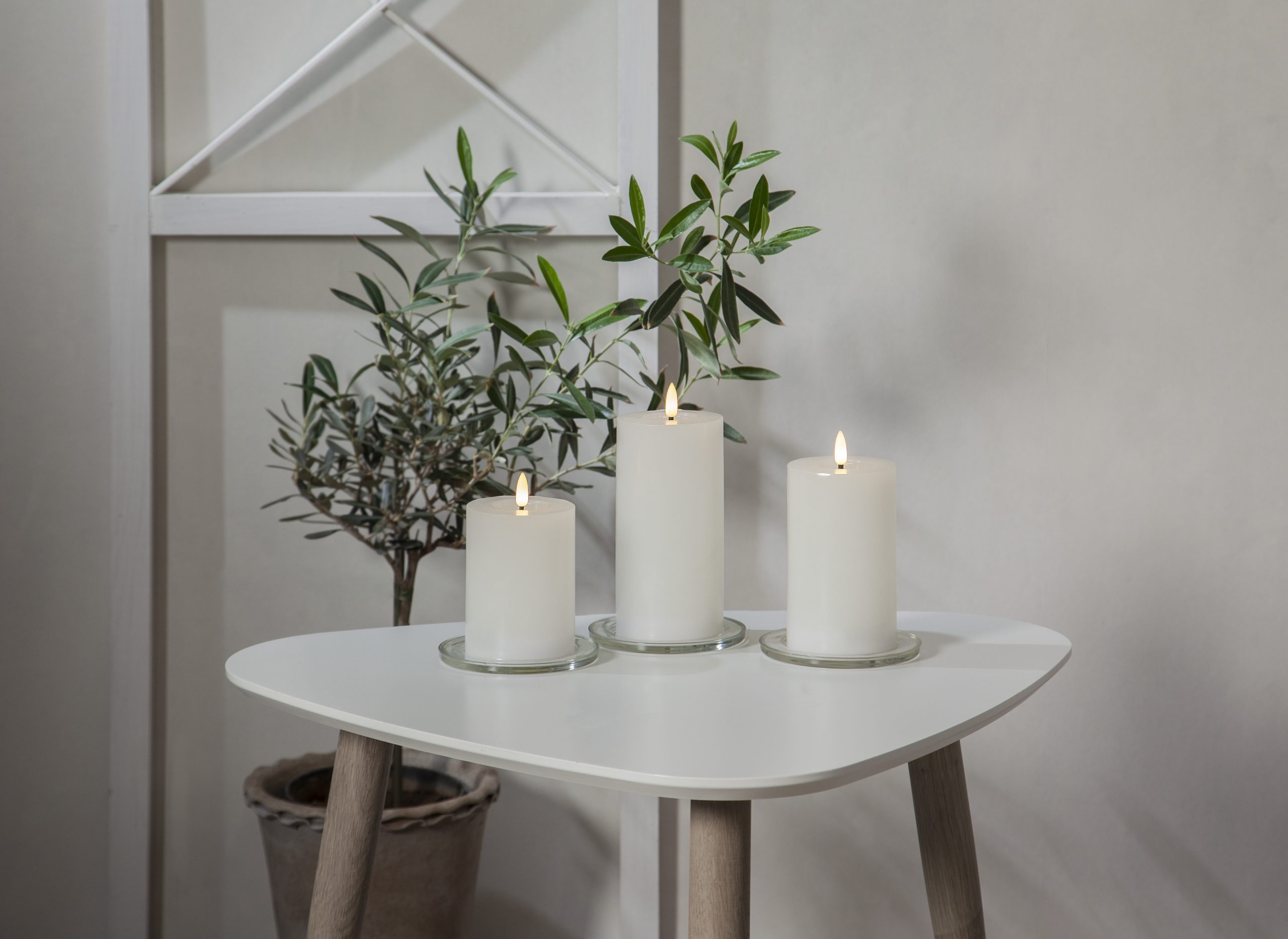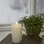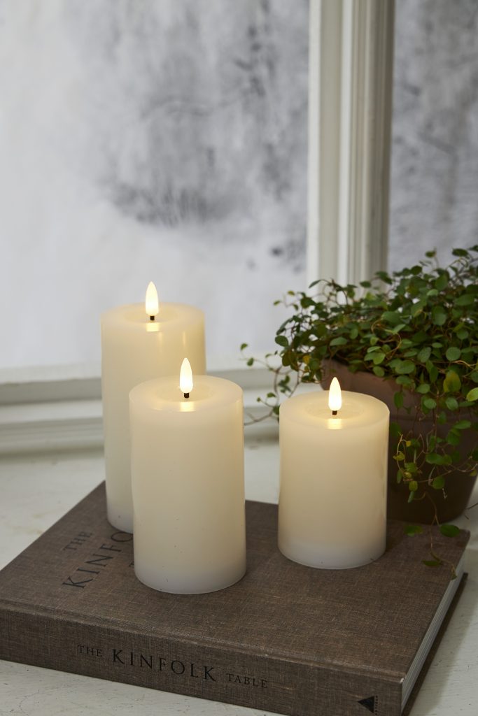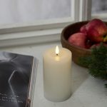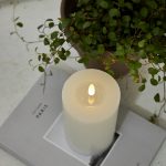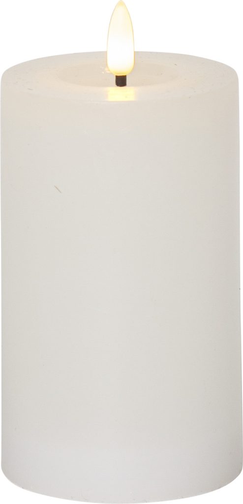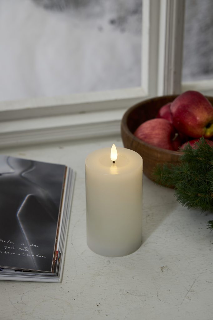 Vahakynttilä, jonka aitoa muistuttava LED-liekki ja kiiltävä, sulalta steariinilta näyttävä syvennys liekin alapuolella saavat sen näyttämään aidolta palavalta kynttilältä.