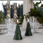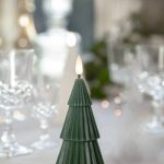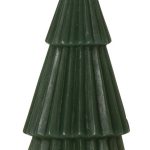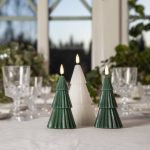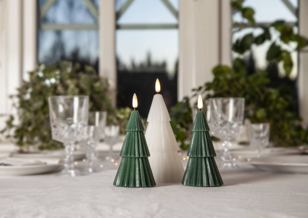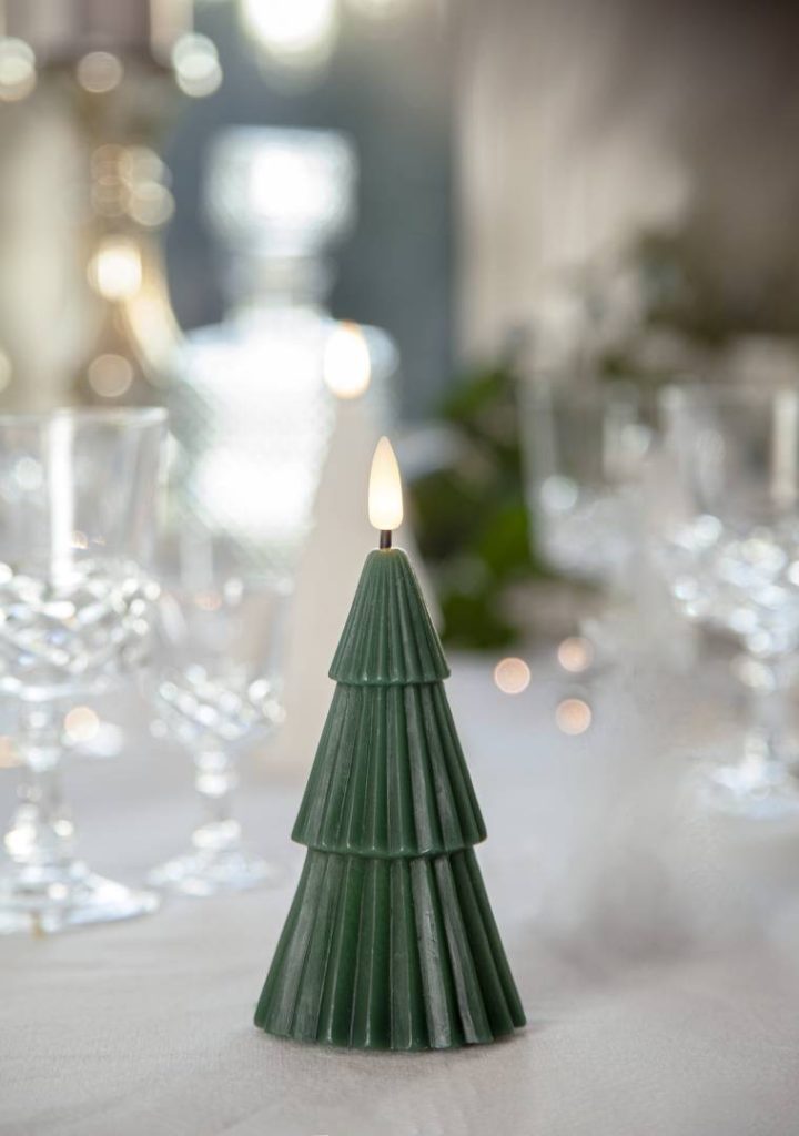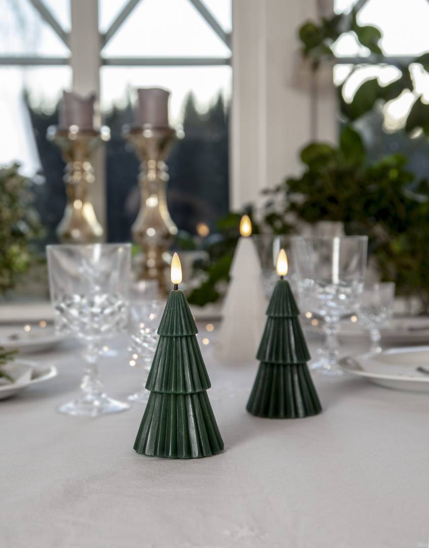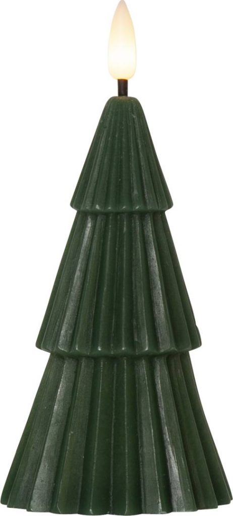 Sisäkäyttöön sopiva vihreä kuusen muotoinen vahakynttilä aidon näköisellä Flamme-liekillä, jossa on lämpimän valkoinen valo.
