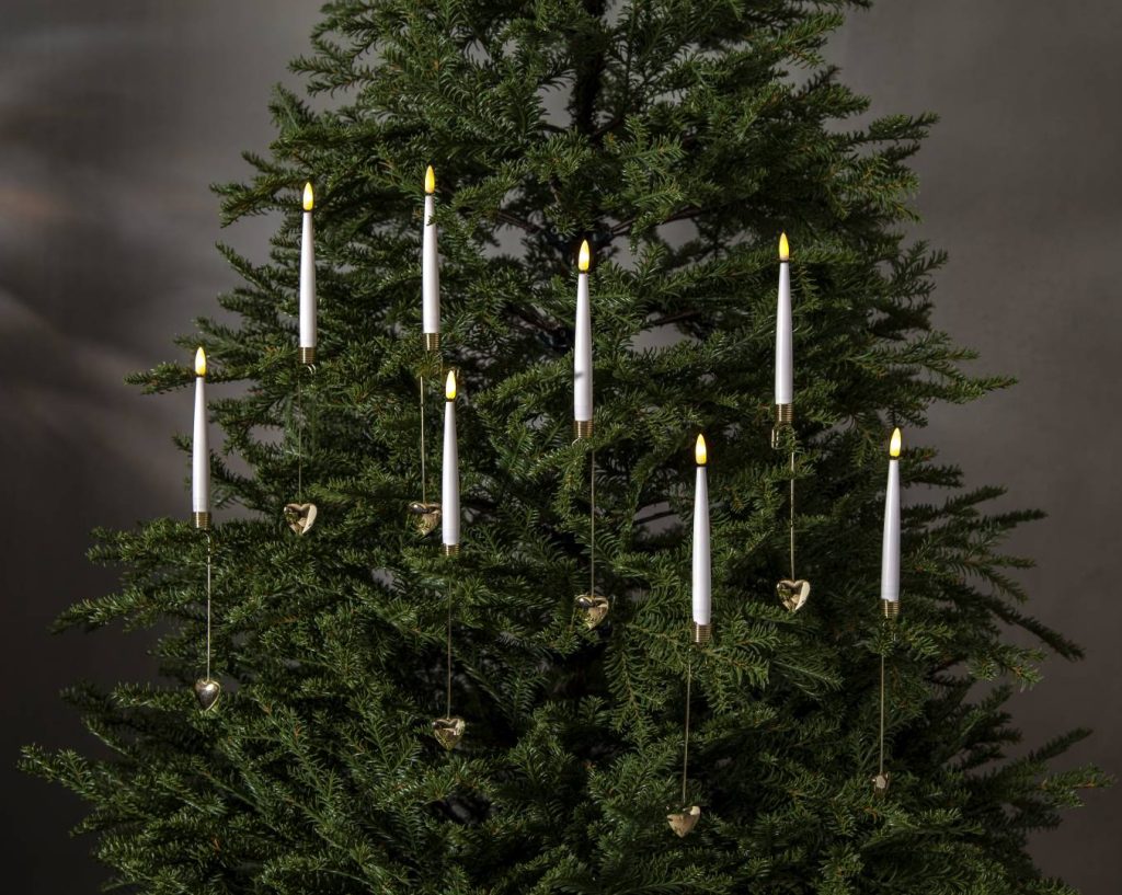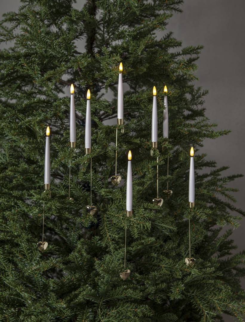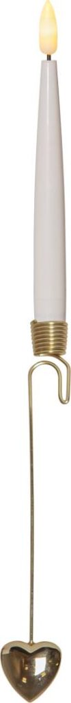 Johdottomat paristokäyttöiset Flamme-kuusenkynttilät sisäkäyttöön. Kynttilät ovat muovia ja pidikkeet kullanväristä metallia sydänkoristein. Pidikkeissä on koukku joulukuuseen asettamista varten. Kynttilöissä on aidon näköinen liekki lämpimän valkoisella valolla.