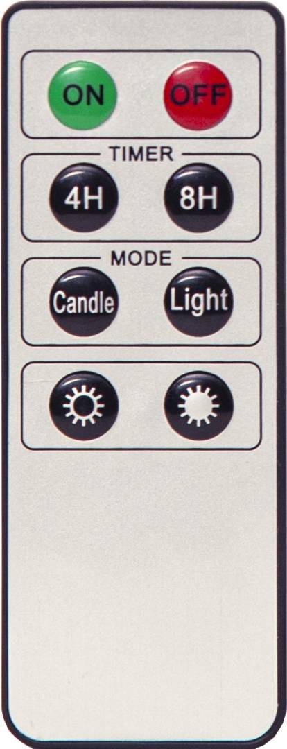 Pakkaus sisältää kauko-ohjaimen, jolla voit sytyttää ja sammuttaa kynttilät, ajastaa ne palamaan joko neljä tai kahdeksan tuntia, himmentää valoja ja valita joko tasaisen tai liekehtivän valon.