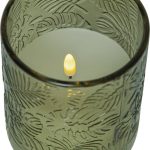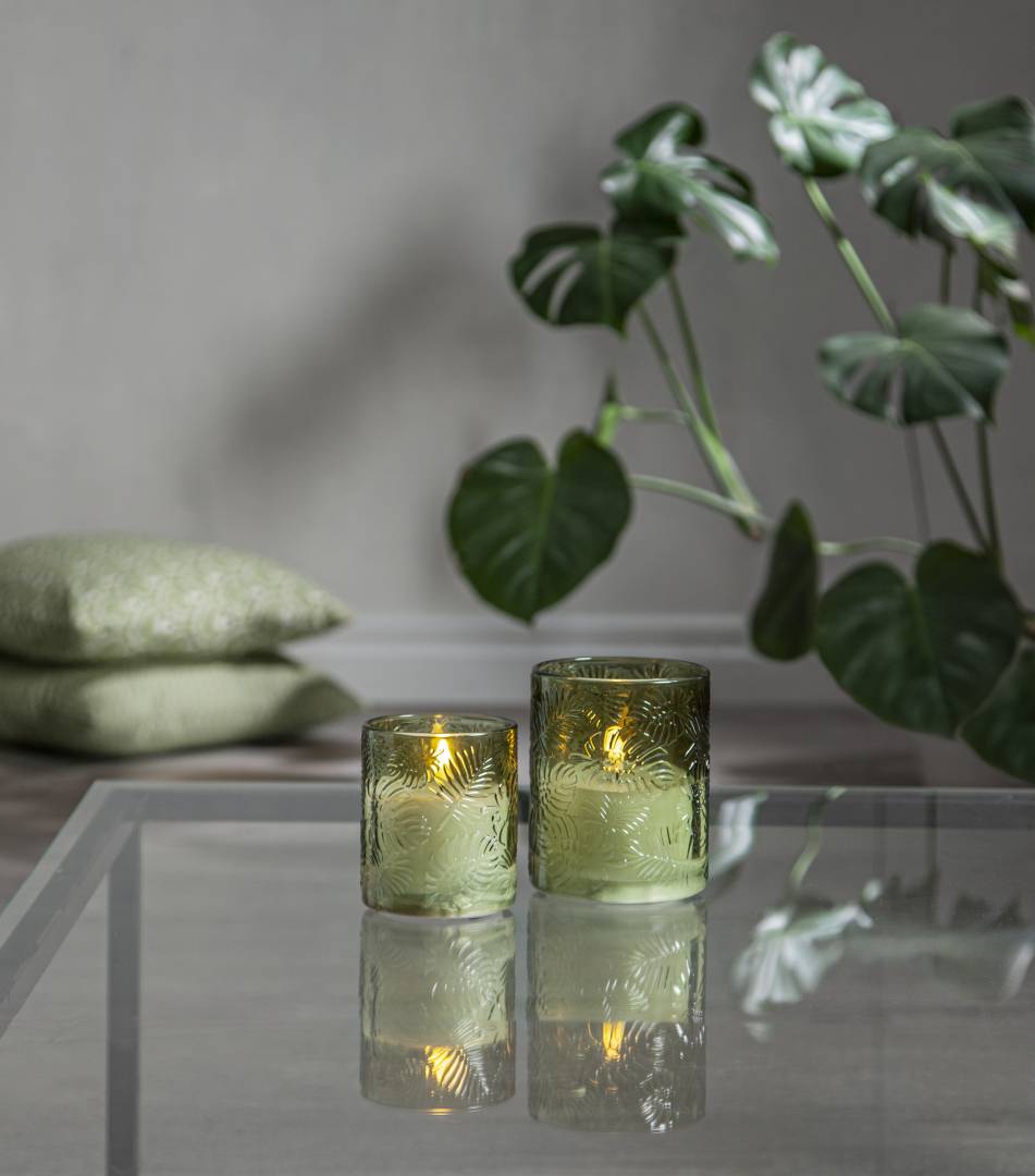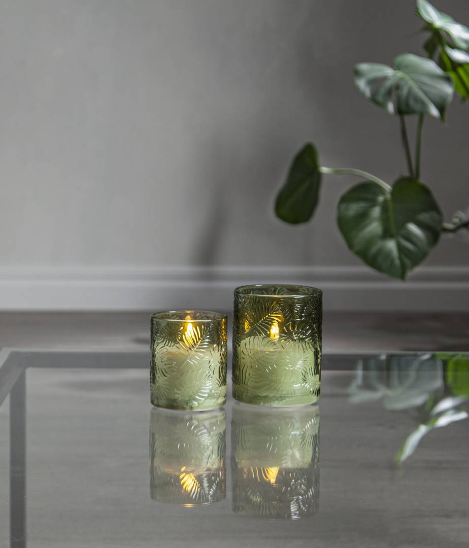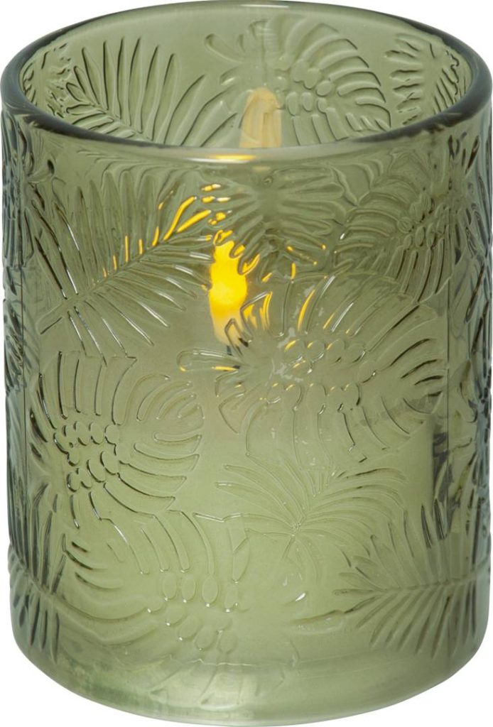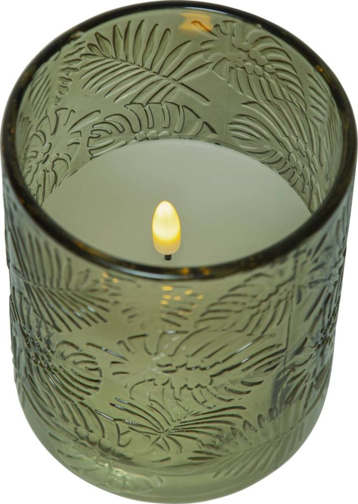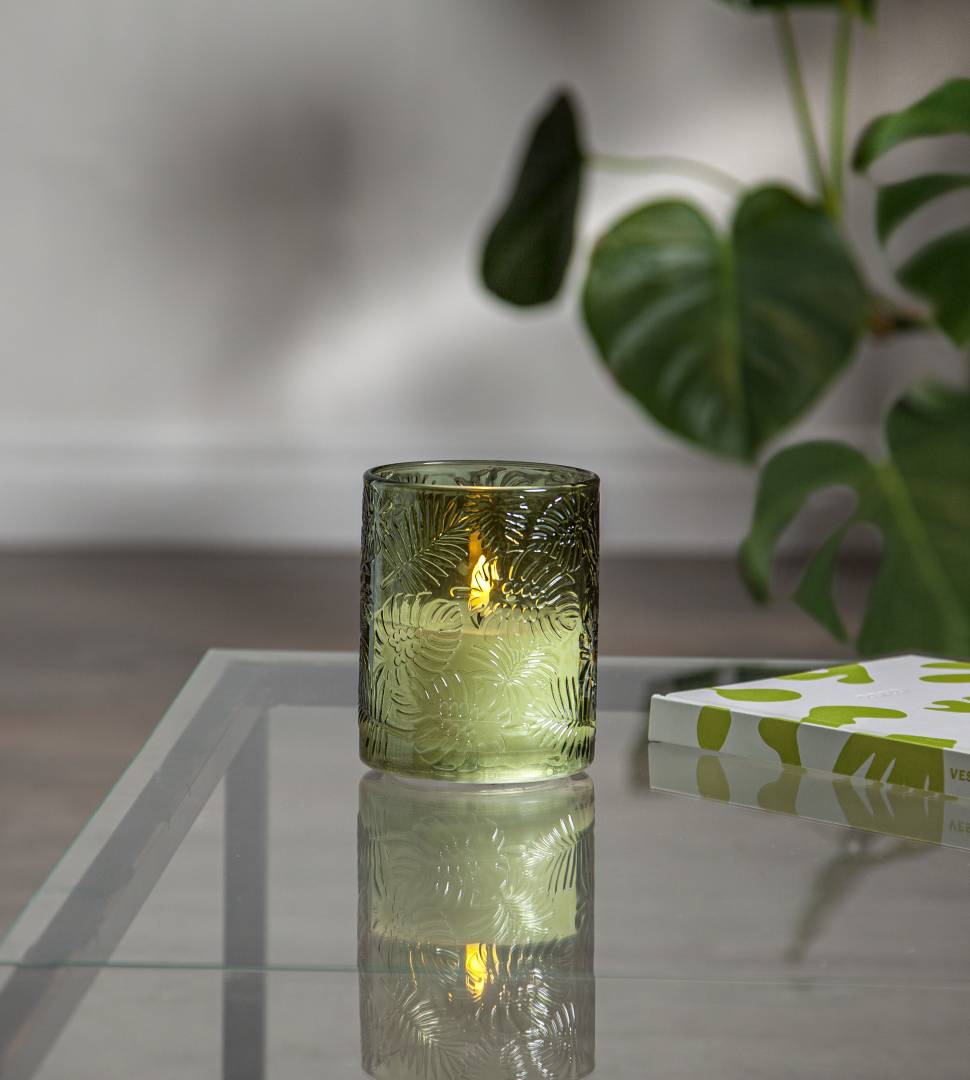 Flamme Leaf on lasista valmistettu paristoilla toimiva lasilyhty, jossa on lehtiaiheinen kohokuviointi ja sisällä valkoinen vahakynttilä. Kynttilässä on kaunis luonnollisen näköinen liekki lämpimän valkoisella valolla.