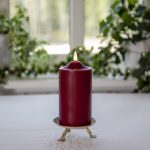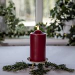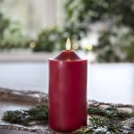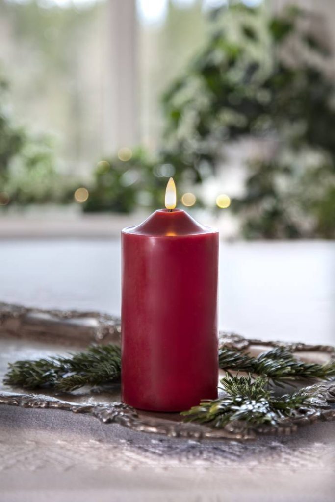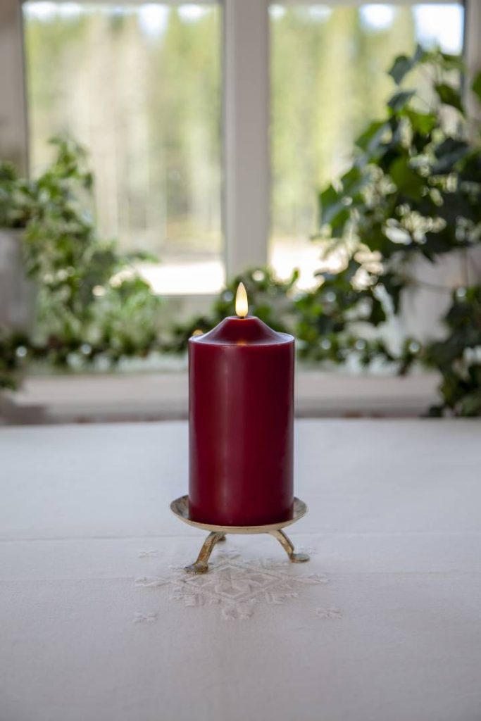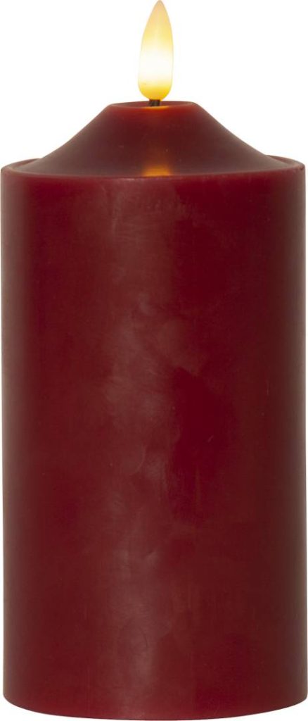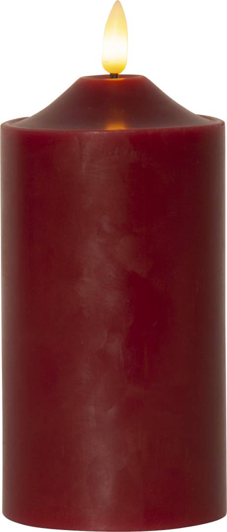 Tummanpunainen sisäkäyttöön sopiva vahakynttilä aitoa muistuttavalla lämpimän valkoisella LED-liekillä.