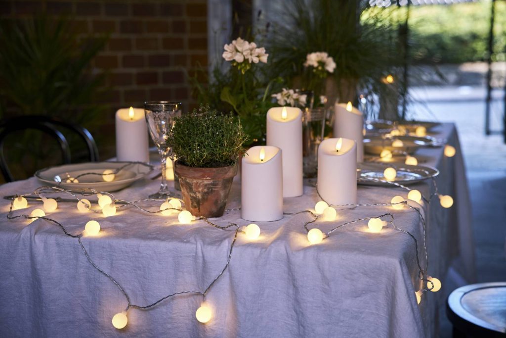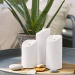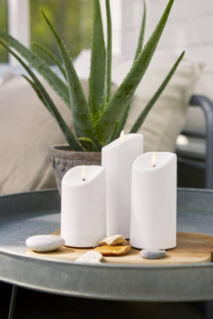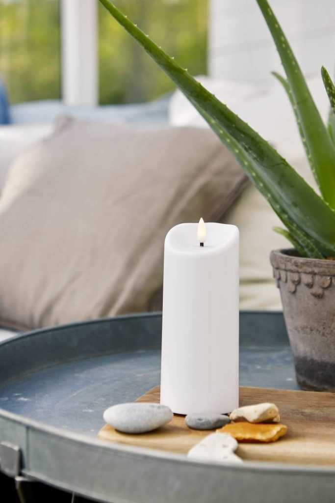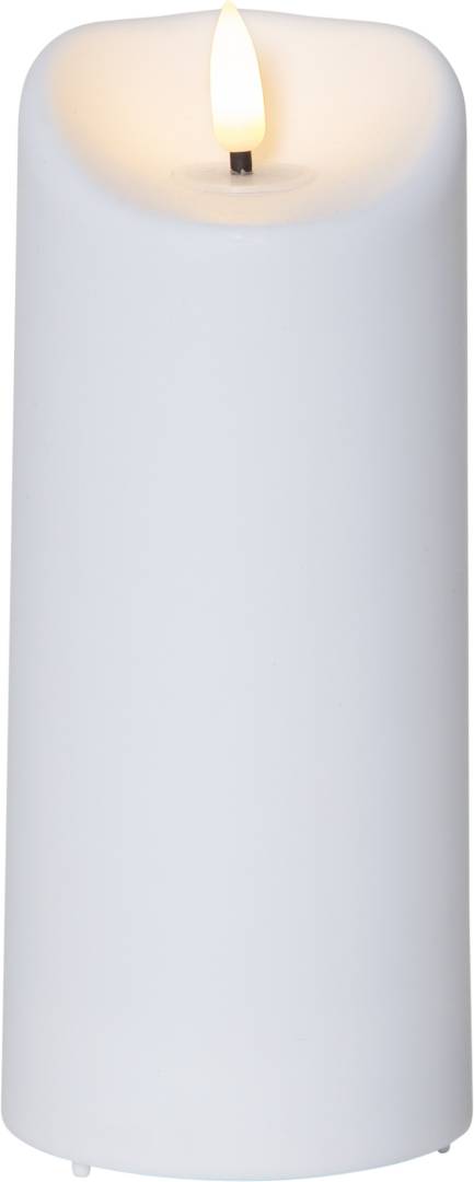 Valkoinen muovista valmistettu LED-kynttilä, joka sopii sekä sisä- että ulkokäyttöön. Kynttilässä on kaunis luonnollisen näköinen liekki lämpimän valkoisella valolla.