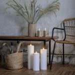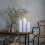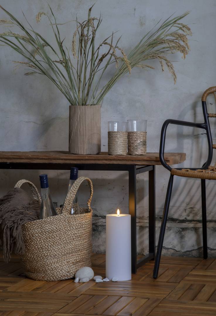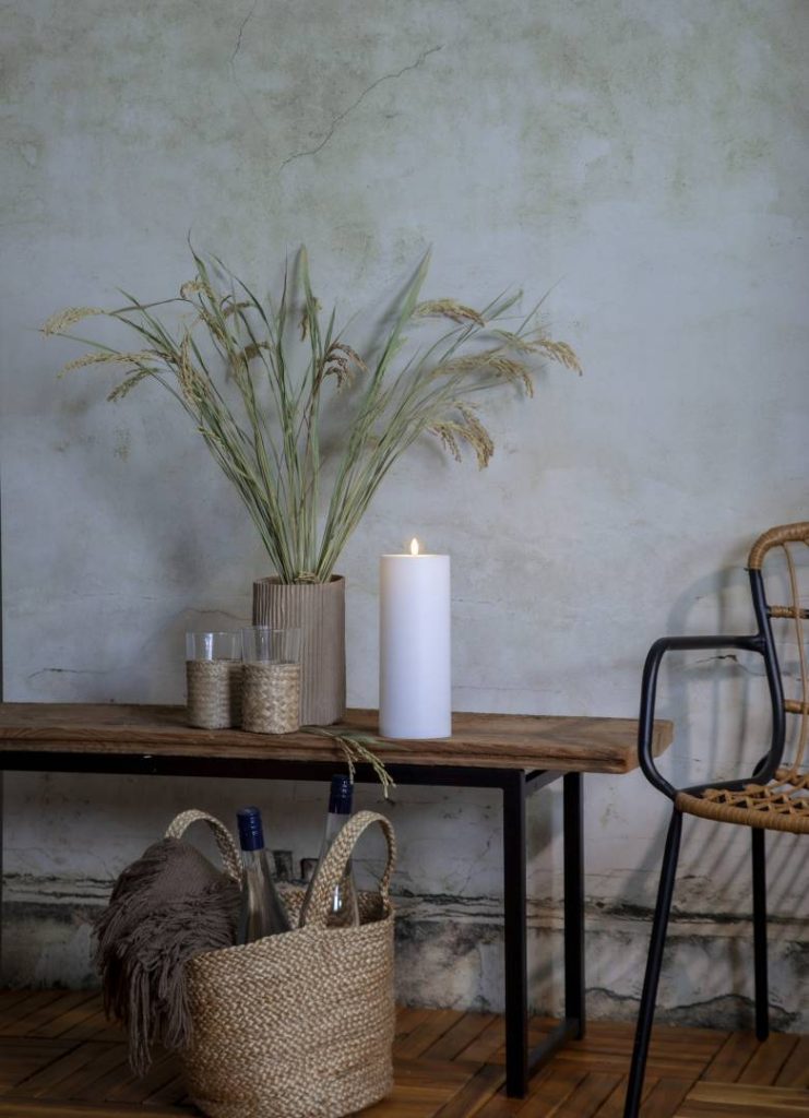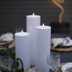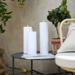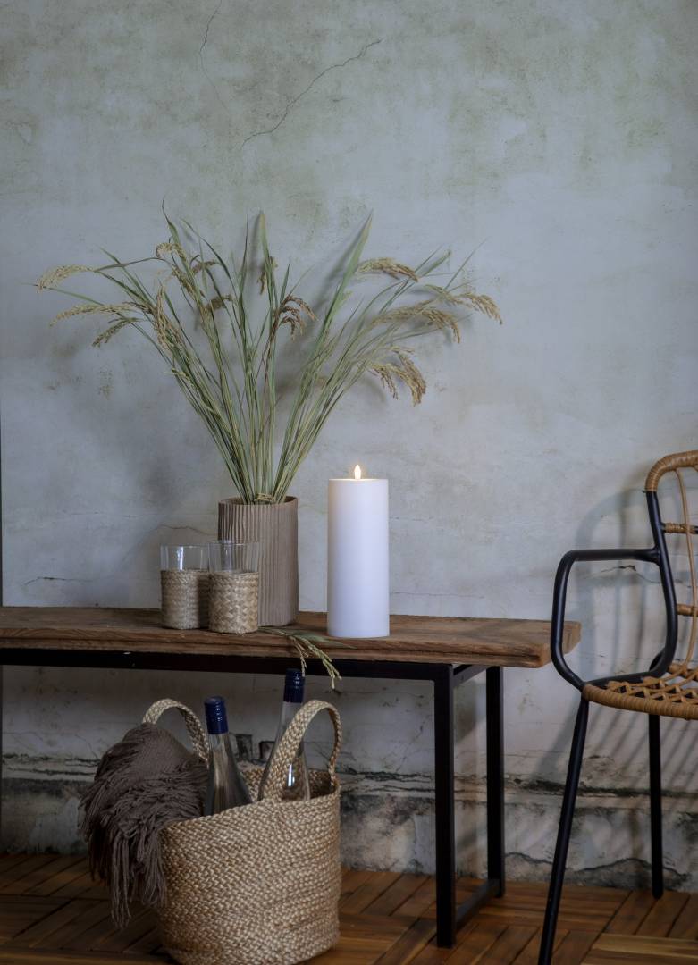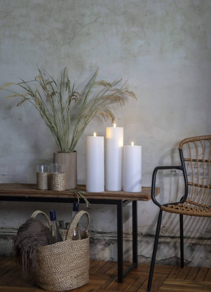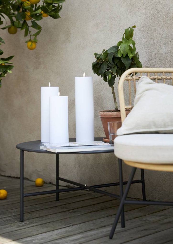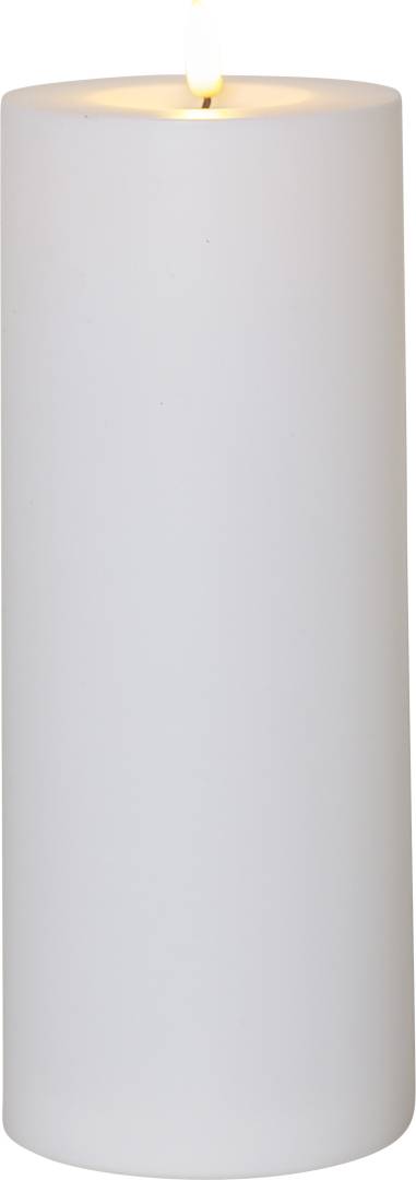 Ulkokäyttöön sopiva, valkoisesta muovista valmistettu kynttilä aidon näköisellä Flamme-liekillä. Kynttilässä on sekä hämäräsensori että ajastin – jos valitsee sensoritoiminnon asennossa ON, kynttilä syttyy automaattisesti hämärän tullen ja sammuu, kun tulee valoisaa. Ajastintoiminnolla kynttilän saa palamaan 6 tunnin ajan kerrallaan ja syttymään seuraavana päivänä samaan aikaan uudelleen.