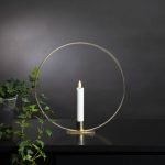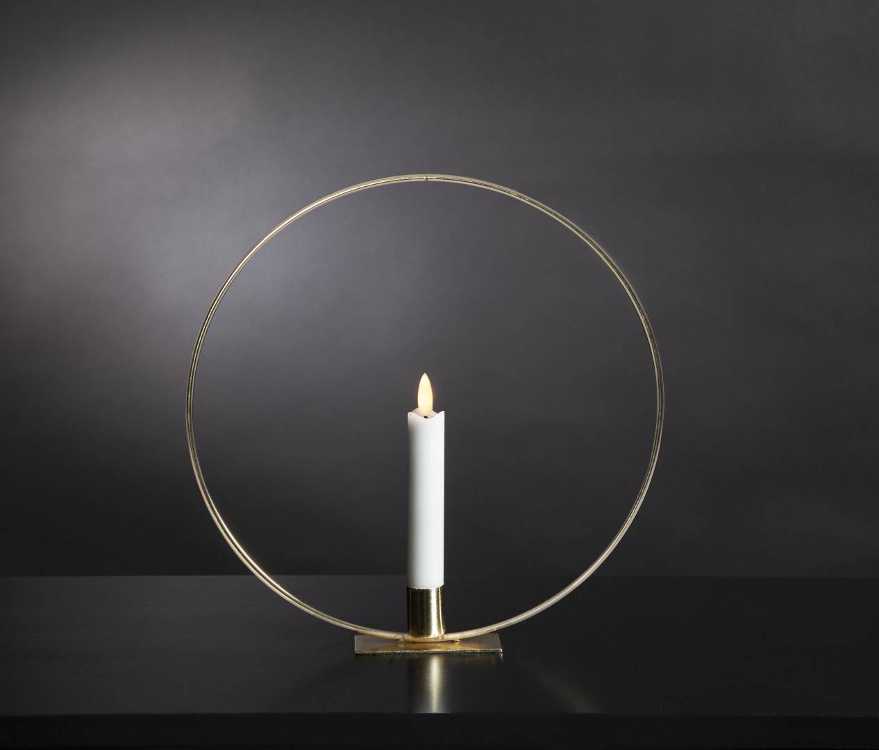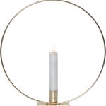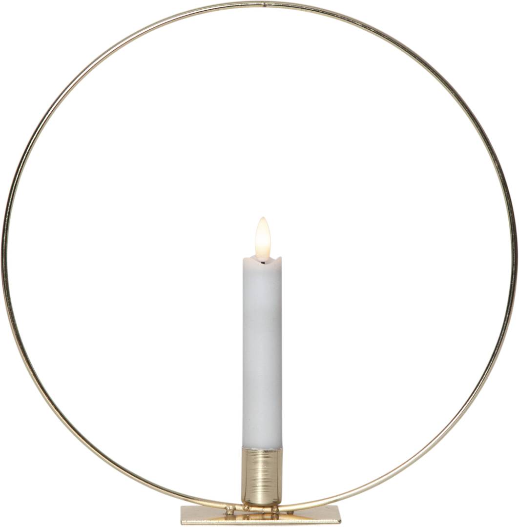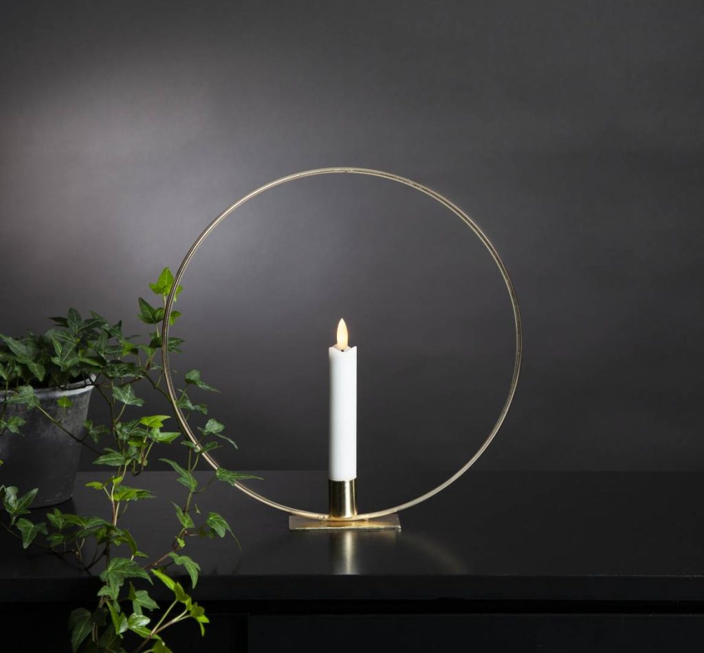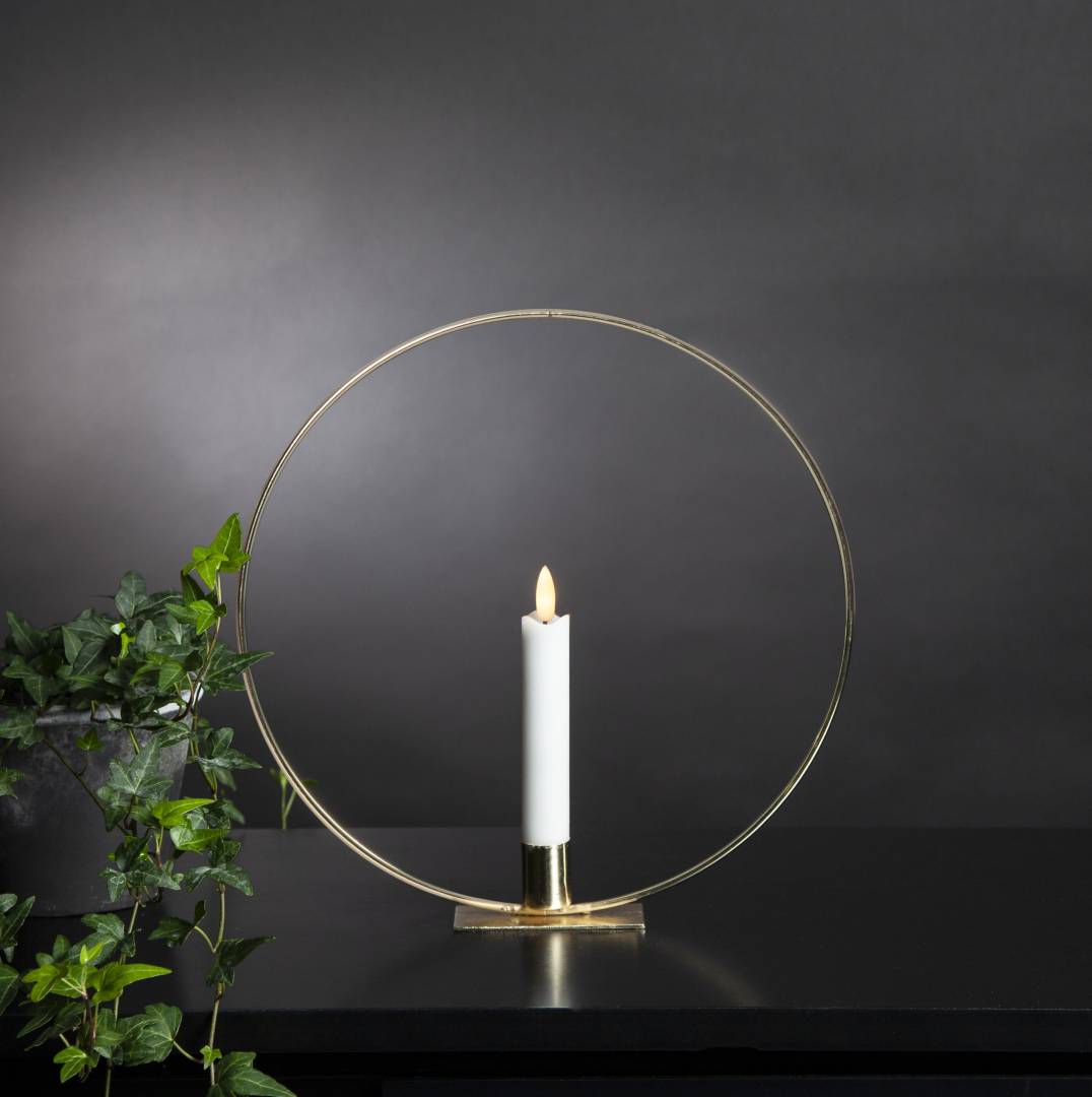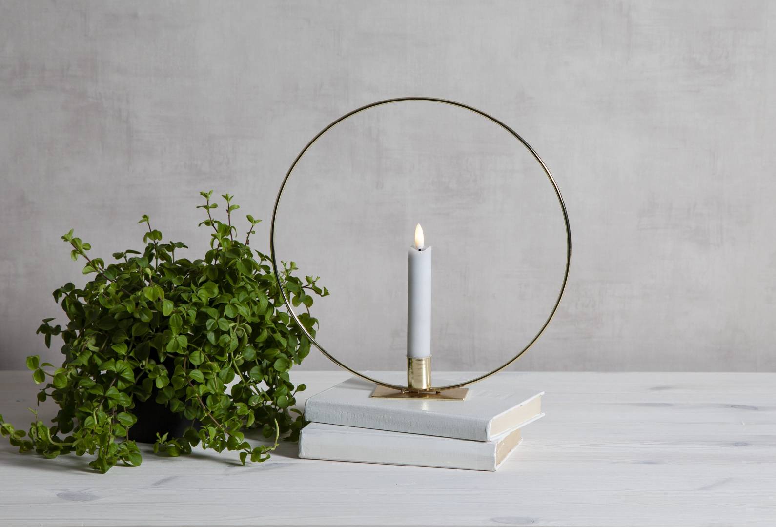28 cm korkea messingin värinen pöytäkoriste, jossa 15 cm korkea Flamme-antiikkikynttilä aidonnäköisellä lämpimän valkoisella liekillä. Kaunis koriste, joka luo tunnelmallista valoa kotiisi.