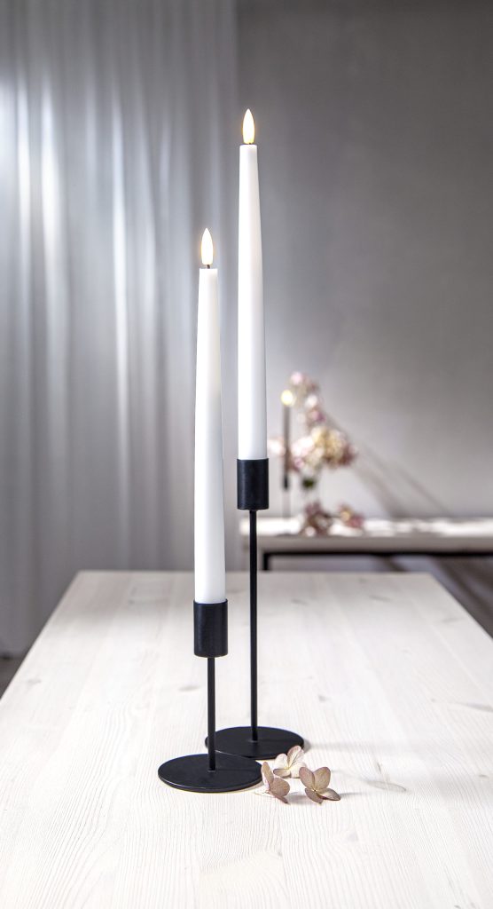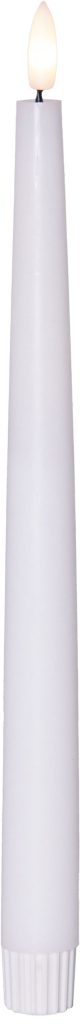 Vahasta ja muovista valmistettu sileäpintainen LED-antiikkikynttilä aidon näköisellä lämpimän valkoisella Flamme-liekillä. Pakkaus sisältää kaksi sisäkäyttöön tarkoitettua kynttilää.