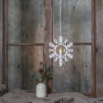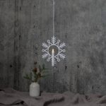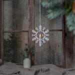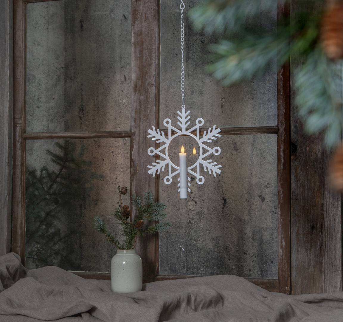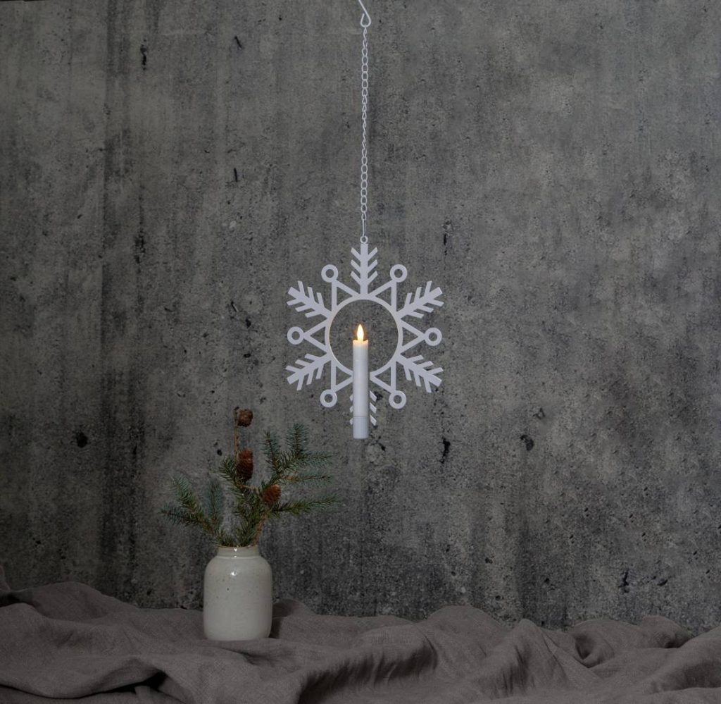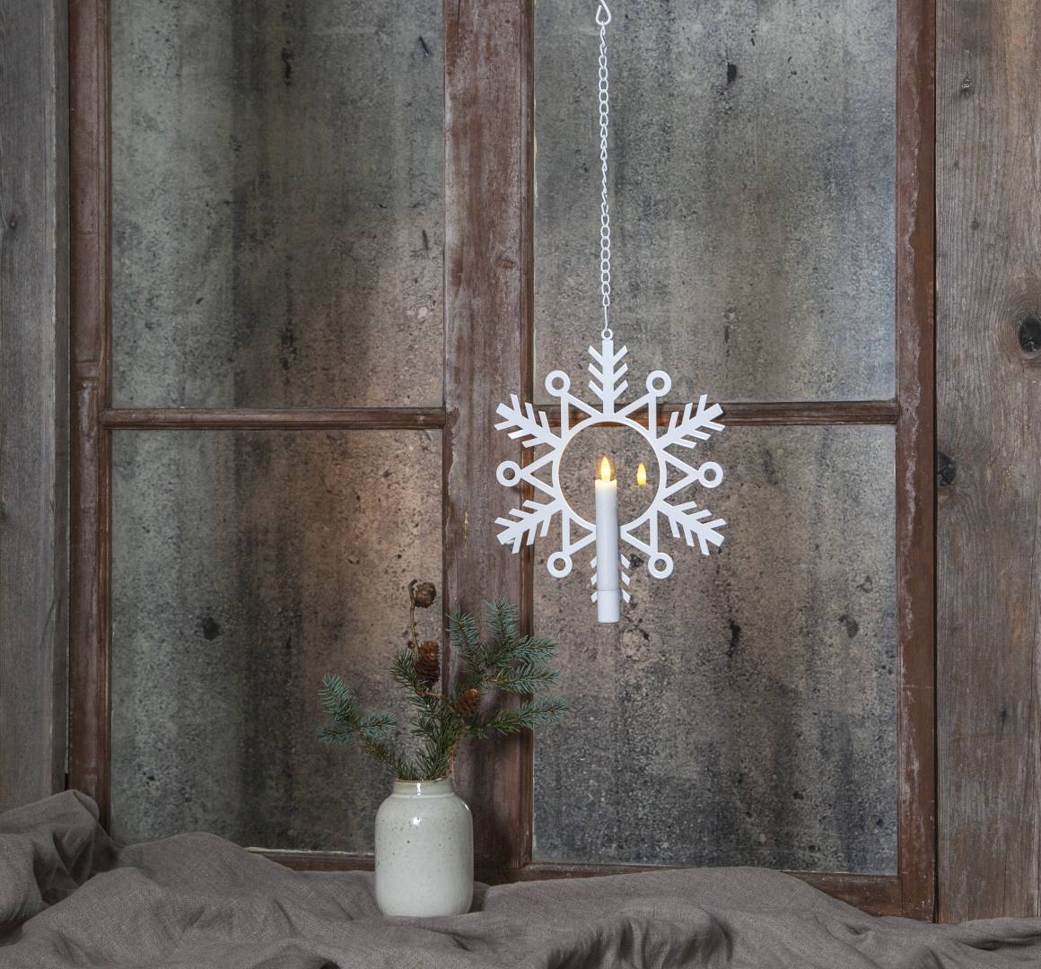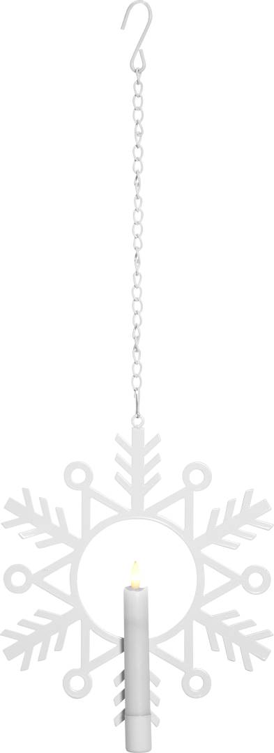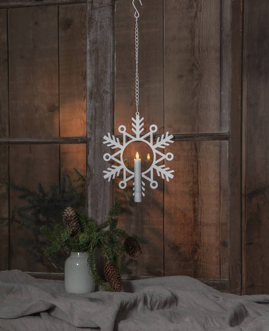 Valkoinen lumihiutaleen muotoinen metallikoriste, jossa vahasta valmistettu antiikkikynttilä aitoa muistuttavalla lämpimän valkoisella LED-liekillä. Kaunis koriste esimerkiksi ikkunaan tai seinälle.