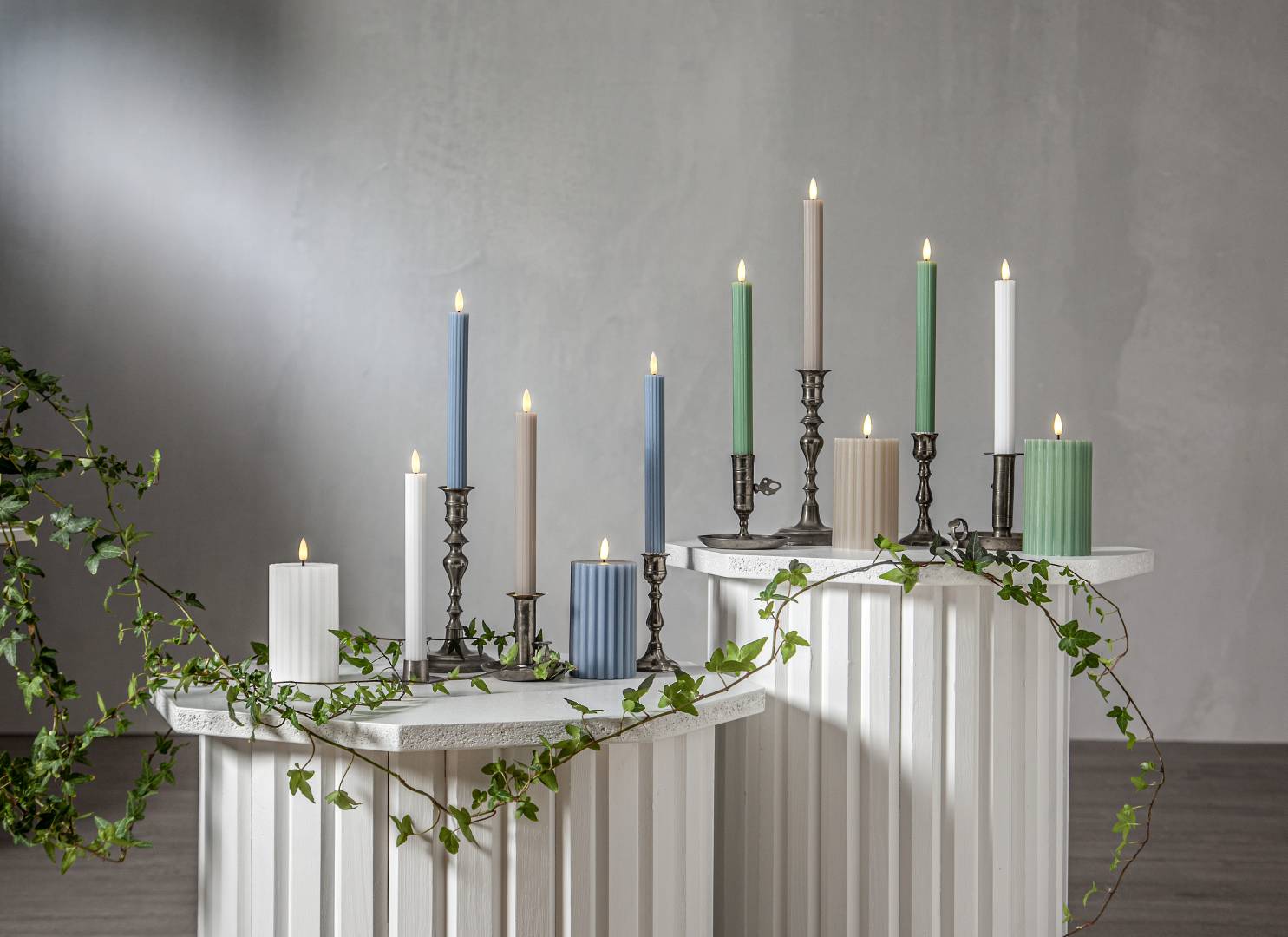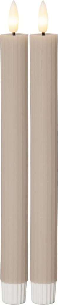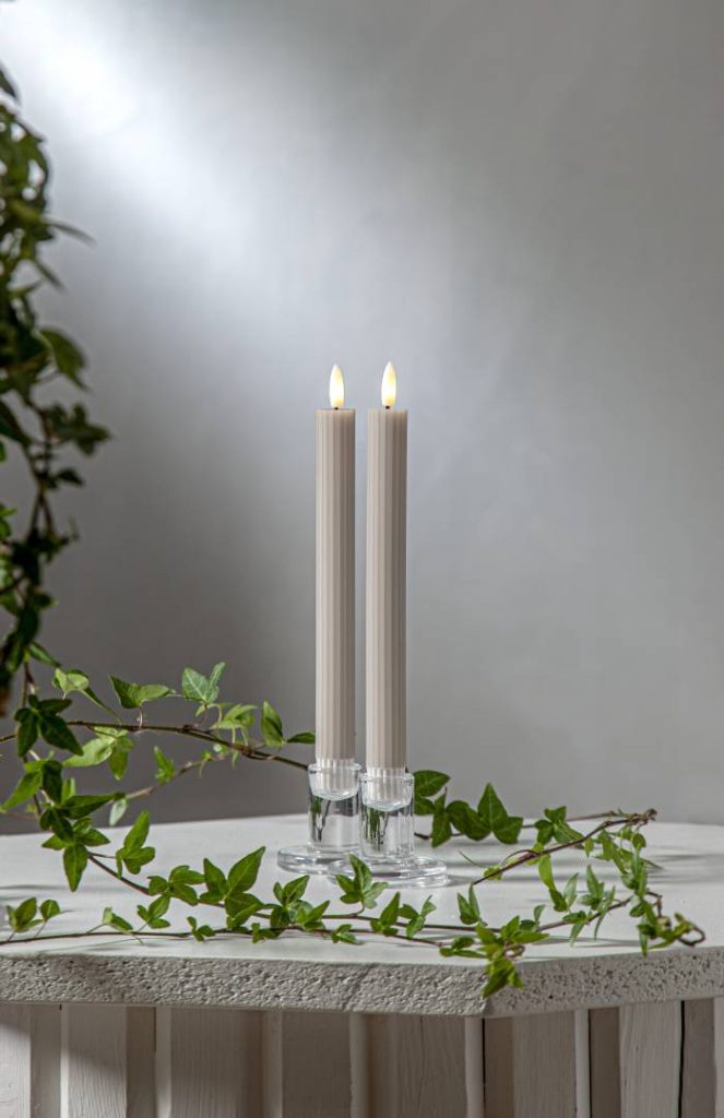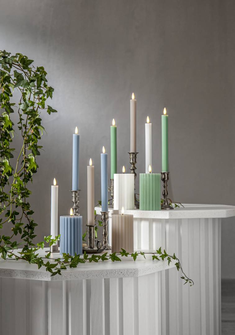 Flamme Stripe on vahasta valmistettu LED-antiikkikynttilä uritetulla pinnalla ja aidon näköisellä lämpimän valkoisella Flamme-liekillä. Pakkaus sisältää kaksi kynttilää.