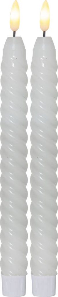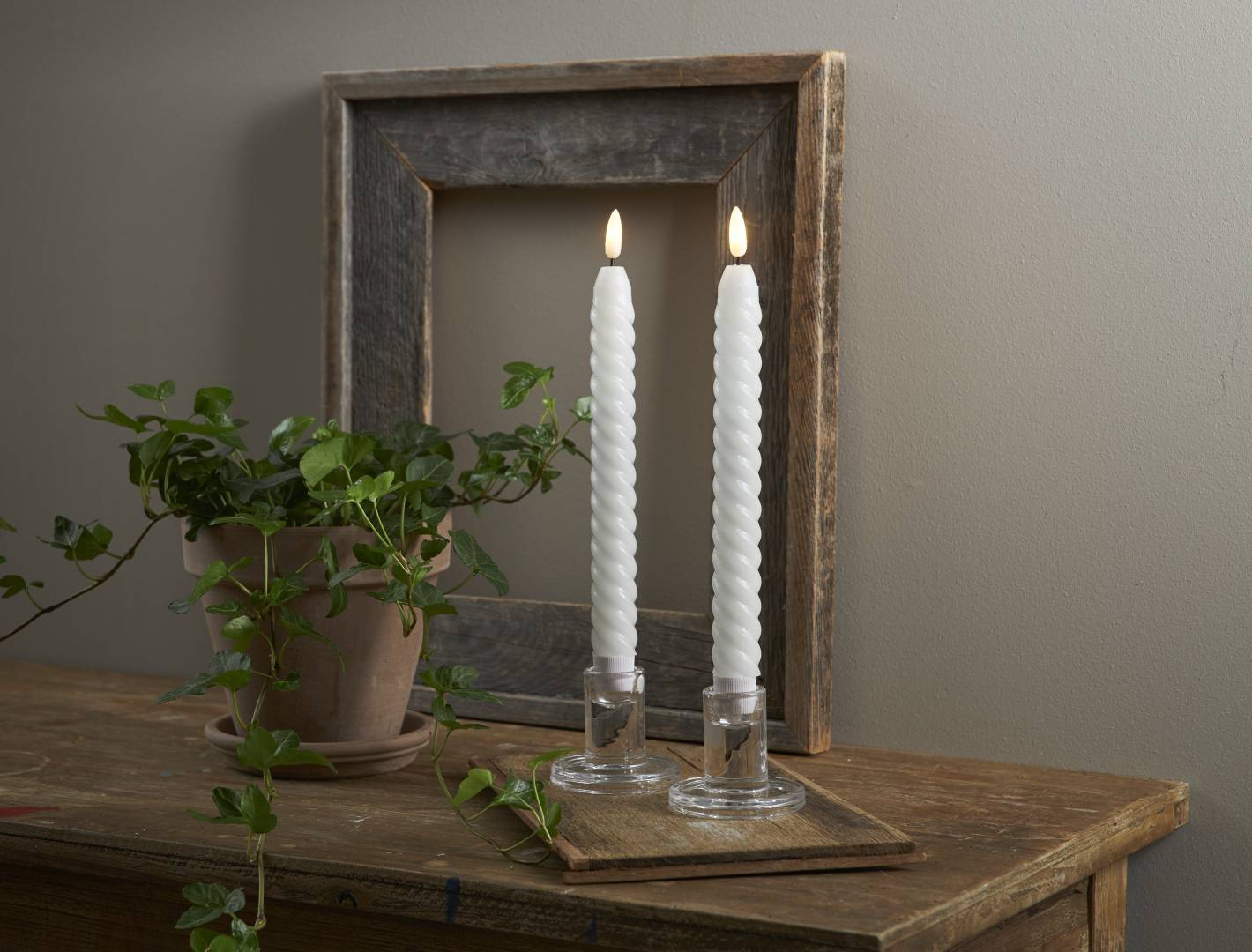 Flamme Swirl on vahasta valmistettu kierretty LED-antiikkikynttilä aidon näköisellä lämpimän valkoisella Flamme-liekillä. Pakkaus sisältää kaksi kynttilää.