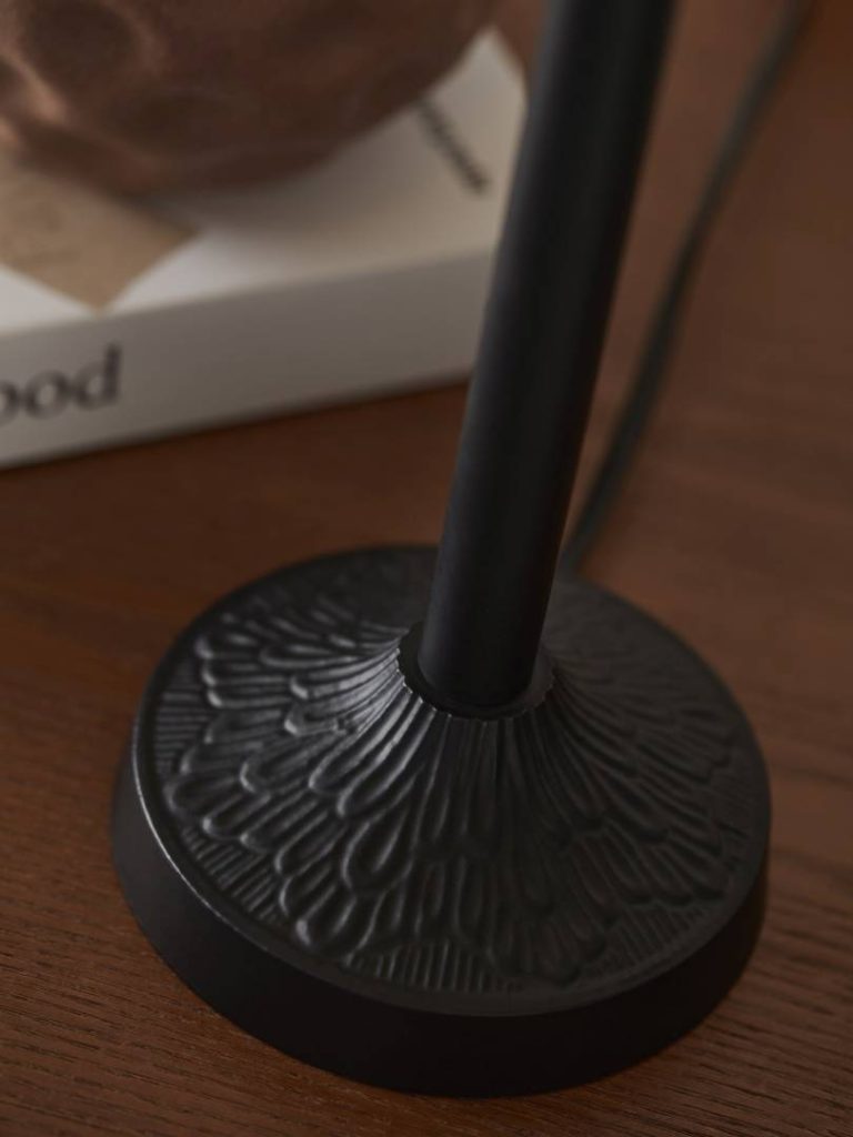 Lampunjalka mattamustaa metallia. Kauniit yksityiskohdat.