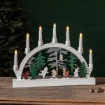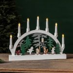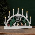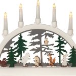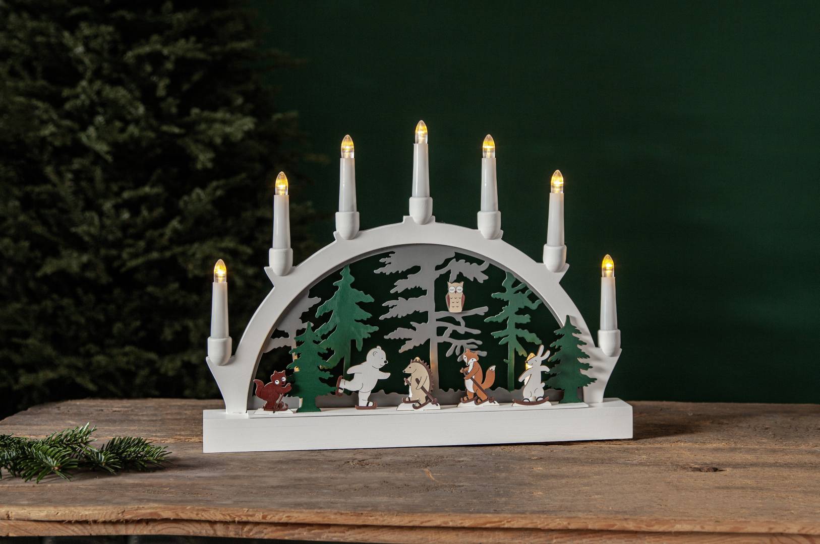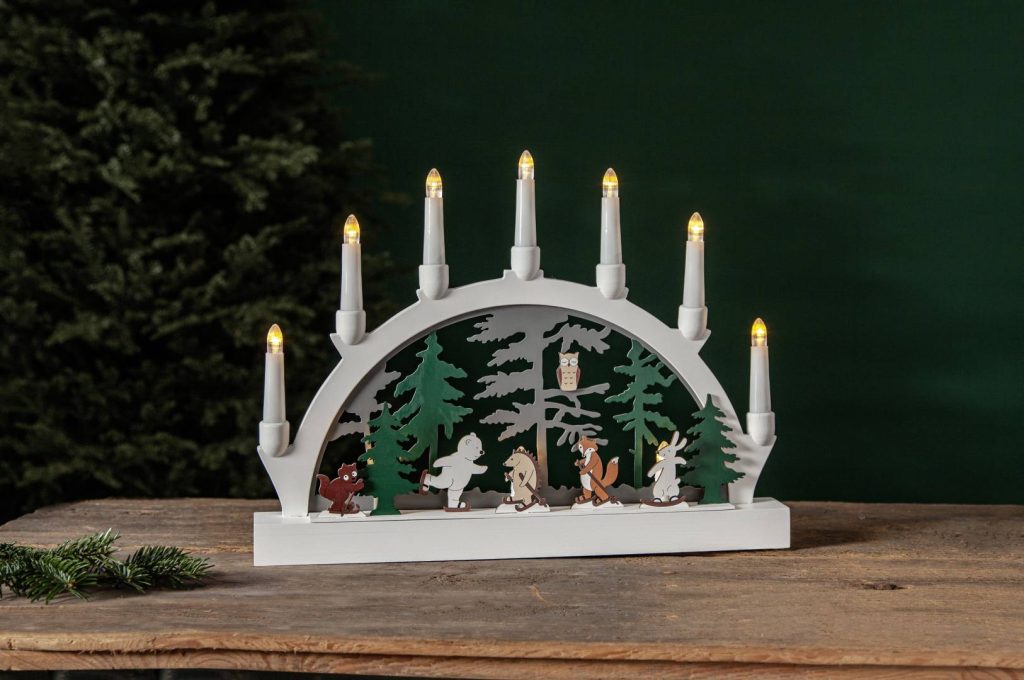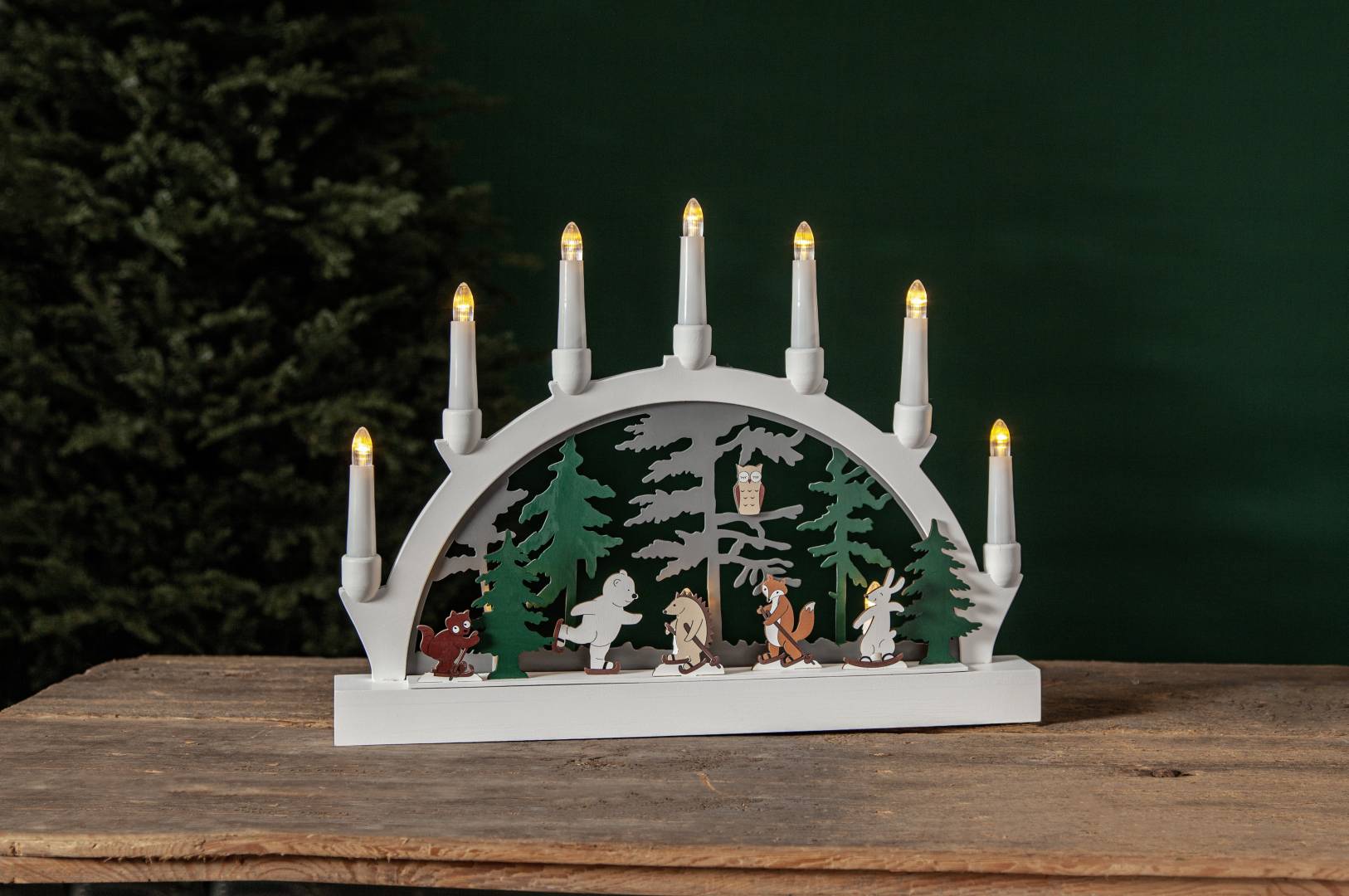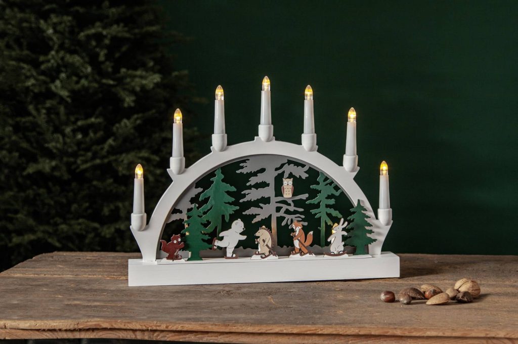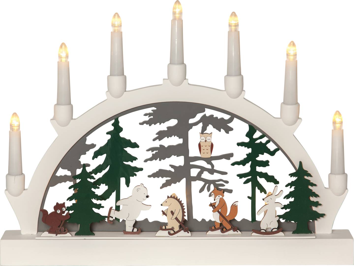 Paristokäyttöinen kynttelikkö laserleikatuilla puukoristella. Maisemassa jääkarhu, siili, kettu ja jänis luistelevat metsän siimeksessä. Sopii esimerkiksi lastenhuoneeseen tuomaan jouluista tunnelmavaloa. Kynttelikköä valaisee 7 lämpimän valkoista LED-lamppua ja 3 pientä valopistettä.