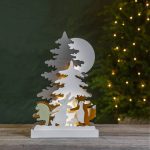 Sisäkäyttöön sopiva pöytäkoriste laserleikattua puuta. Siili, jänis ja kettu viettävät joulua ystävien kesken ja tanssivat kuusen ympärillä. Tunnelmallista valoa luovat 10 lämpimän valkoista LED-lamppua.