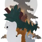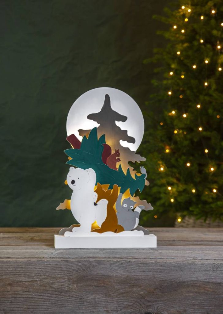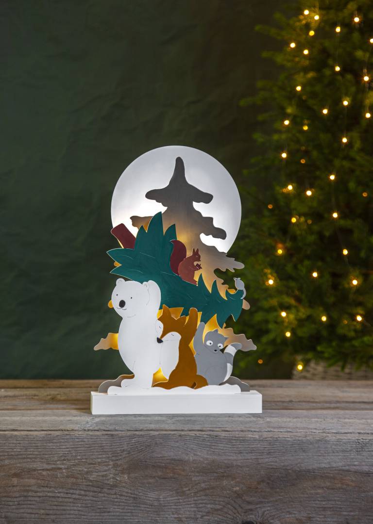 Sisäkäyttöön sopiva pöytäkoriste laserleikattua puuta. Siili, kettu ja pesukarhu kuljettavat joulukuusta ja valmistautuvat joulun viettoon ystävien kesken. Tunnelmallista valoa luovat 10 lämpimän valkoista LED-lamppua.
