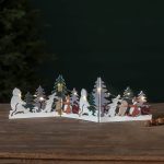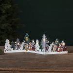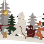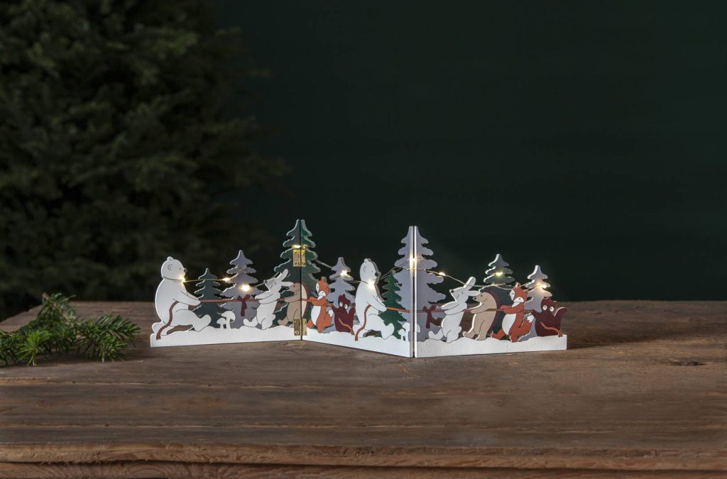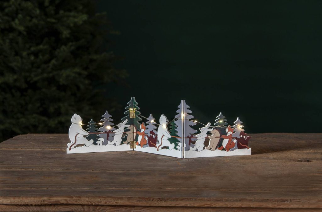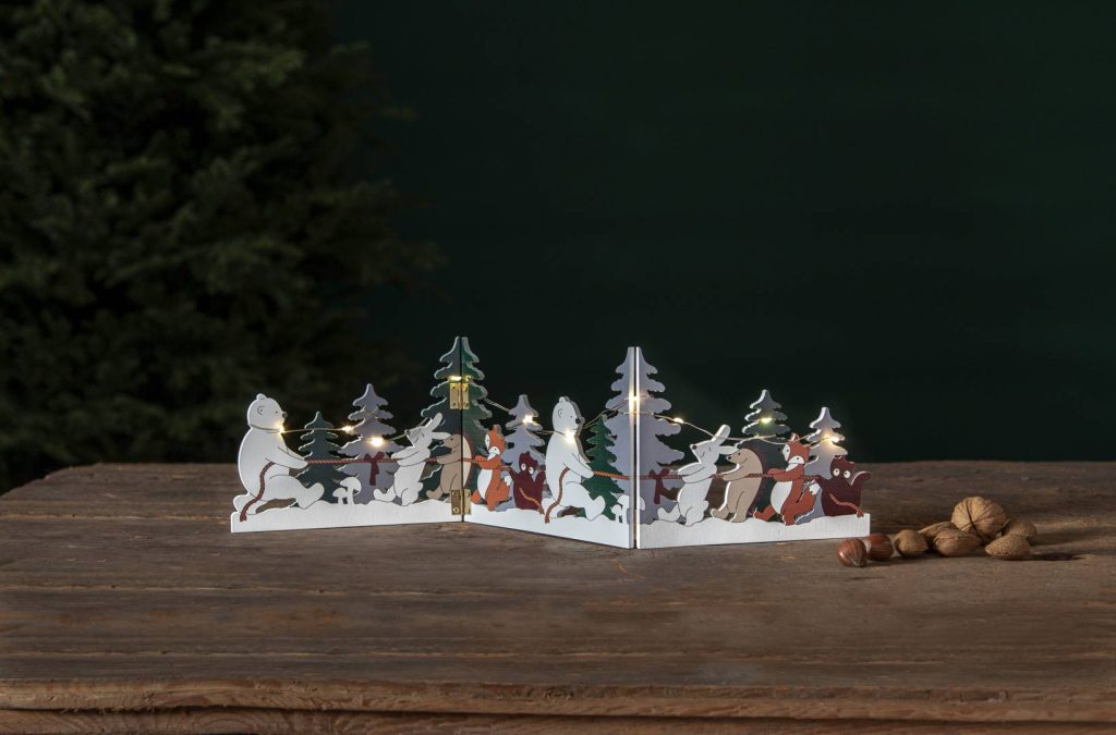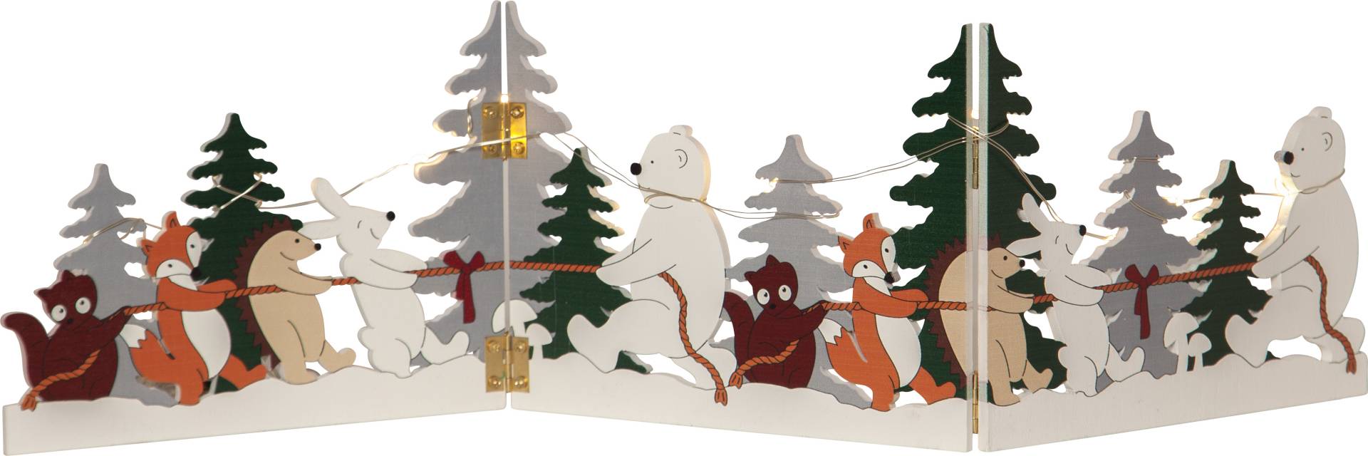 Sisäkäyttöön sopiva pöytäkoriste laserleikattua puuta. Jääkarhu, jänis, siili, pesukarhu ja kettu mittelevät voimiaan köydenvedossa talvisessa metsässä. Tunnelmallista valoa luovat 10 lämpimän valkoista LED-lamppua.