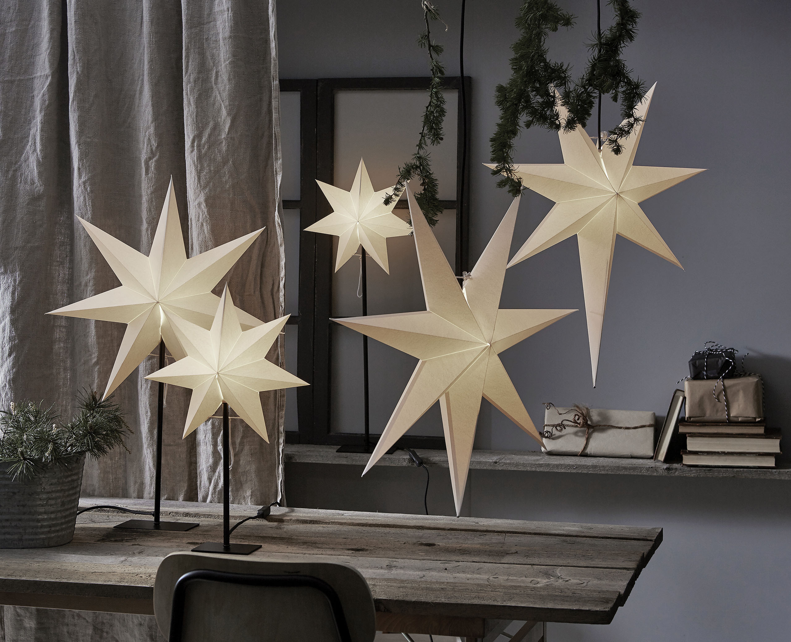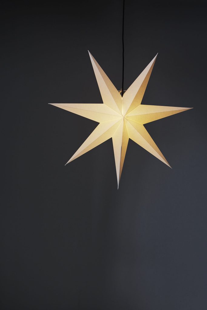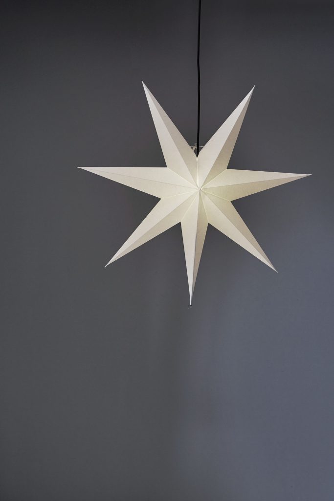 Elegantti valkoinen paperitähti mustalla tekstiilijohdolla, sisäkäyttöön. Ripusta esimerkiksi ikkunaan tuomaan joulutunnelmaa.