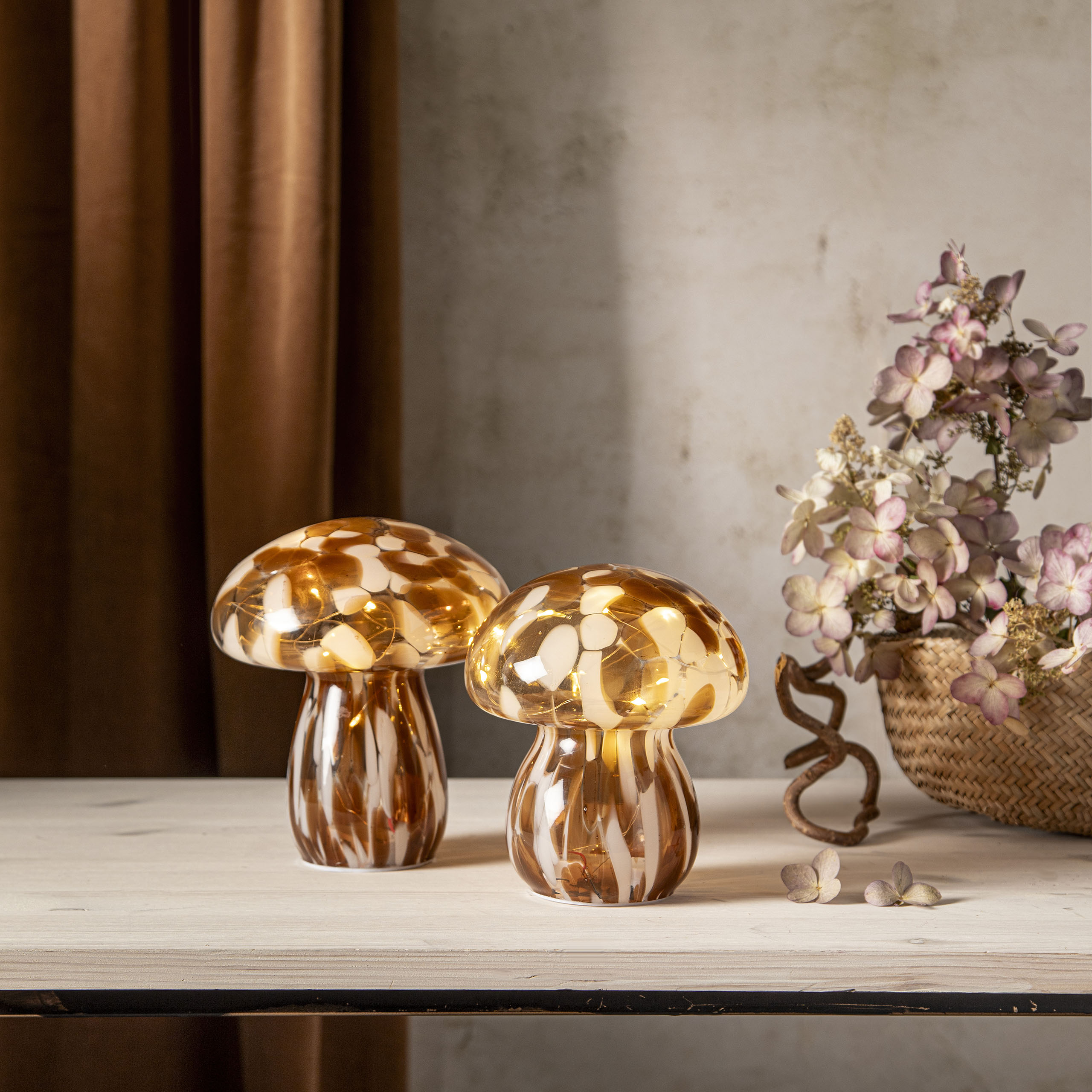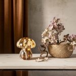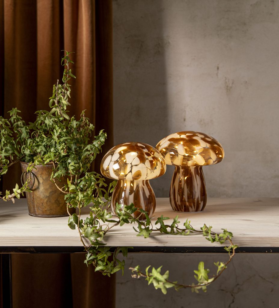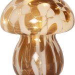 Tyylikäs sienen muotoinen ruskean ja valkoisen värinen lasikoriste, joka sopii esimerkiksi pöytäkoristeeksi. Koristeessa on lämpimän valkoiset LED-valot ja jokaisessa yksilössä uniikki kuviointi. Sisäkäyttöön.