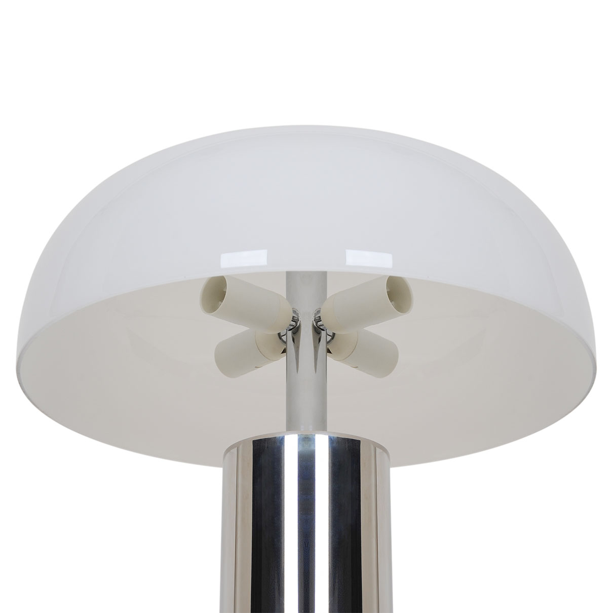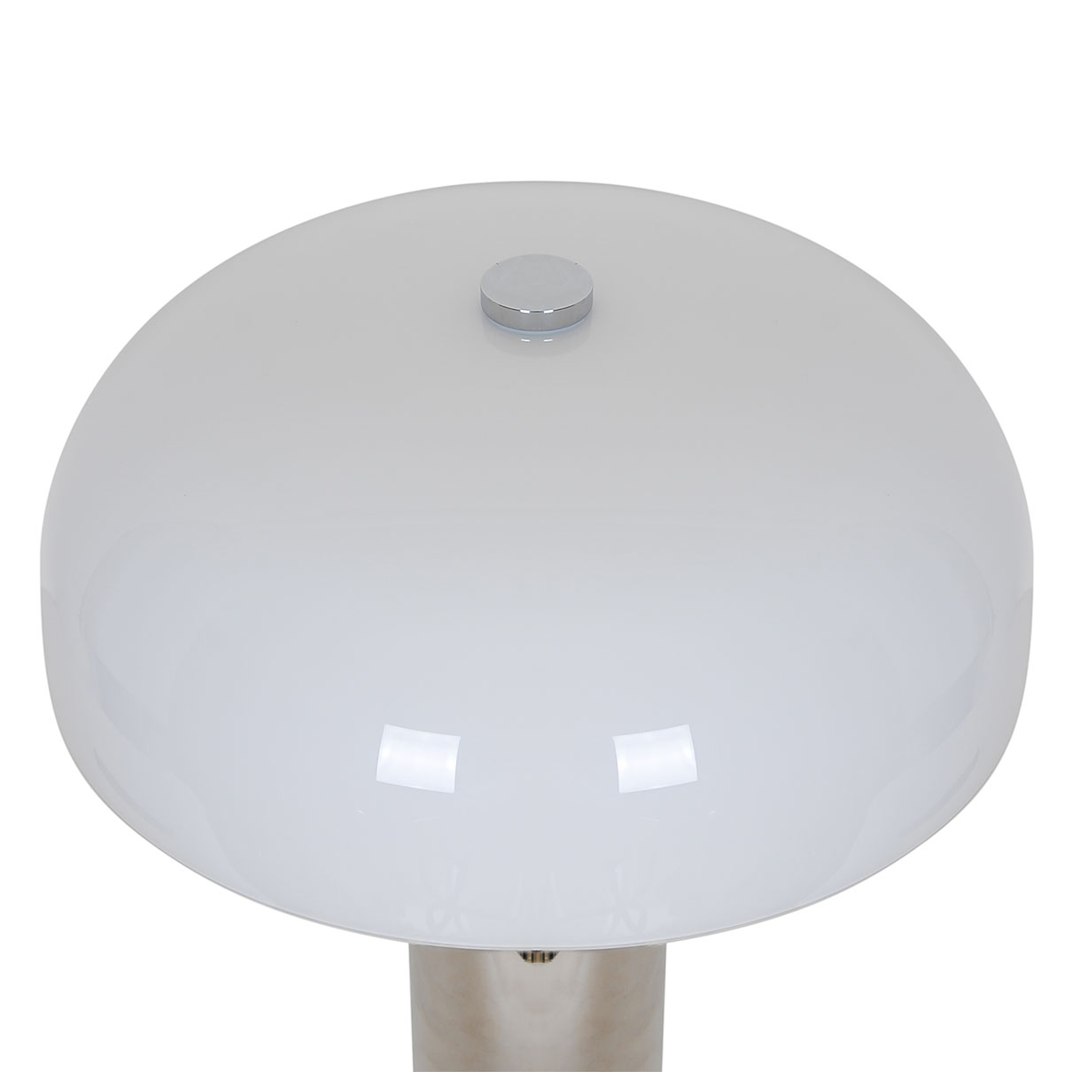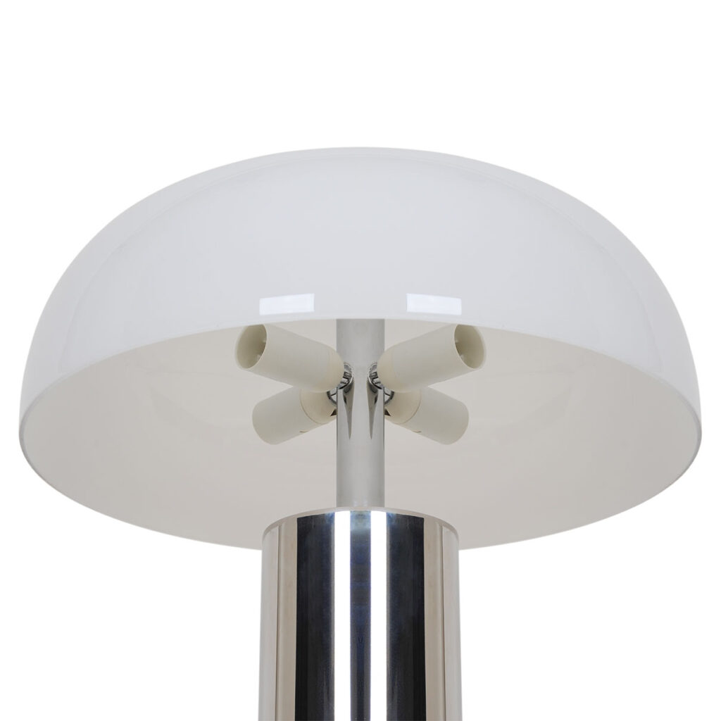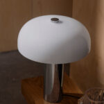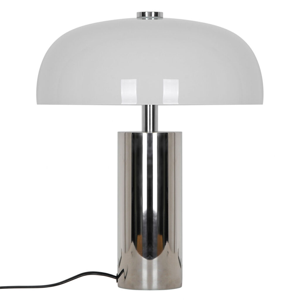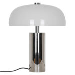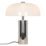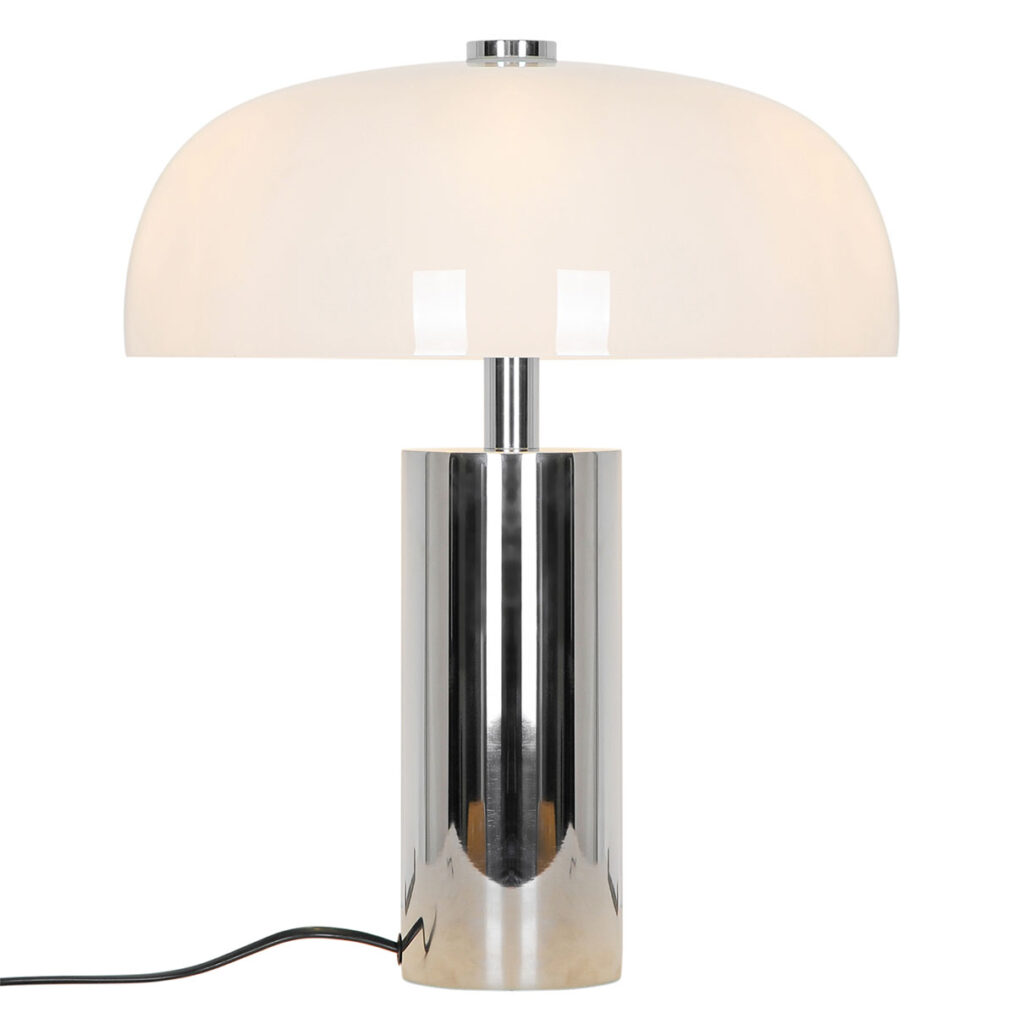Gabrielle yhdistää kiiltävän kromin ja kiiltävän opaalilasin elegantissa materiaalien yhdistelmässä. Suuri opaalivarjostin antaa valaisimelle veistoksellisen ilmeen ja samalla se luo pehmeän, hajautetun valon, joka täydentää kiiltävää kromijalkaa.
