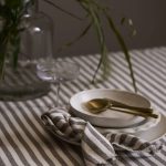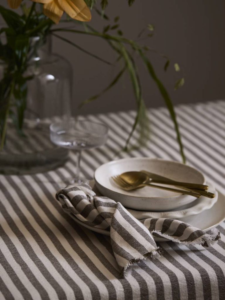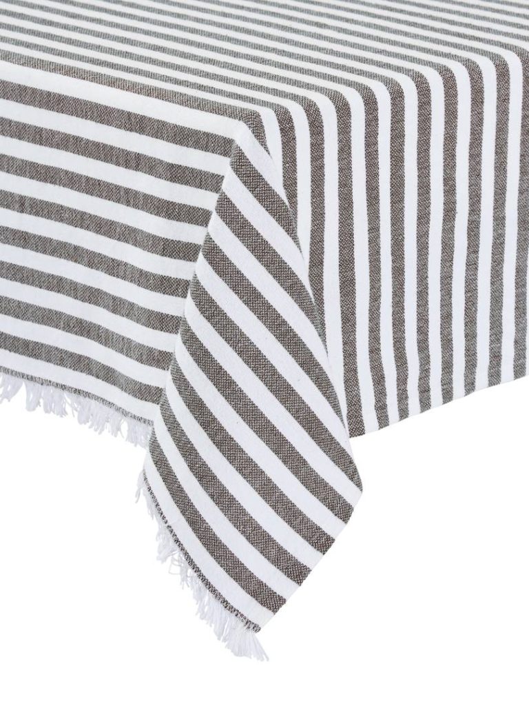 Pöytäliina pehmeää, kevyesti pestyn tuntuista puuvillaa. Kankaassa on lankavärjätty raidoitus, joten se on samanlainen molemmilta puolilta. Liinan päädyissä on hapsut.