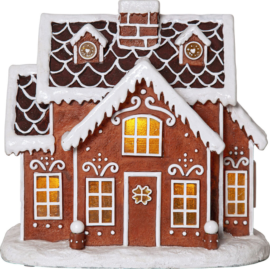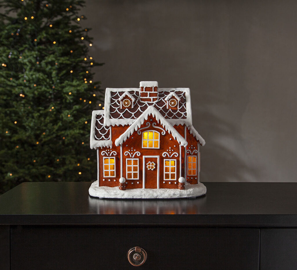 Kaunis piparkakkutalokoriste, jota valaisevat lämpimän valkoiset LED-lamput. Sijoita piparitalo esimerkiksi lipaston päälle tuomaan ihanaa tunnelmallista valoa.