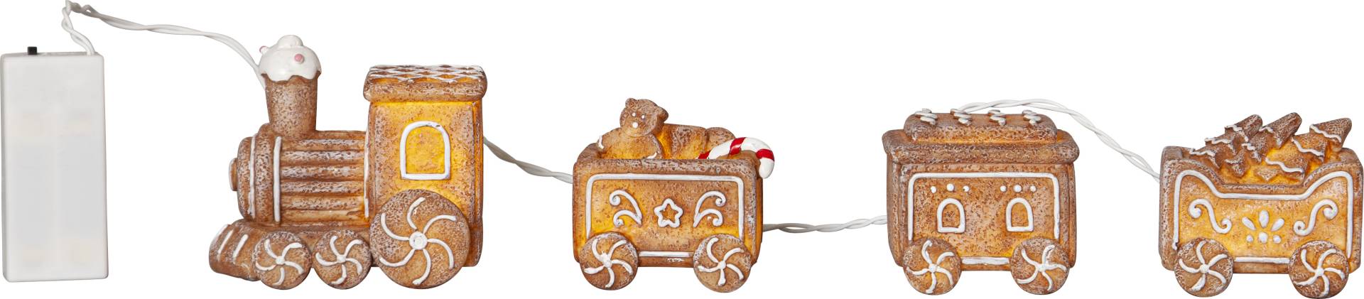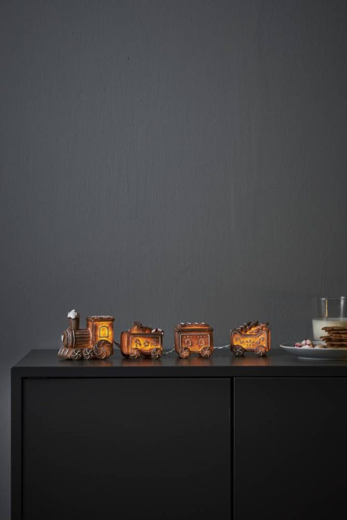 Pöytäkoriste, jossa pipari-veturi ja kolme vaunua, valaistuksena lämpimän valkoiset LED-valot. Sisäkäyttöön.