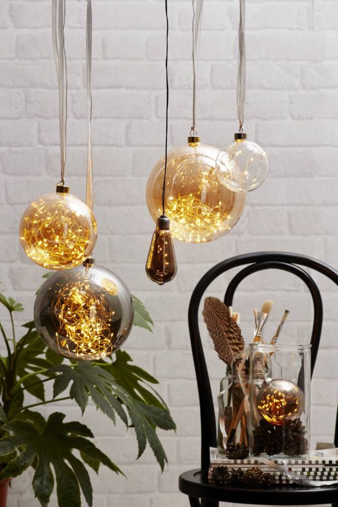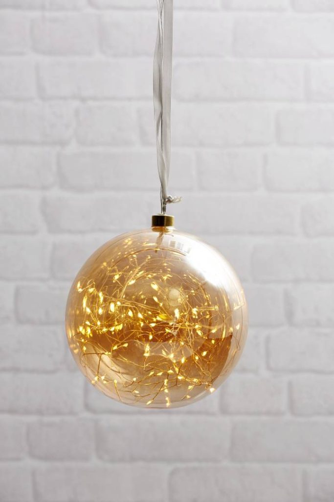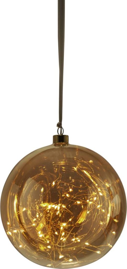 Meripihkan värinen koristelasipallo, jonka sisällä on 80-osainen Dew Drop -valosarja lämpimän valkoisilla valoilla. Luo kauniin tunnelmallisen valon.