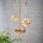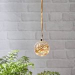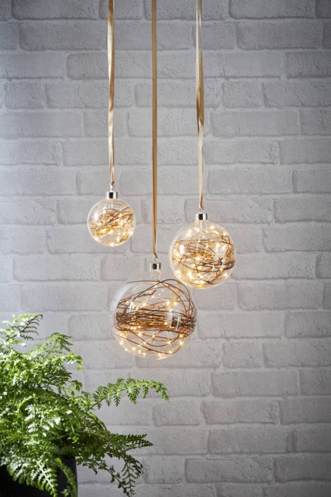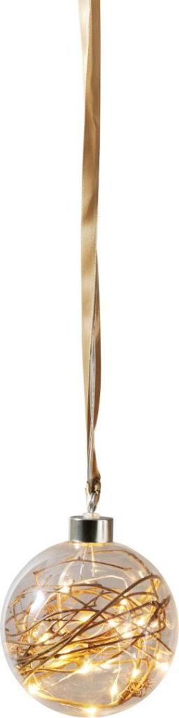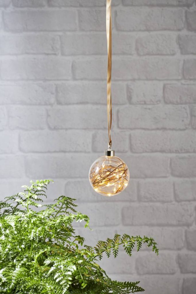 Paristokäyttöinen koristelasipallo, jonka sisällä on ruskea koristeoksa ja 15-osainen Dew Drop -valosarja lämpimän valkoisilla valoilla. Luo kauniin tunnelmallisen valon.
