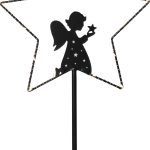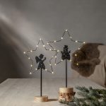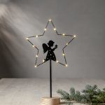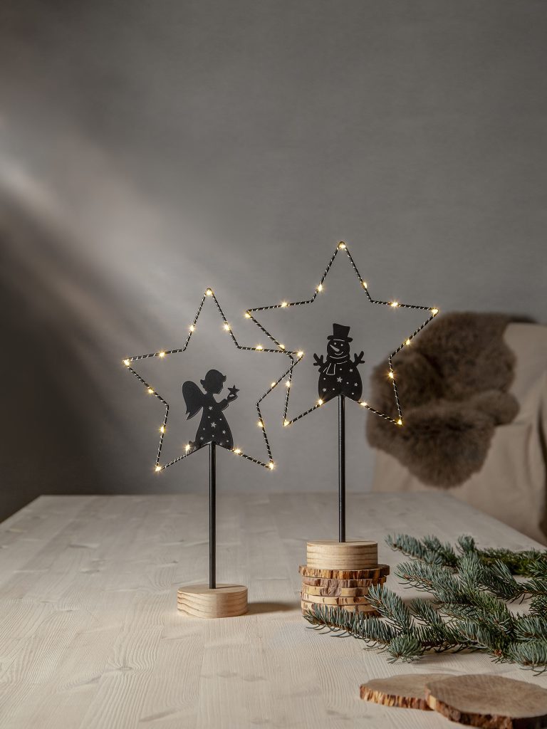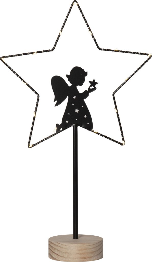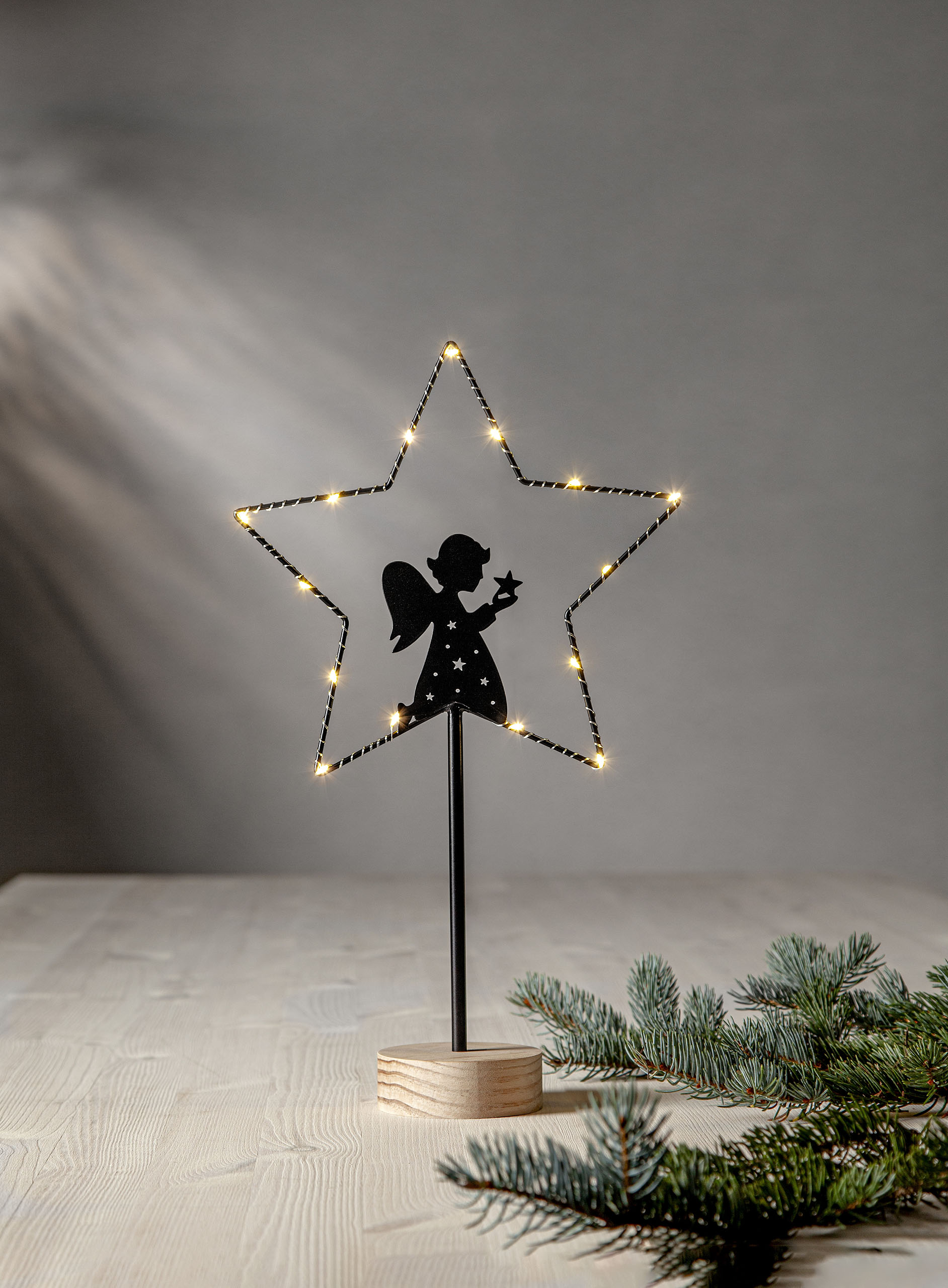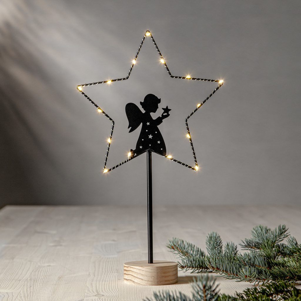 Pöytätähti enkelisiluetilla, mustaa metallia ja jalusta käsittelemätöntä puuta. Tähteä valaisee 15 pientä LED-valopistettä lämpimän valkoisella valolla. Sopii sisäkäyttöön esimerkiksi ikkunalaudalle tai lipaston päälle.