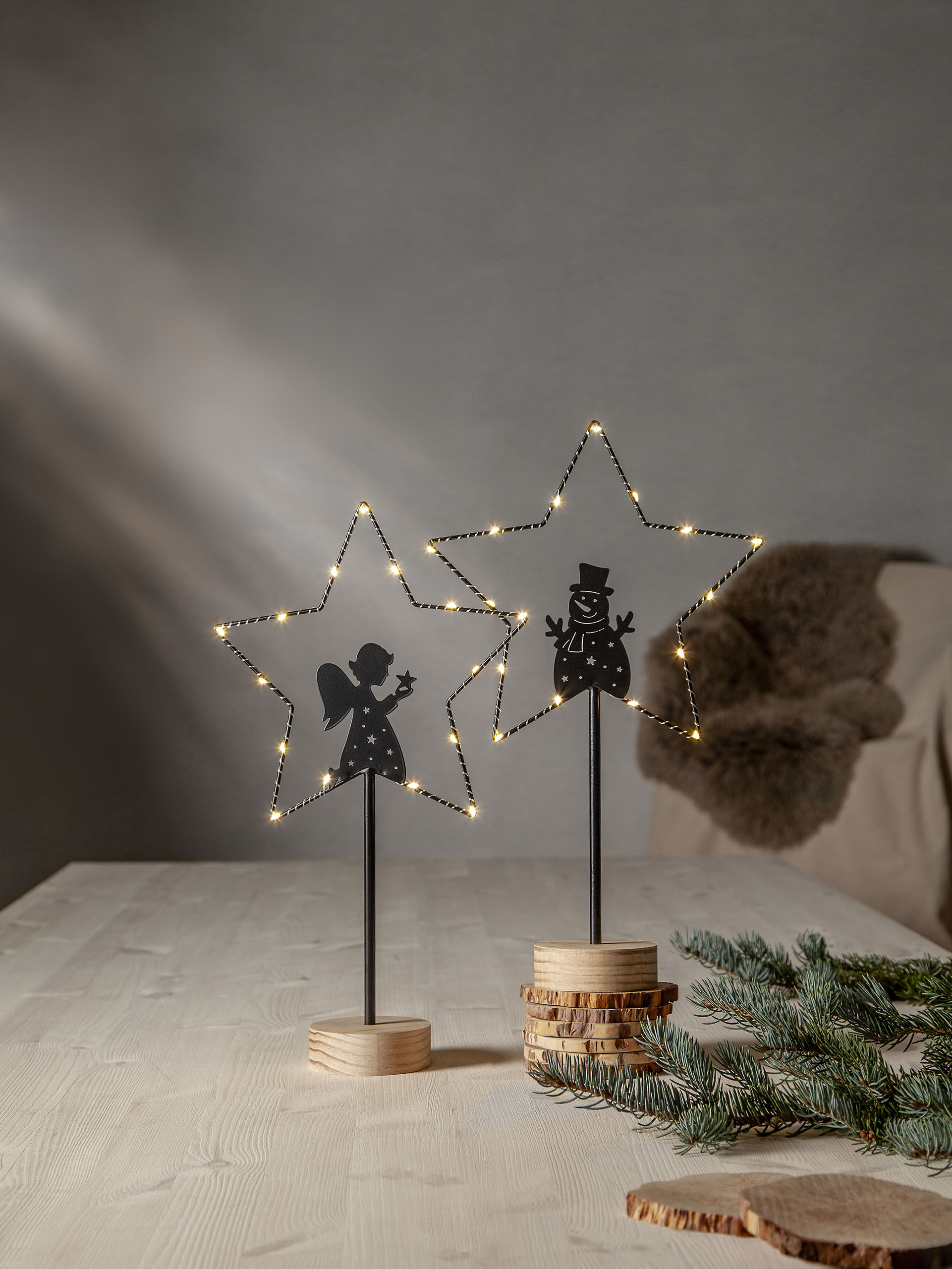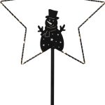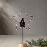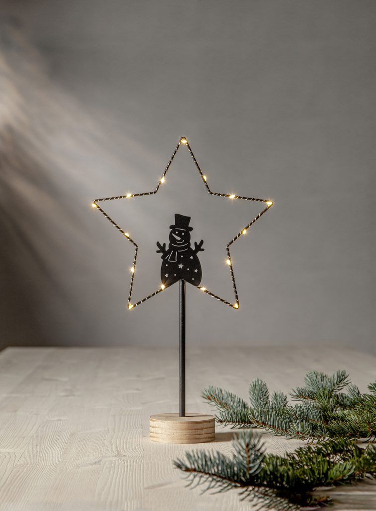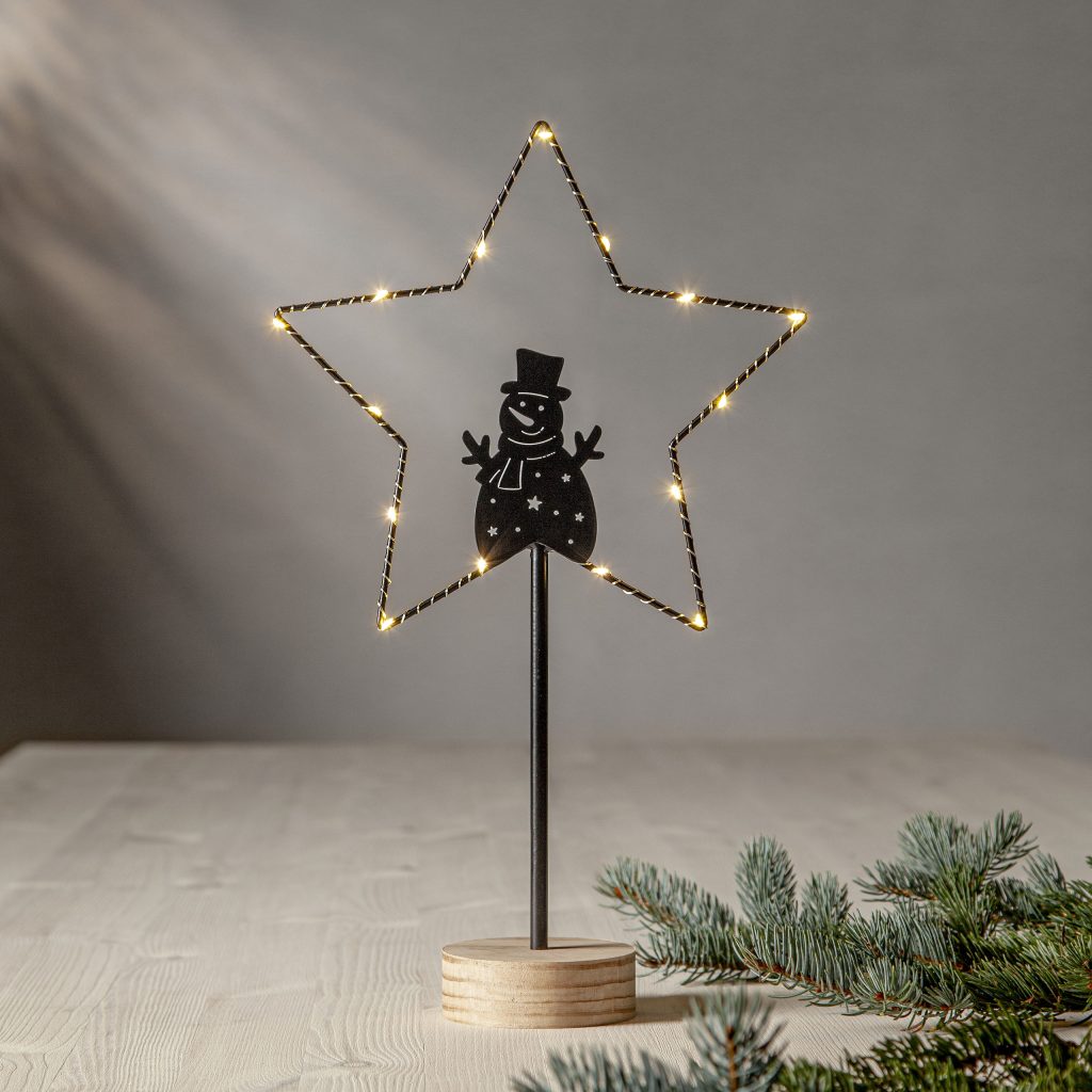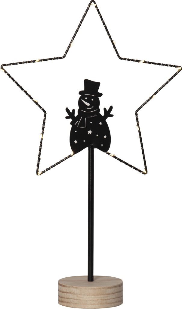 Pöytätähti lumiukkosiluetilla, mustaa metallia ja jalusta käsittelemätöntä puuta. Tähteä valaisee 15 pientä LED-valopistettä lämpimän valkoisella valolla. Sopii sisäkäyttöön esimerkiksi ikkunalaudalle tai lipaston päälle.