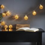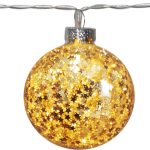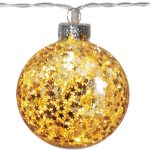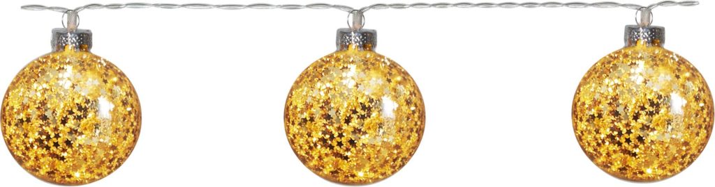 Sisäkäyttöön sopiva paristokäyttöinen valosarja, jossa on 10 lasipalloa kullanvärisillä glitterkoristeilla. Lasipallojen sisällä on lämpimän valkoiset LED-valot. Kaapeli on väriltään läpinäkyvä. Kaunis koristevalosarja, joka tuo kotiin tunnelmallista valoa.