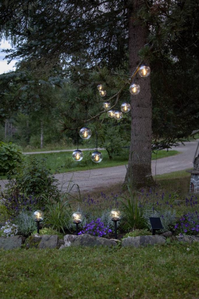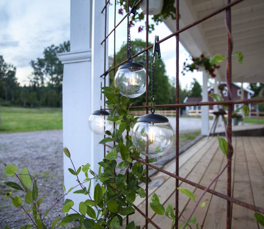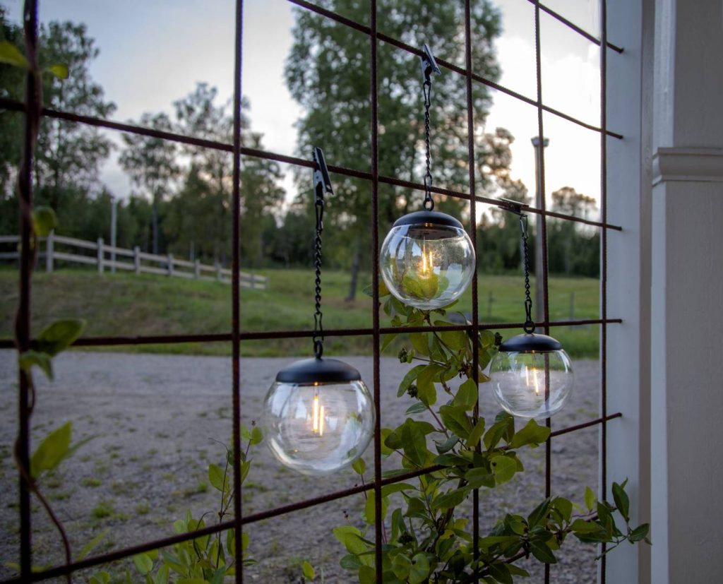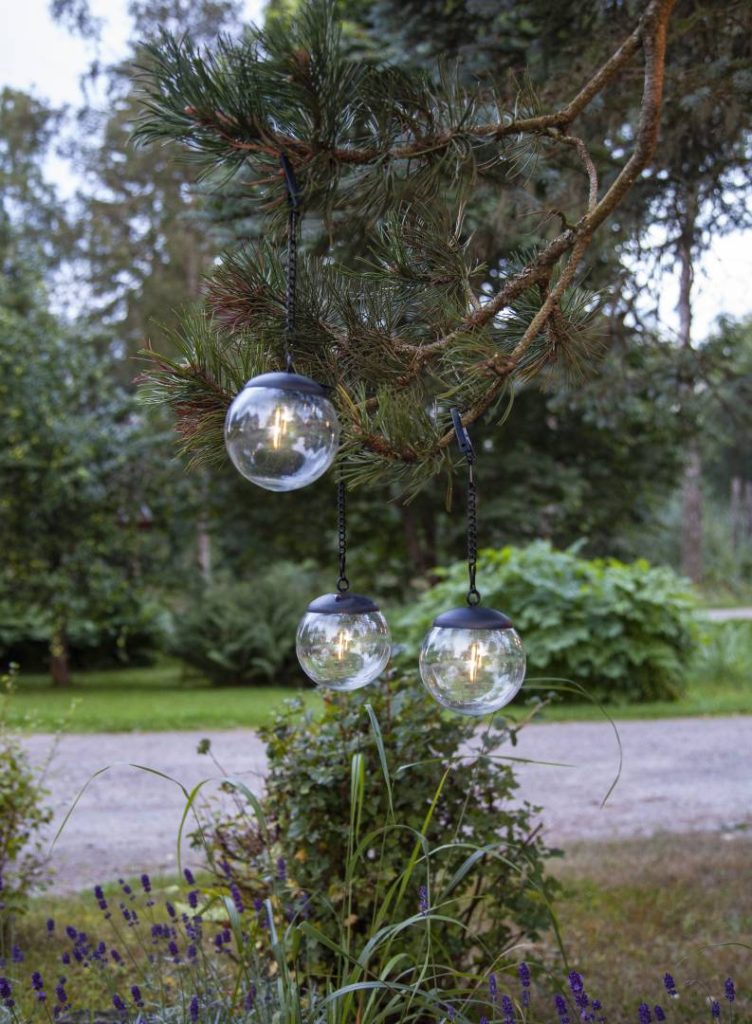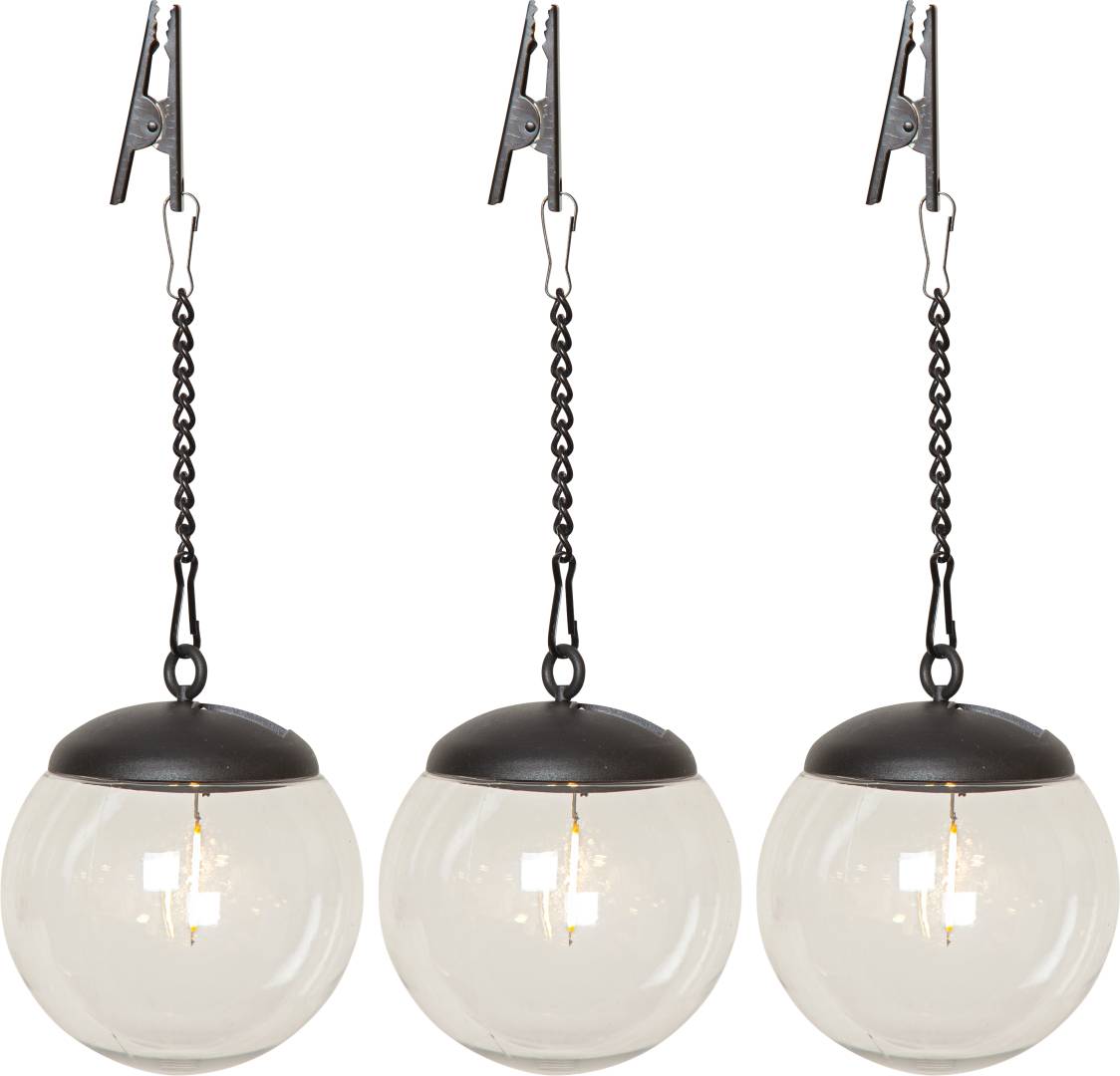 Aurinkokennolla toimiva koristevalaisin kolmen kappaleen pakkauksessa. Helppo ripustaa klipsun avulla. Koristeissa on lämpimän valkoinen filamentti-LED-valo, ja ne sopivat esimerkiksi puutarhaan, parvekkeelle tai terassille valaisemaan hämäriä iltoja.