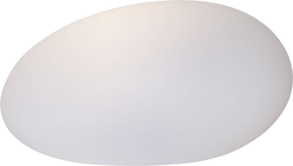 Valkoiselta kiveltä näyttävä aurinkokennolla toimiva koristevalaisin, joka loistaa hämärään aikaan lämpimän valkoisena.