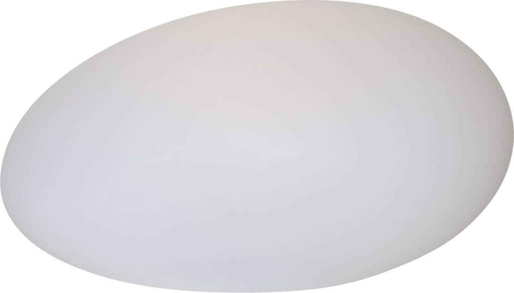 Valkoiselta kiveltä näyttävä aurinkokennolla toimiva koristevalaisin, joka loistaa hämärään aikaan lämpimän valkoisena.