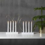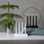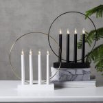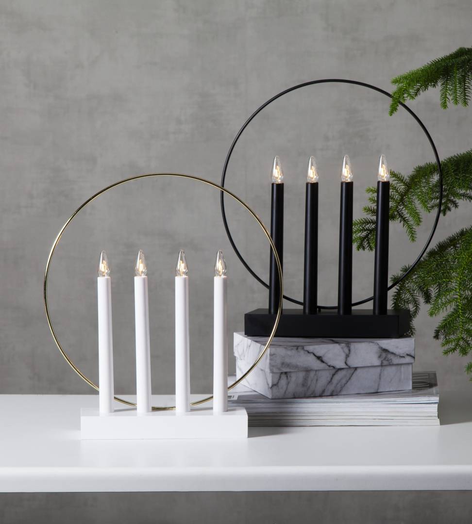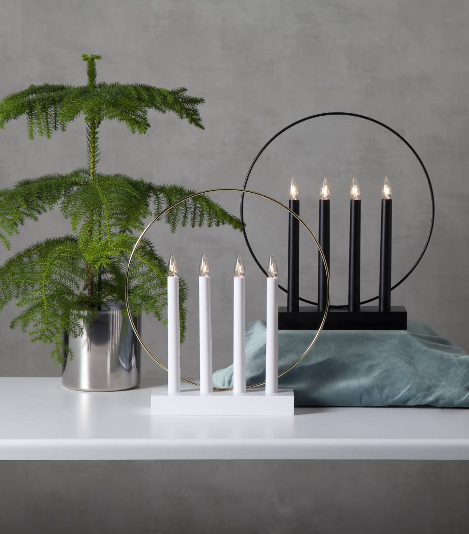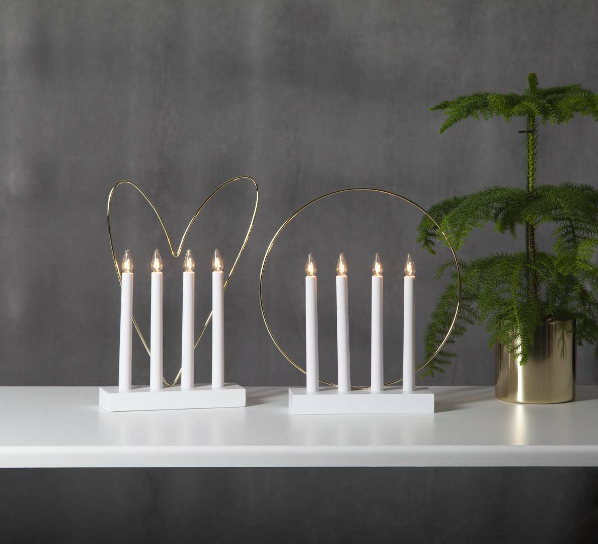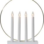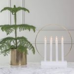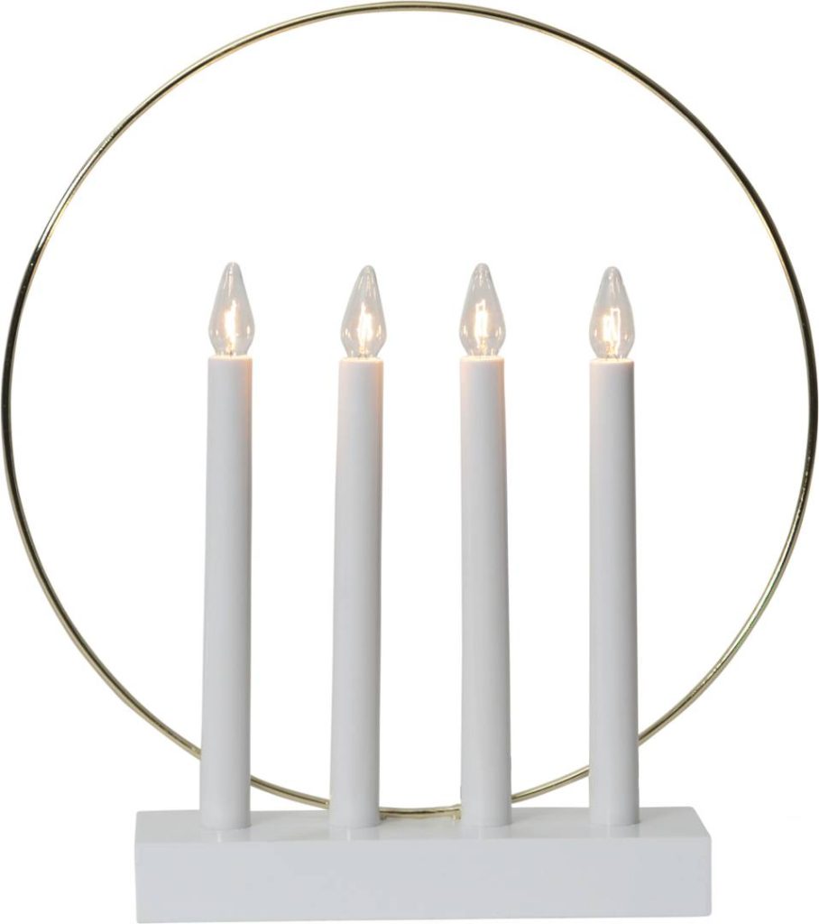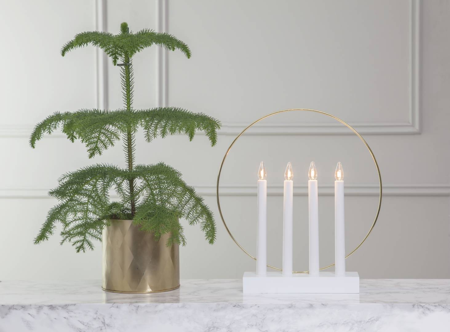 Kaunis valkoinen puukynttelikkö messingin värisellä metallirenkaalla.