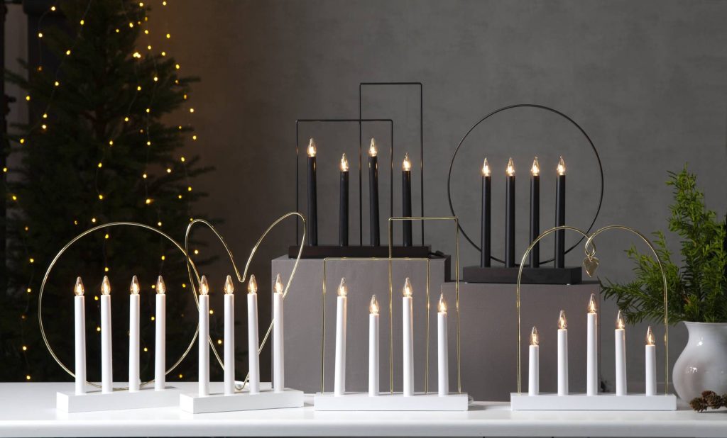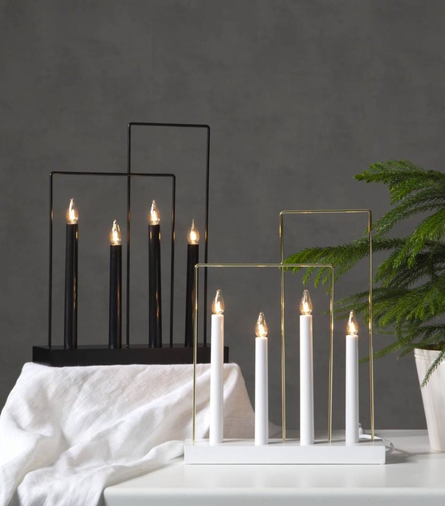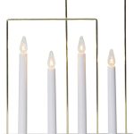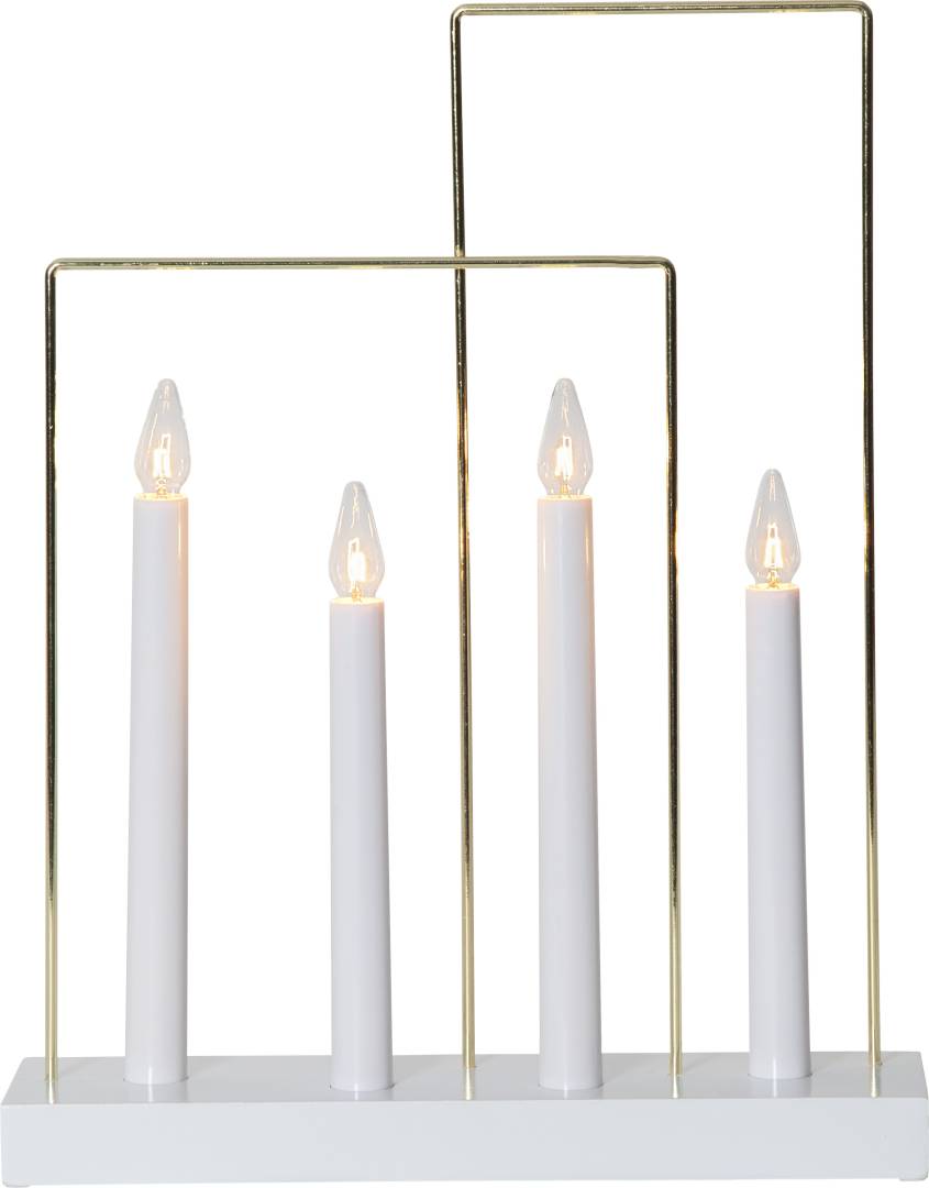 4-haarainen kynttelikkö sisäkäyttöön. Jalusta puuta, koriste metallia.
