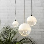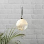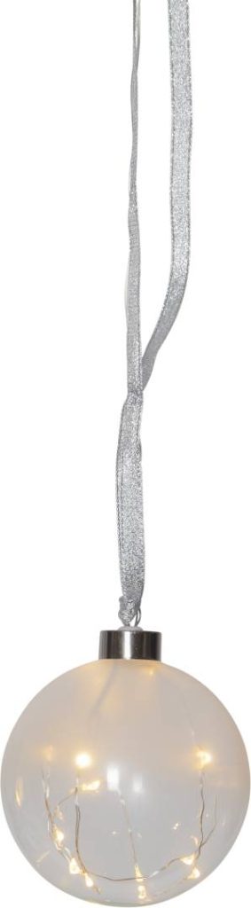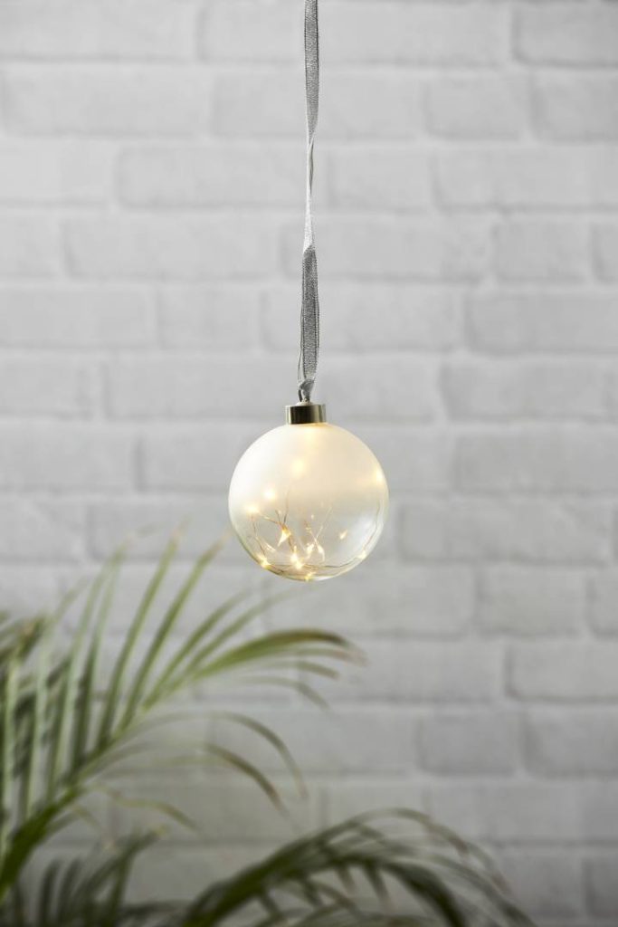 Paristokäyttöinen koristelasipallo, jonka yläosa on huurrettu ja pallon sisällä 15-osainen Dew Drop -valosarja lämpimän valkoisilla valoilla. Luo kauniin tunnelmallisen valon.
