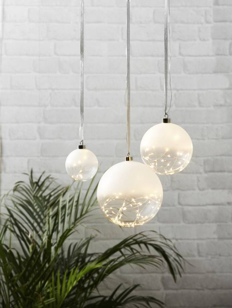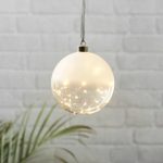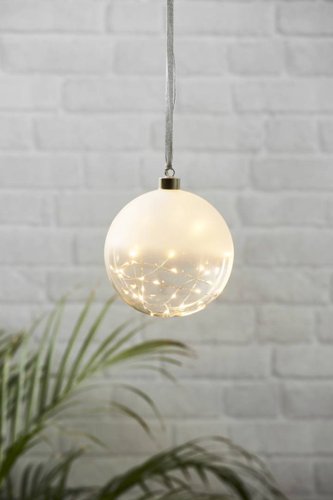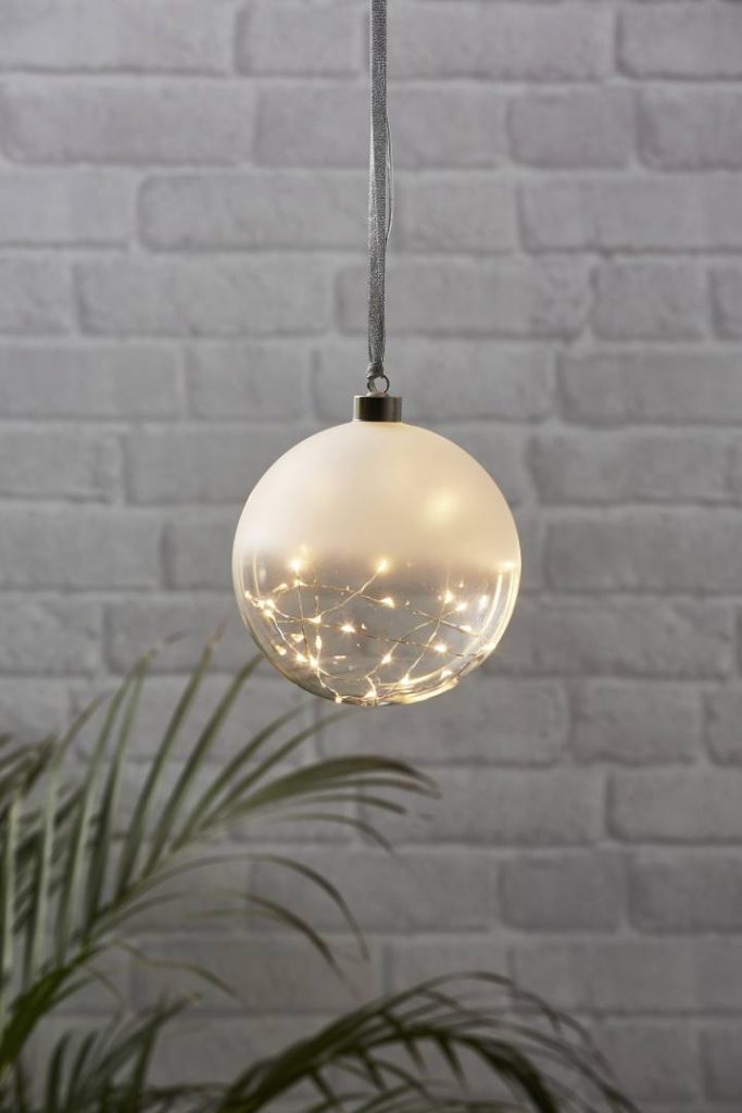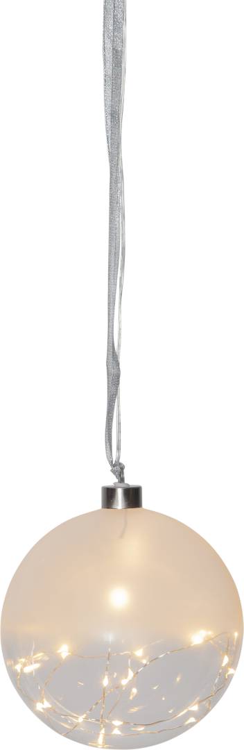 Koristelasipallo, jonka yläosa on huurrettu ja pallon sisällä 30-osainen Dew Drop -valosarja lämpimän valkoisilla valoilla. Luo kauniin tunnelmallisen valon.