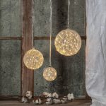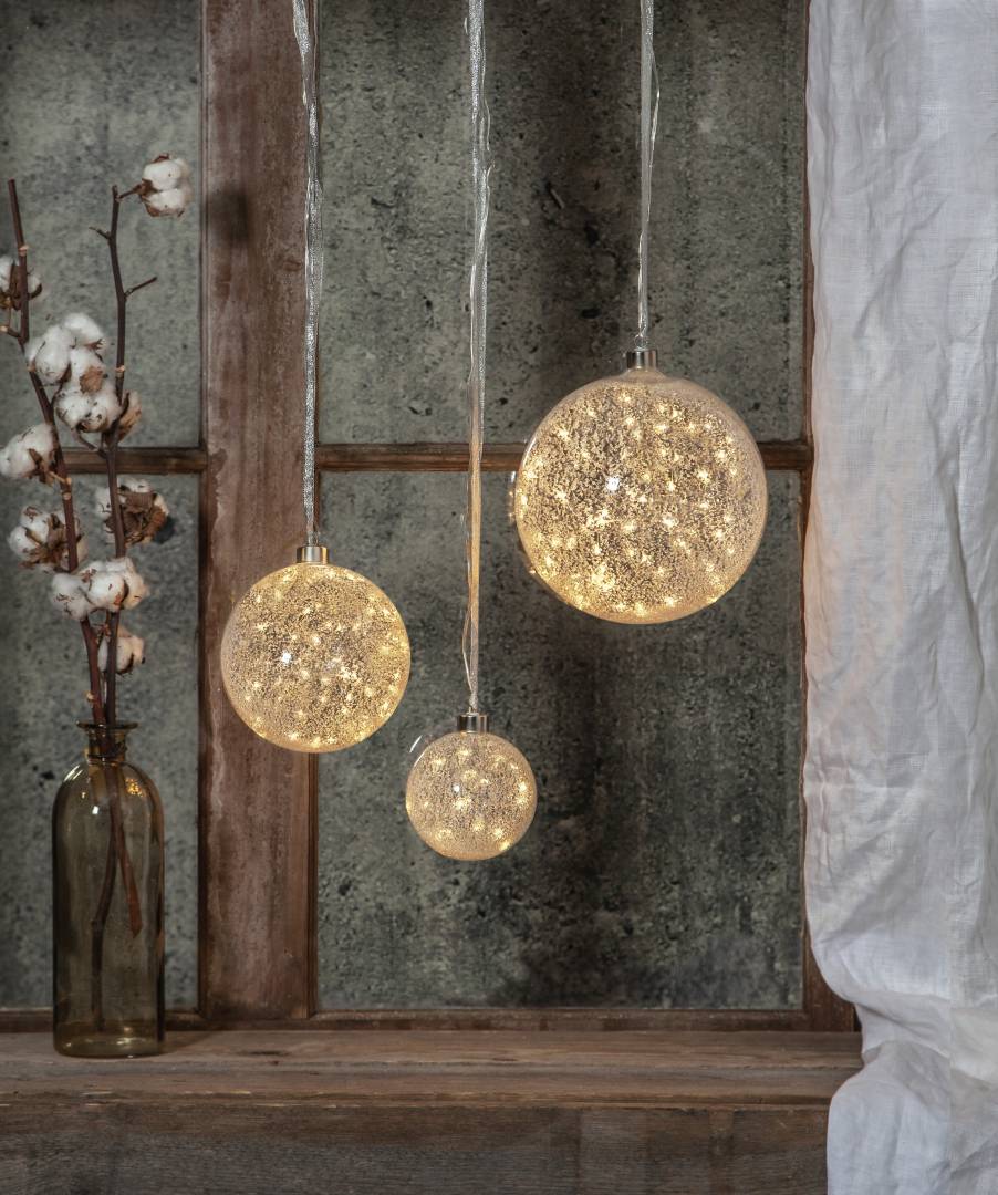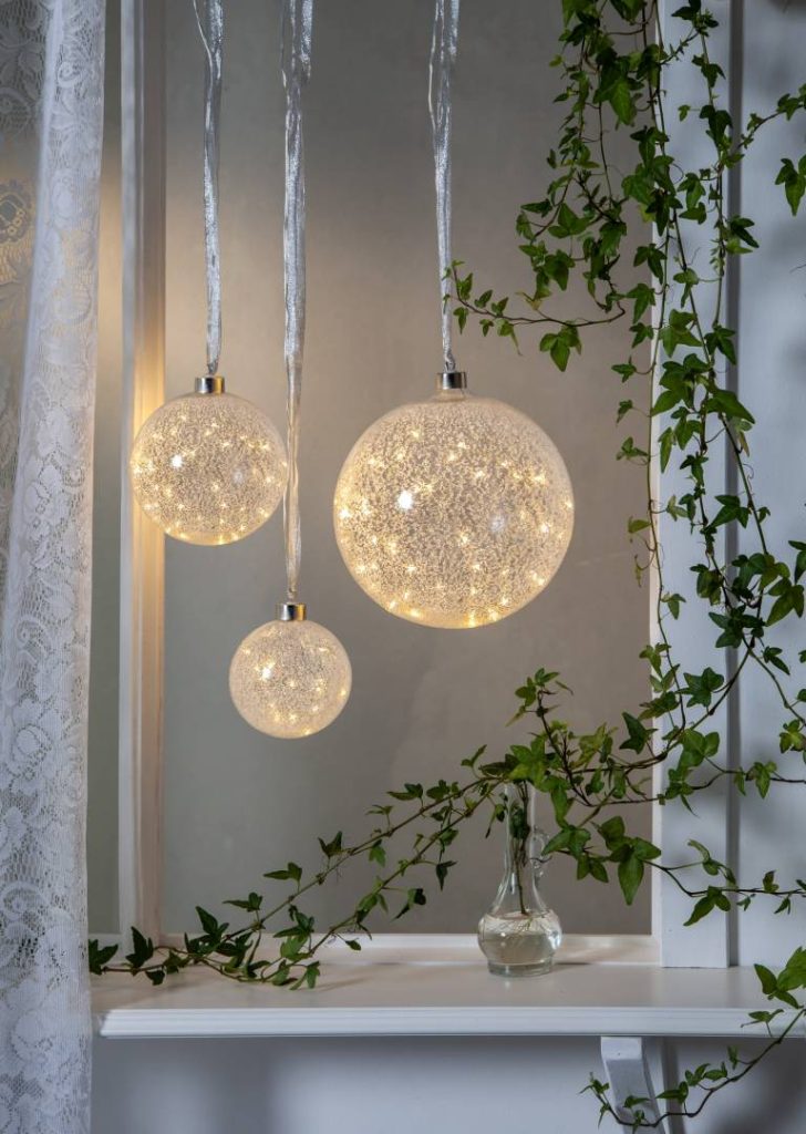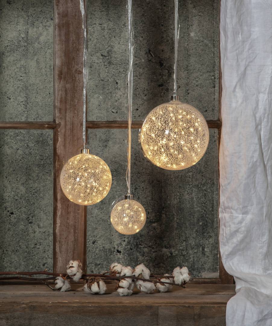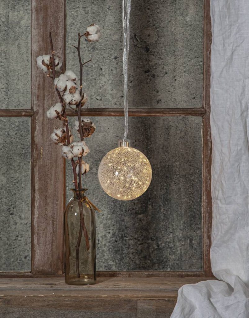 Koristelasipallo, jossa on kaunis lumihuurrepinta ja sisällä 30-osainen Dew Drop -valosarja lämpimän valkoisilla valoilla. Luo kauniin tunnelmallisen valon.