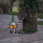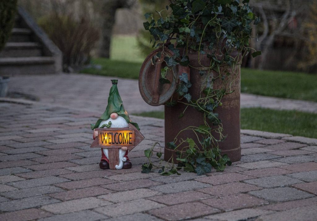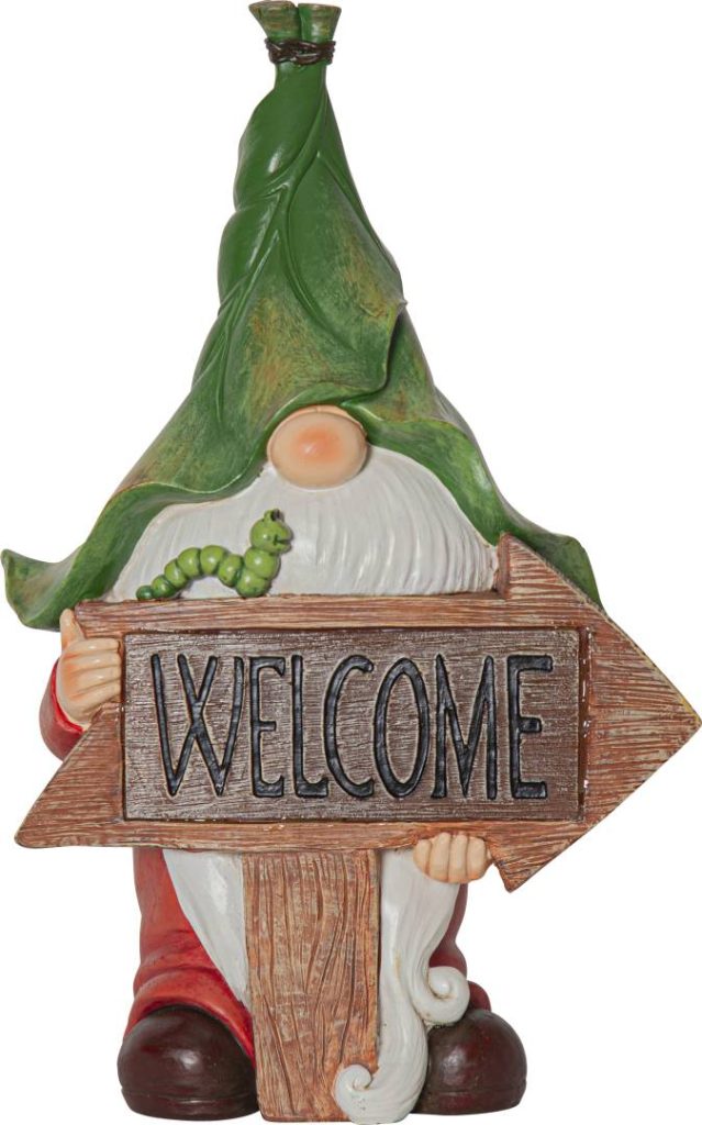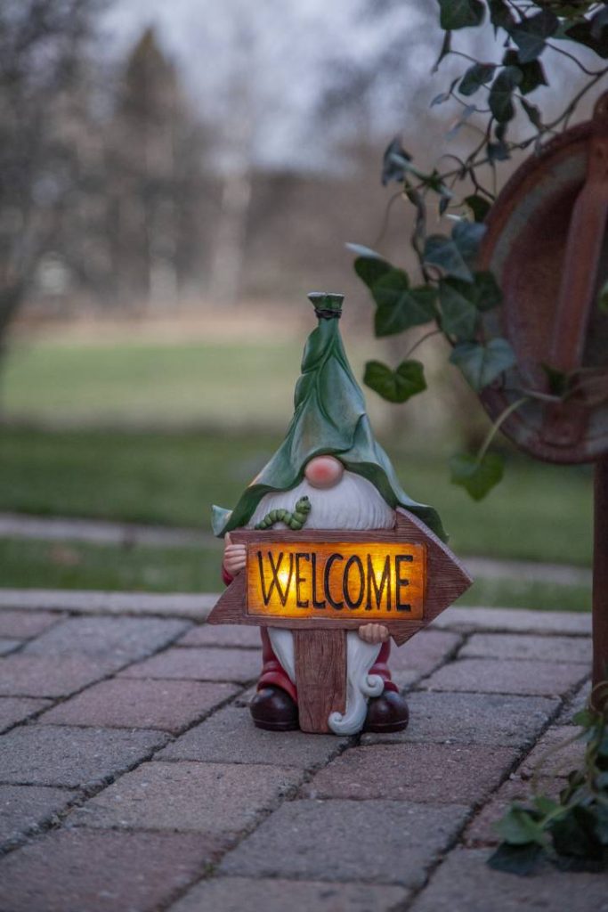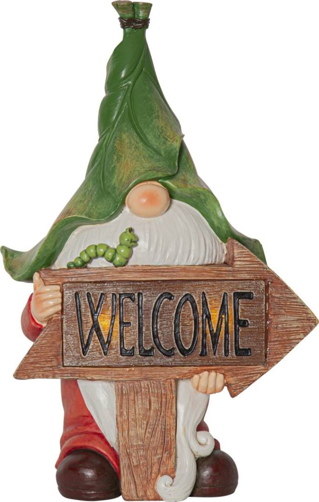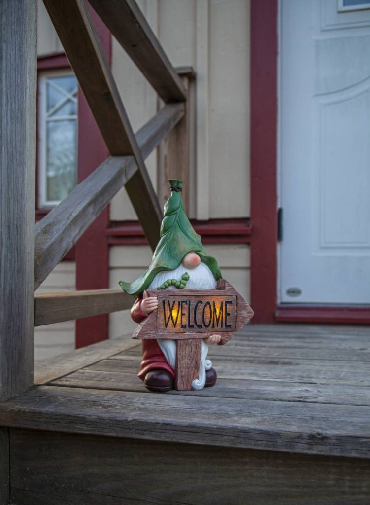 Värikäs polyresiinistä valmistettu puutarhatonttukoriste, jossa on monia yksityiskohtia. Tonttu pitelee ’Welcome’-kylttiä, jossa hämärään aikaan loistaa lämpimän valkoista valoa. Koriste on helppo sijoittaa puutarhaan, terassille tai parvekkeelle.