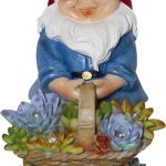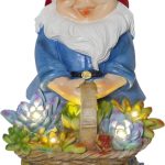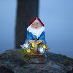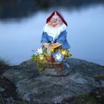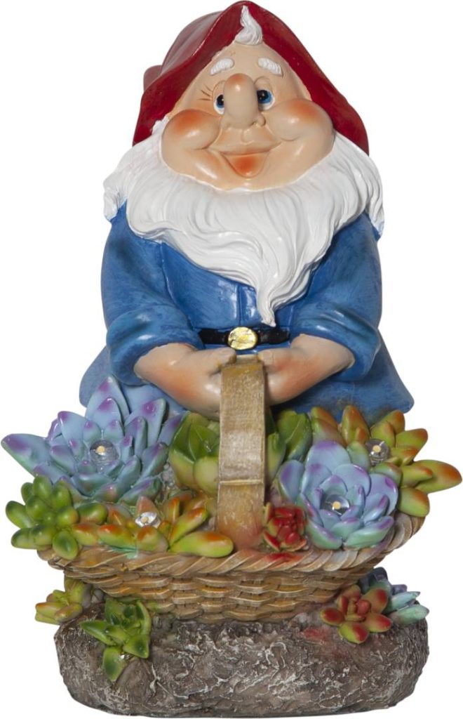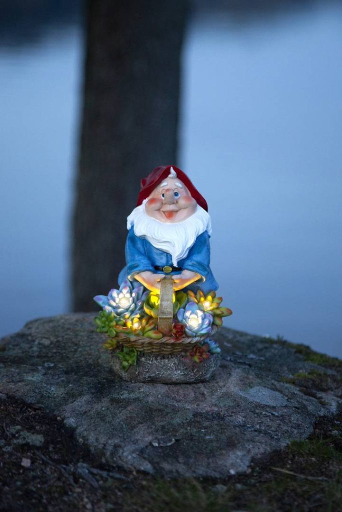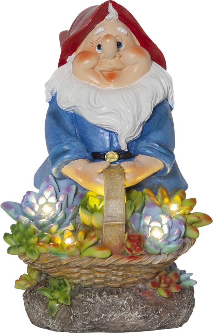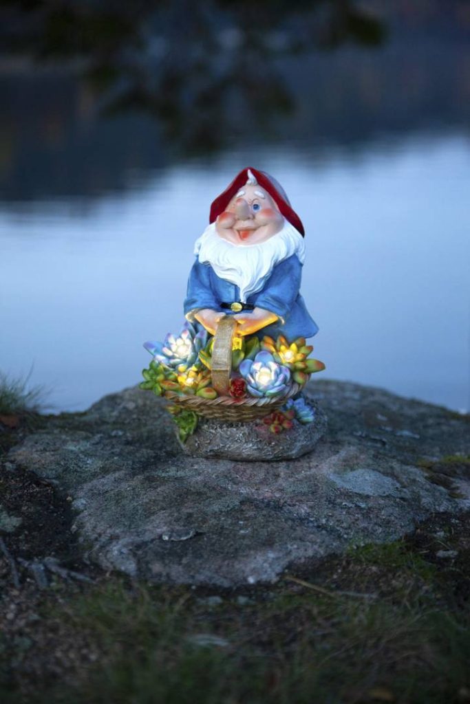 Aurinkokennolla toimiva puutarhatonttukoriste. Tonttu pitää käsissään kukkakoria, jossa lamput hämärään aikaan valaisevat lämpimän valkoisella valolla.