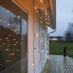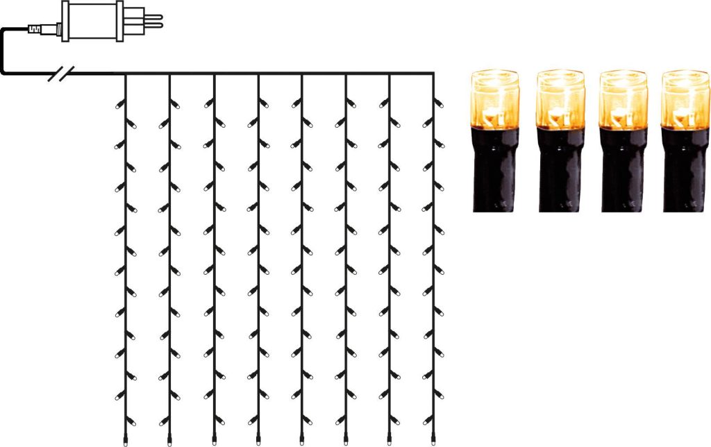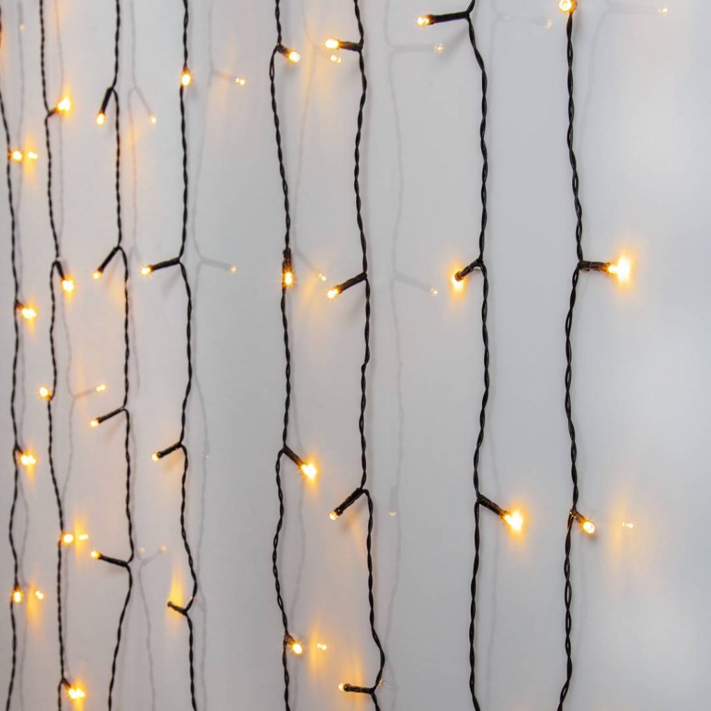 Ulkokäyttöön sopiva valoverho, jossa on mustassa kaapelissa 80 lämpimän valkoista, kultaan vivahtavaa LED-valoa.
