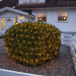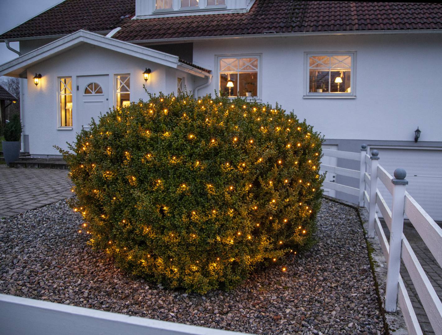 Ulkokäyttöön sopiva valoverkko, jossa on mustassa kaapelissa 160 lämpimän valkoista, kultaan vivahtavaa LED-valoa.