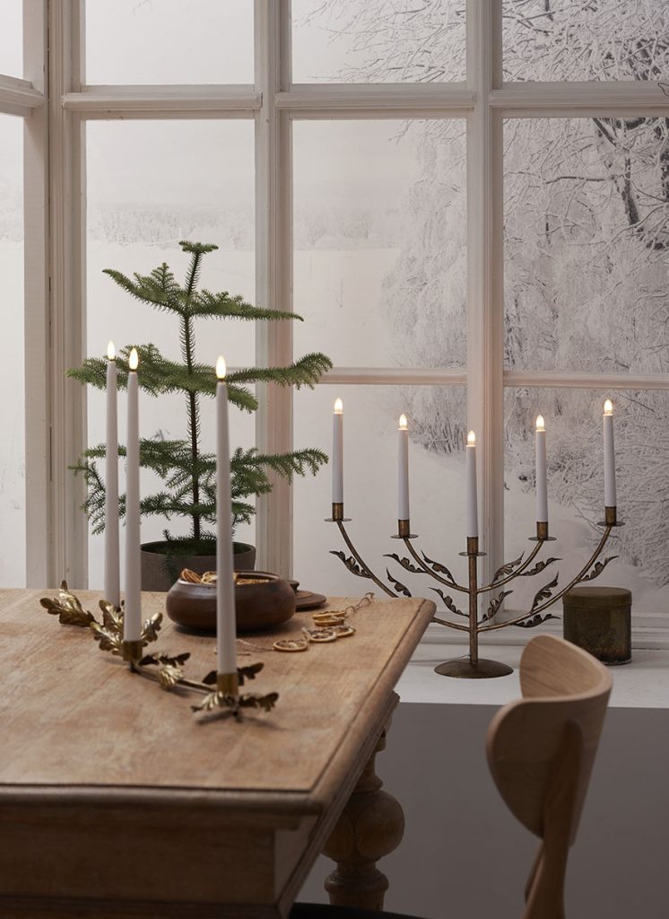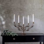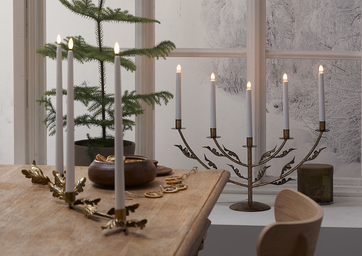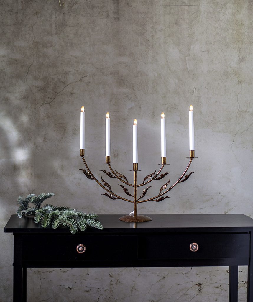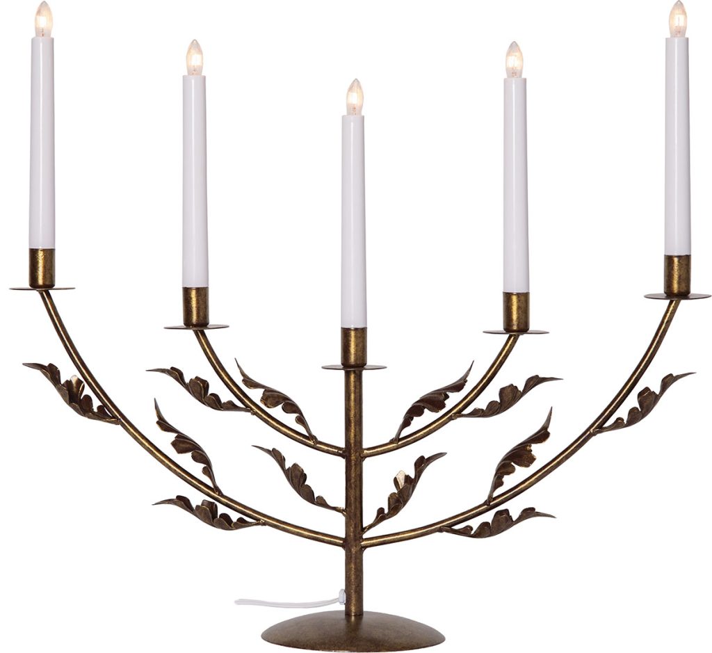 Antiikkimessingin värinen elegantti metallikynttelikkö, jossa on koristeena metalliset tammenlehvät. Tämä tuleva klassikko on uniikki kynttelikkö, joka luo kauniin tunnelmallista valoa syksy- ja talviajan hämärään.