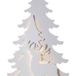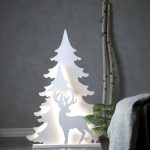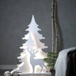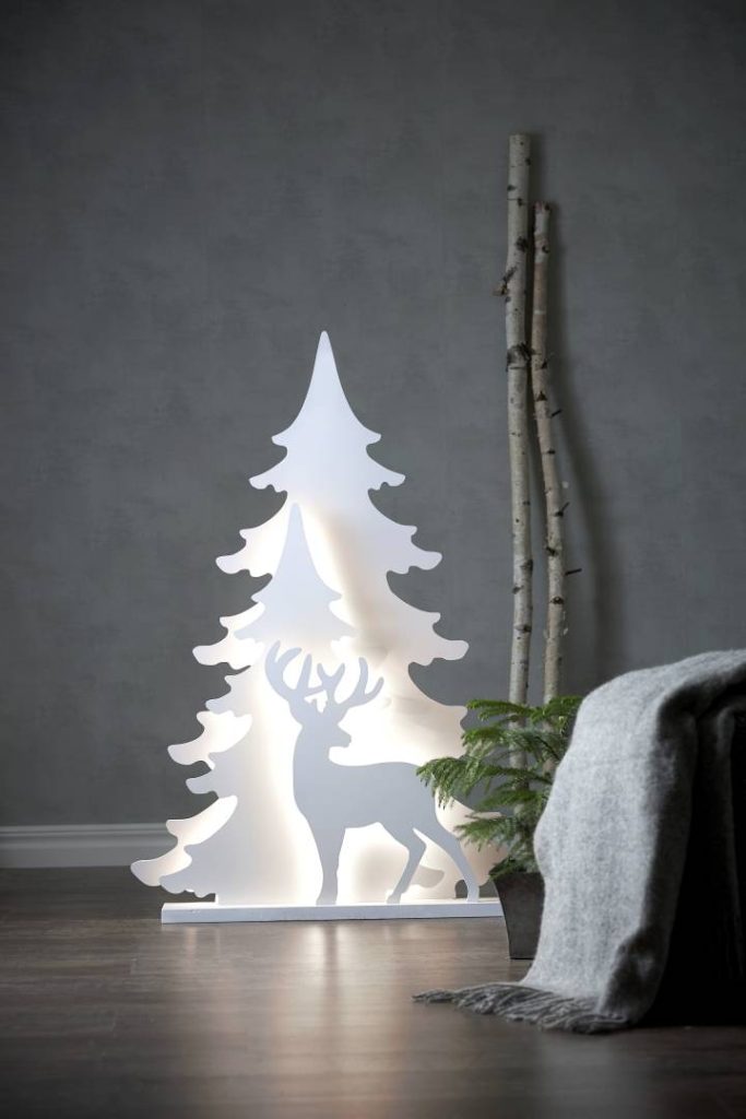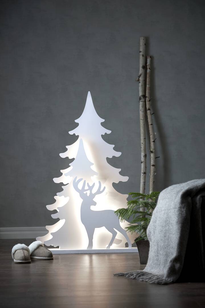 Kirkkaanvalkoinen 110 cm korkea siluetti, jossa on kaksi kuusta ja kauris. Siluettien välissä loistavat valkoiset LED-valot.