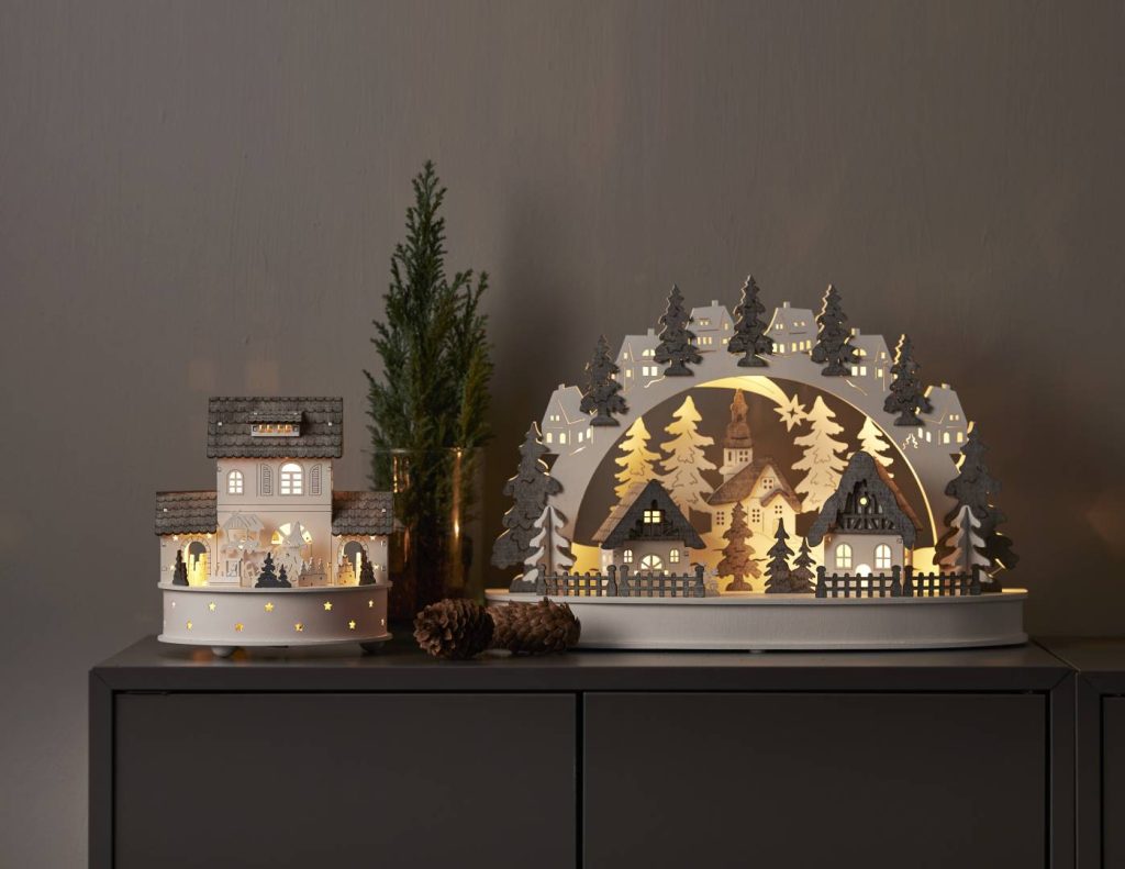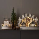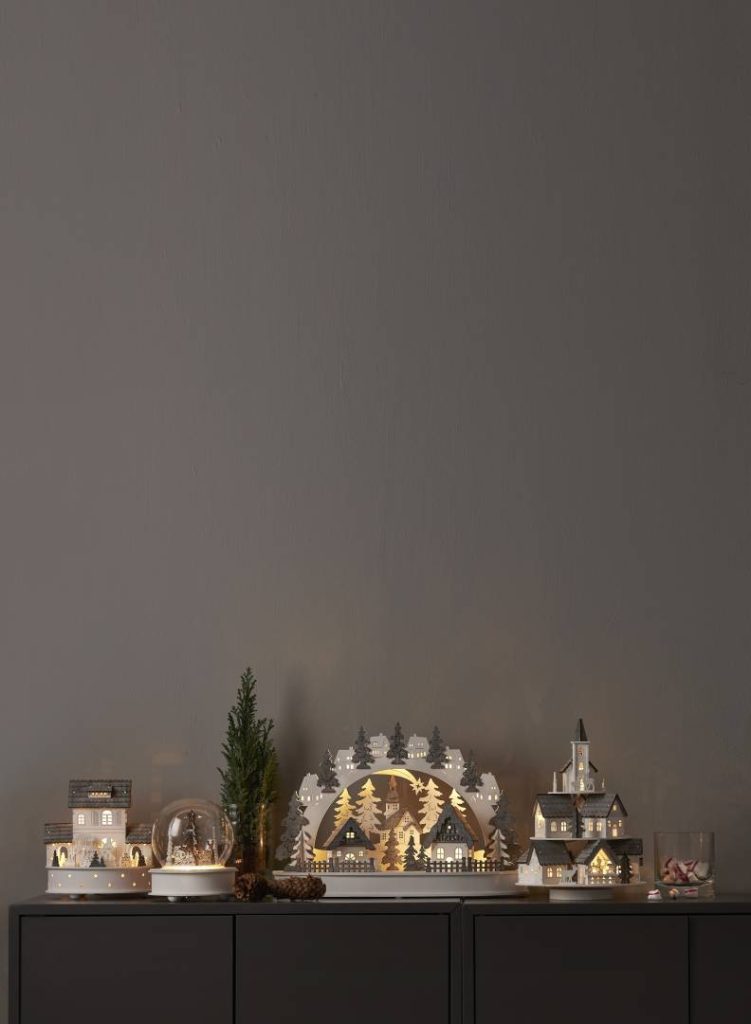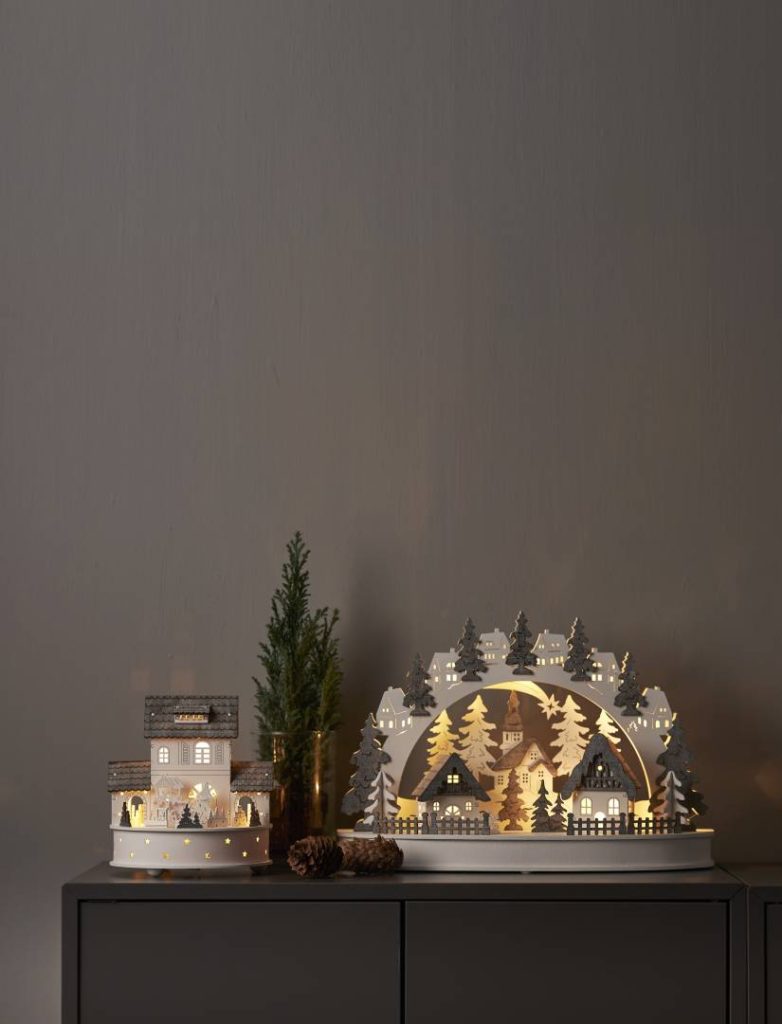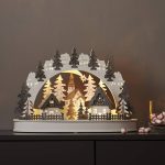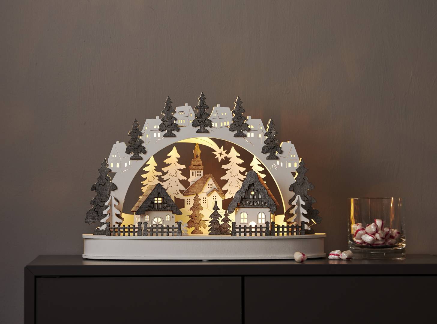 Puinen, paristokäyttöinen kynttelikkö, jossa paljon laserleikattuja yksityiskohtia. Sisäkäyttöön.